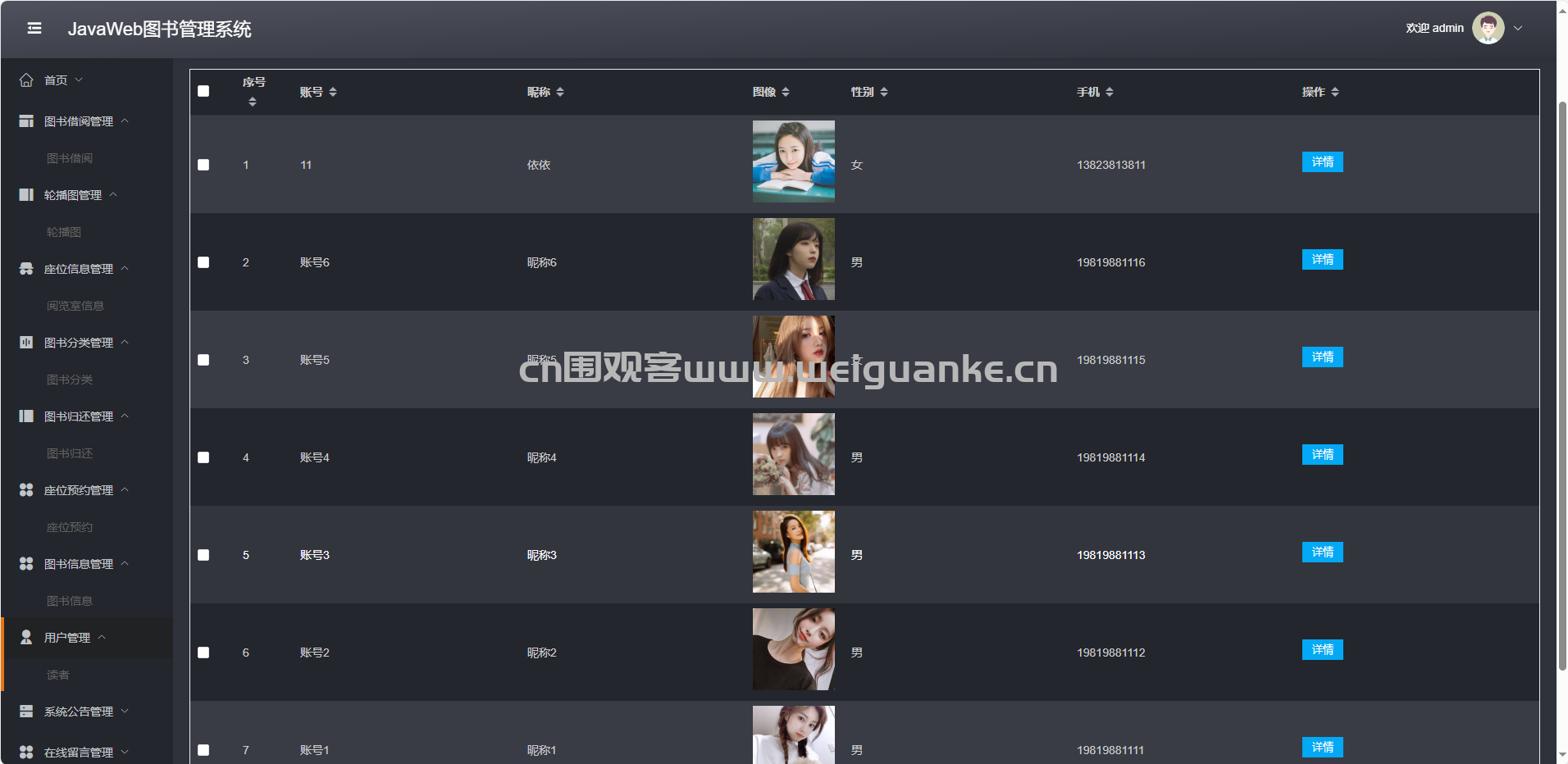 用户管理:增删改查读者账号,启用/禁用。