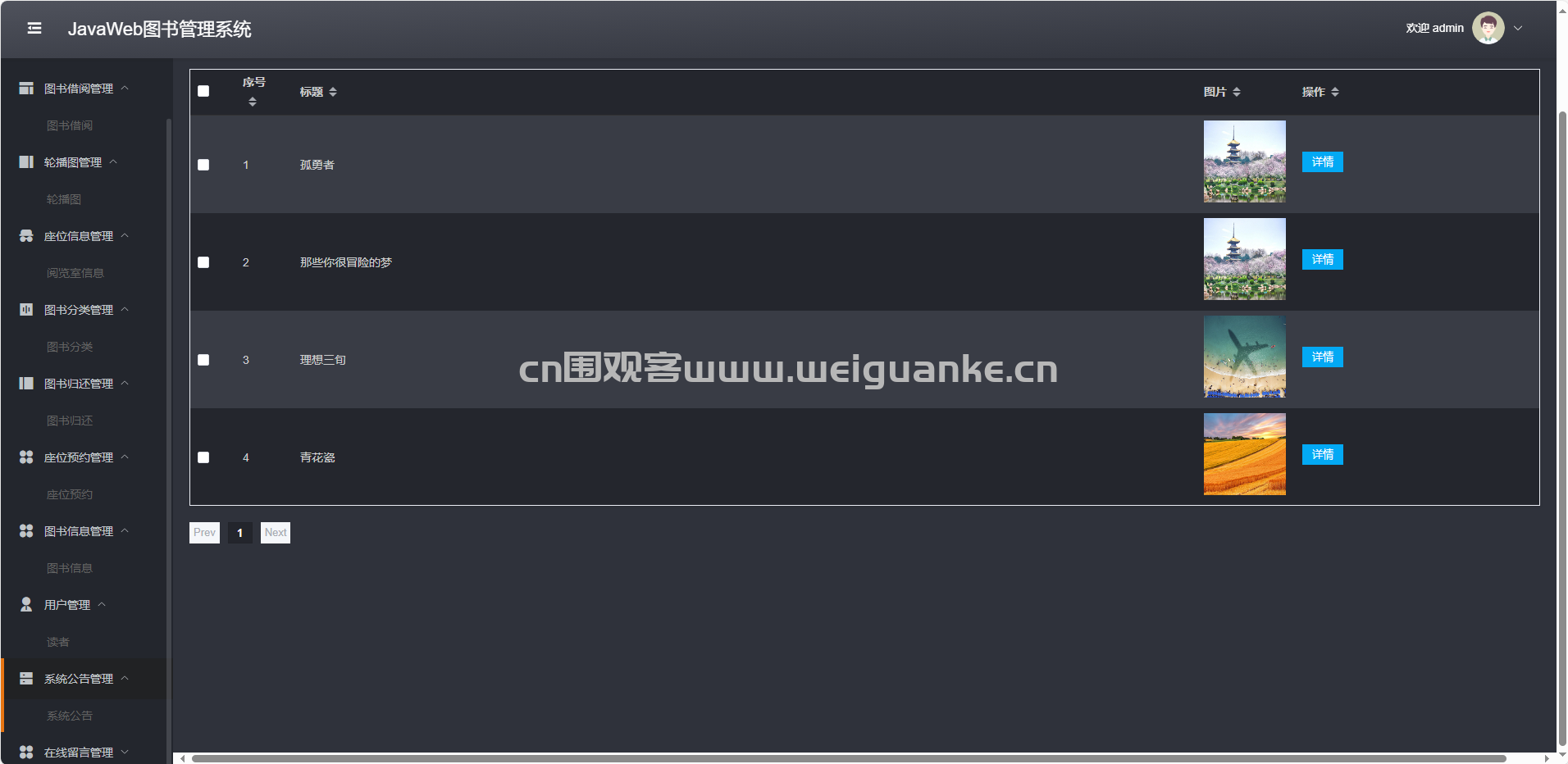 系统公告管理:发布、修改、删除、查询公告。