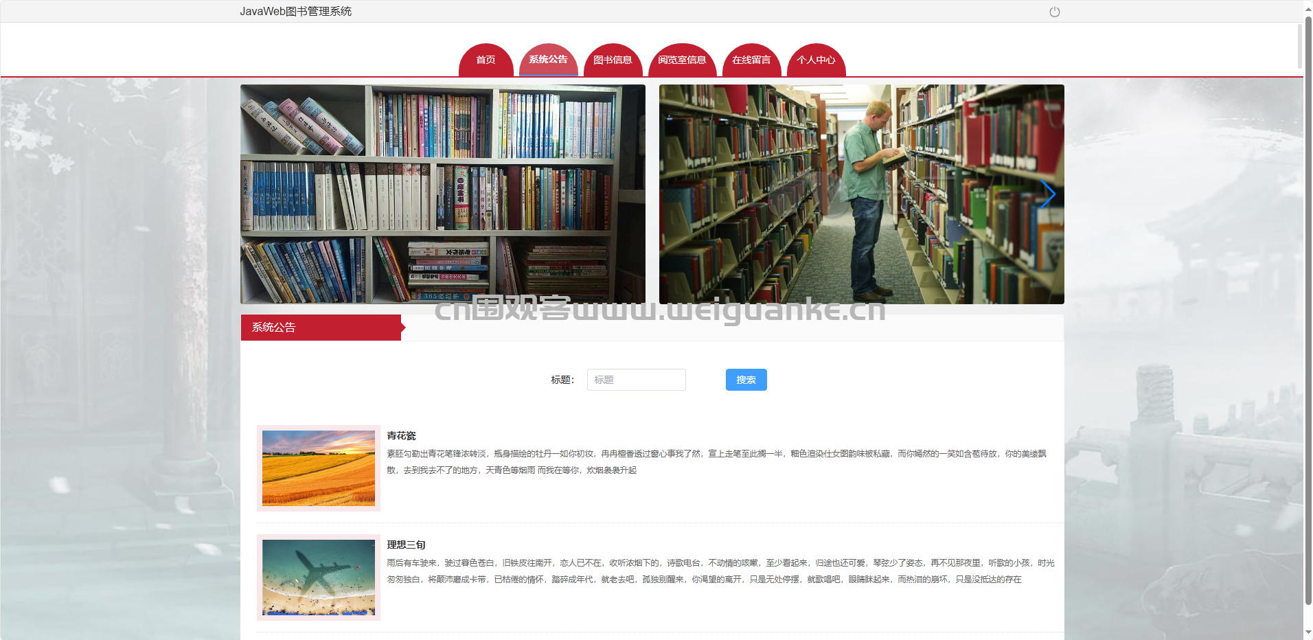 系统公告:浏览、搜索图书馆通知。