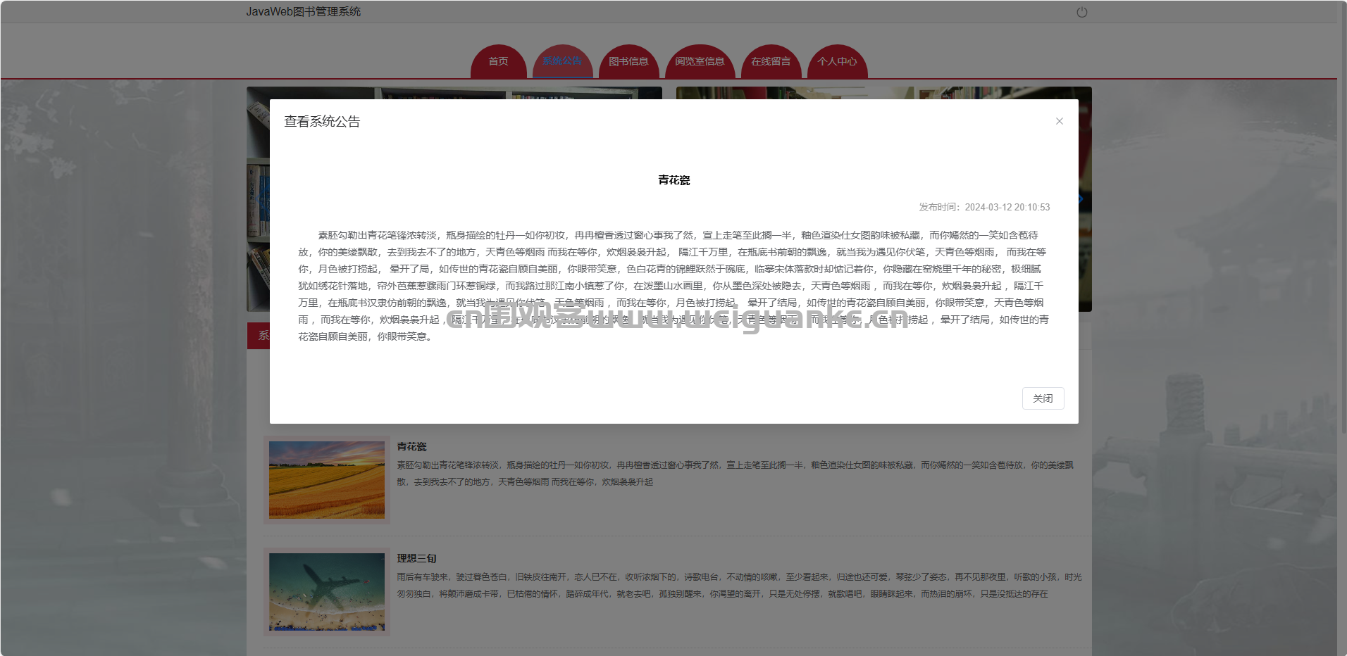 SpringBoot+Vue图书管理系统,读者前端查书、借还、预约座位、在线留言,后台统一管理图书、座位、借阅、公告与留言,实现图书馆全流程数字化服务。