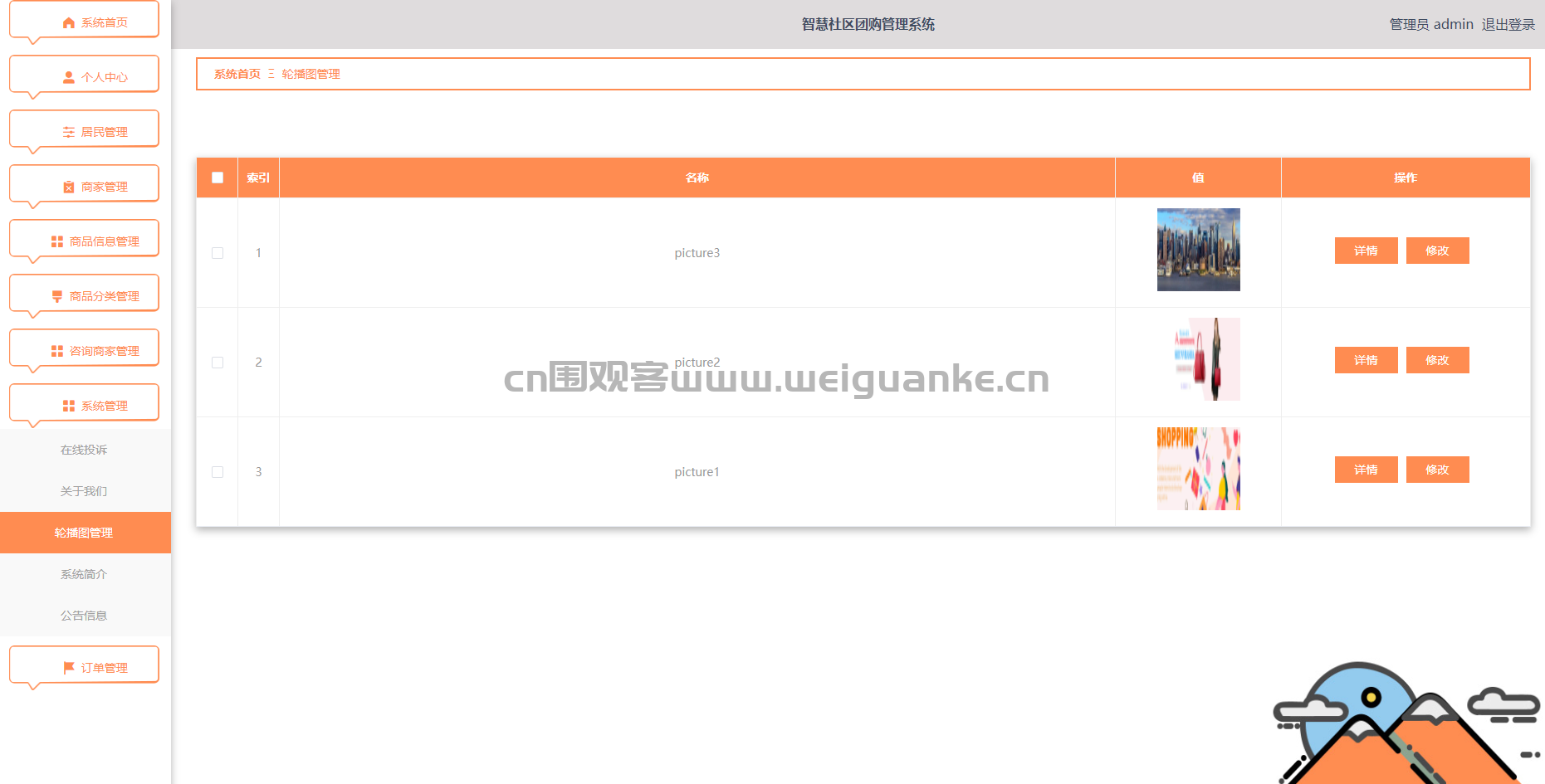 – 轮播图管理:设置首页轮播图,支持上传、排序、启用/禁用。