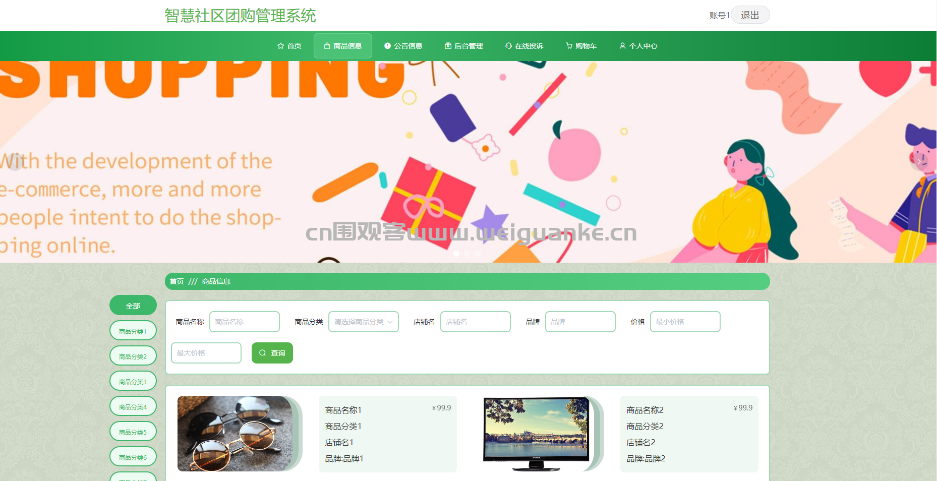 – 浏览所有商品,支持按分类、关键词搜索商品,查看商品详情、价格、库存、评价等信息。