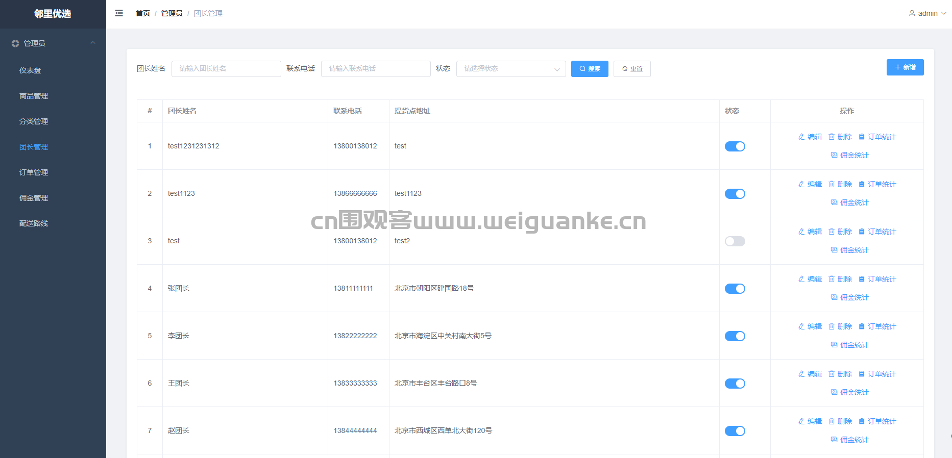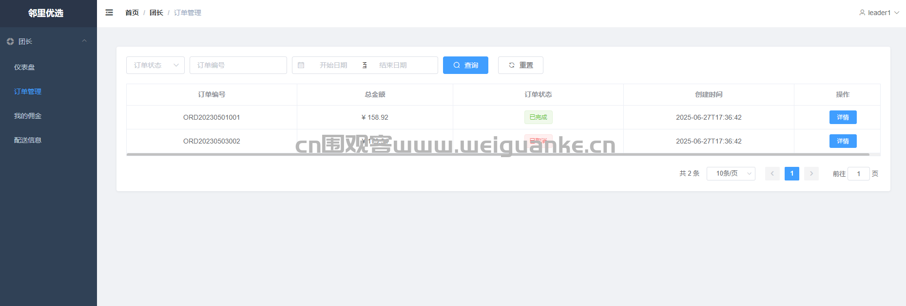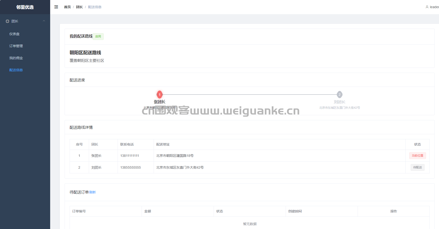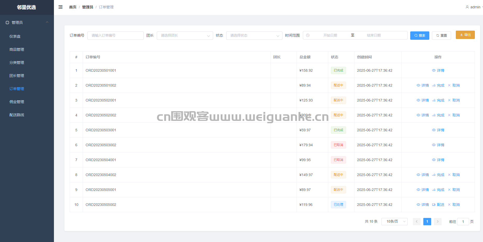 订单管理 管理自己团点下的订单:查看买家信息、配送地址、订单状态,支持确认收货、发起退款。
