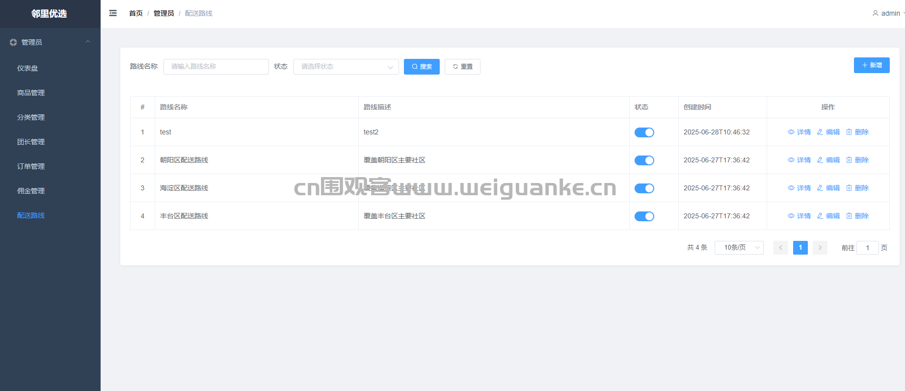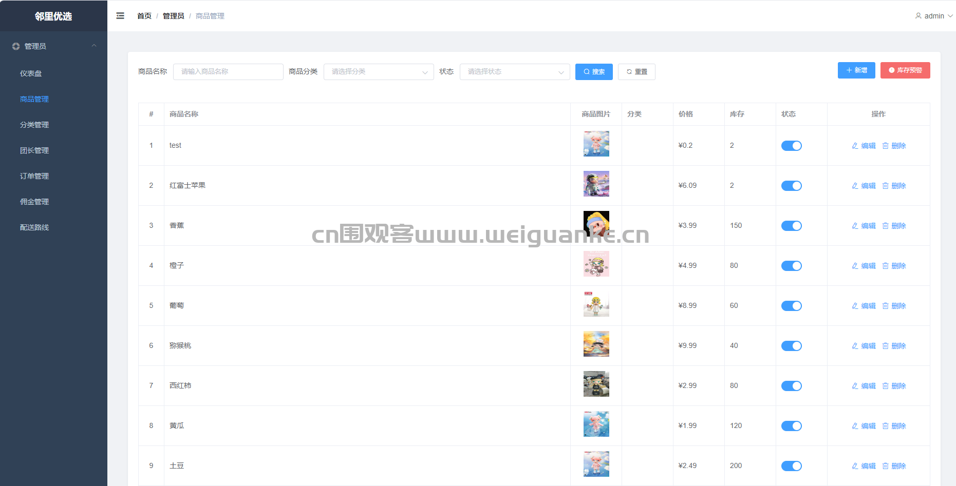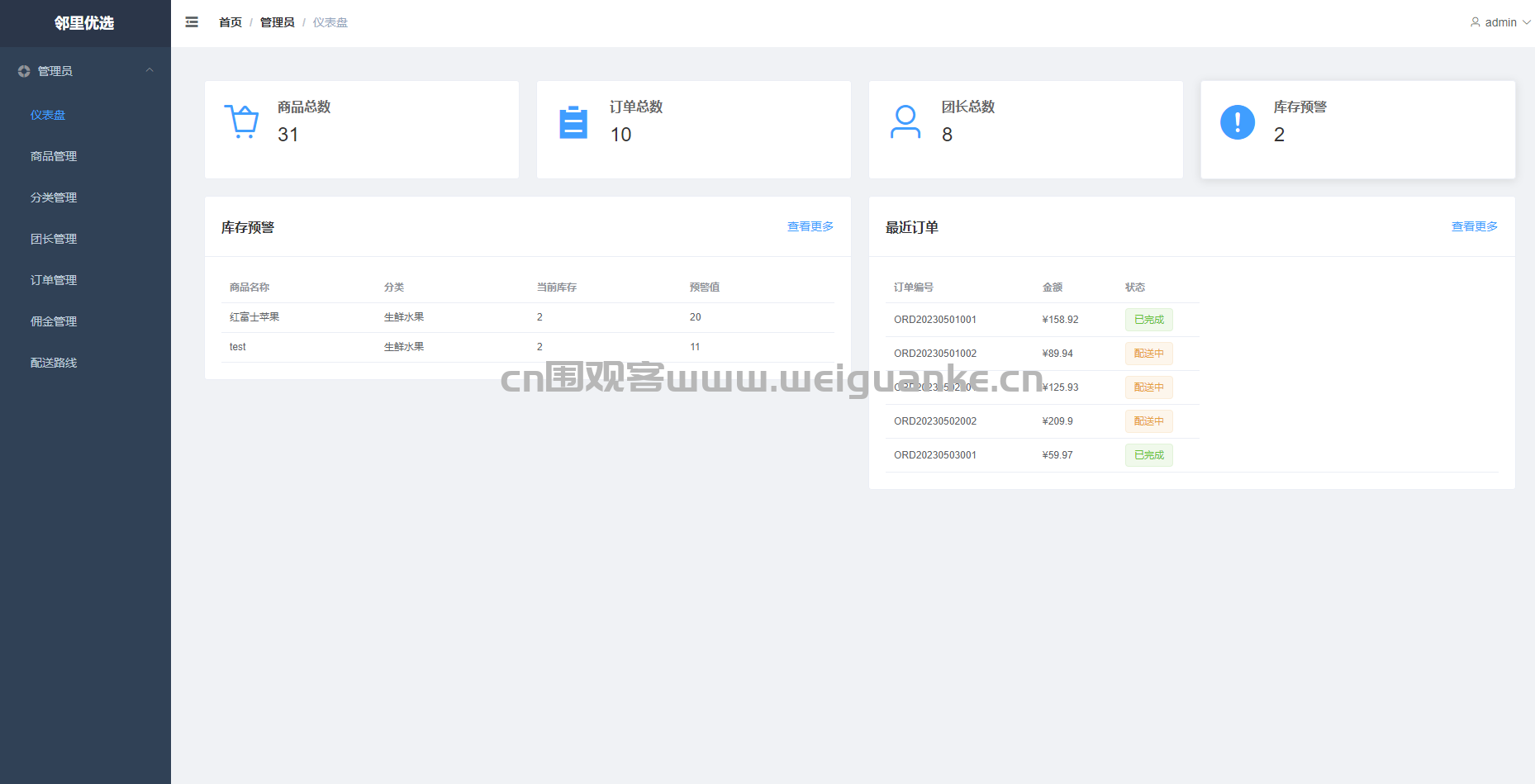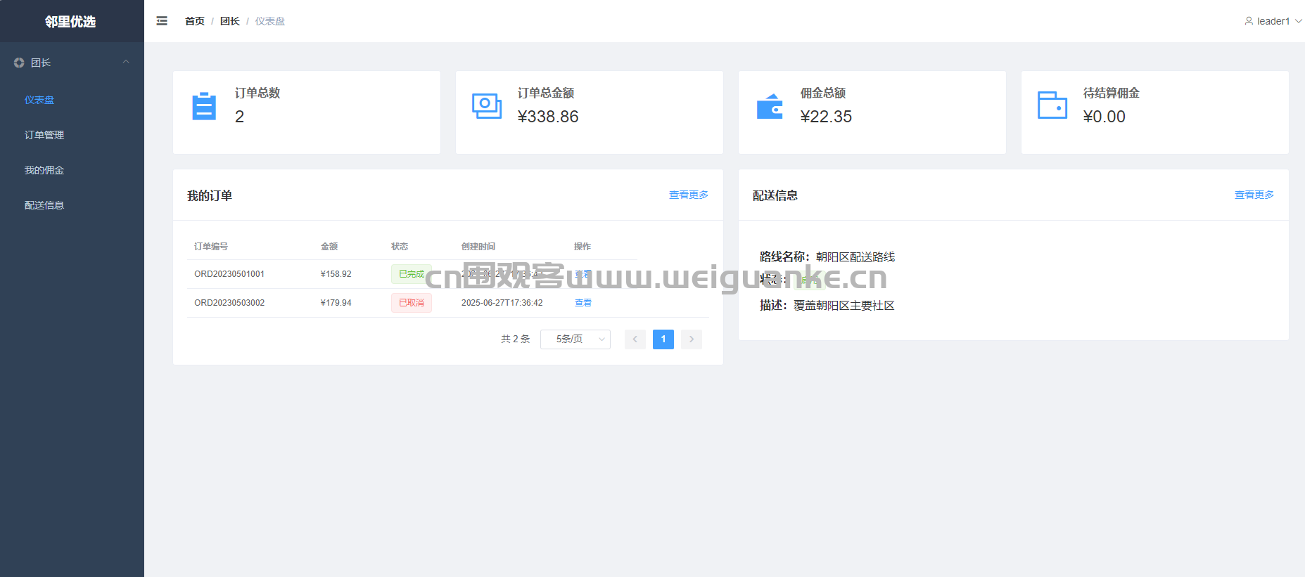 订单管理 管理自己团点下的订单:查看买家信息、配送地址、订单状态,支持确认收货、发起退款。