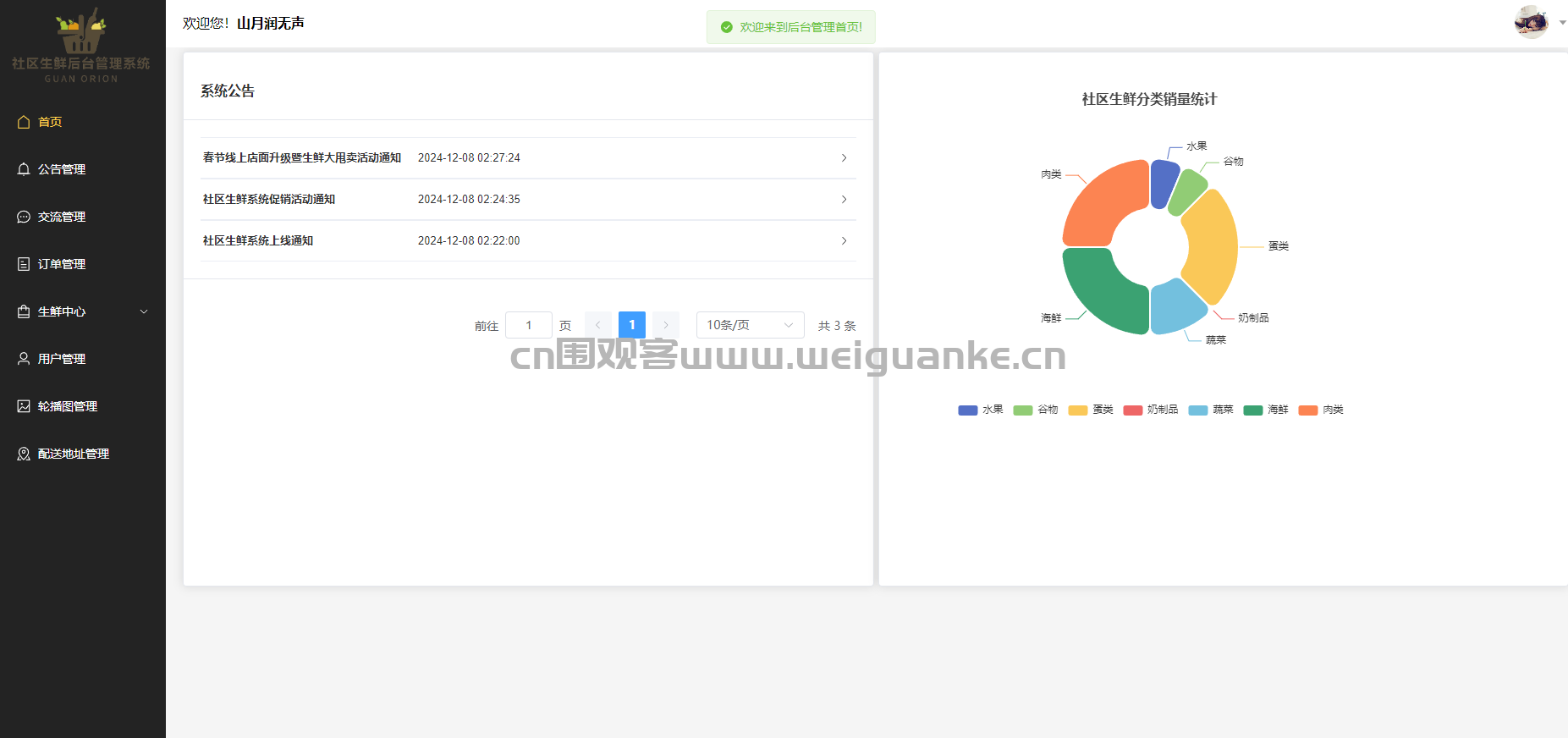 管理员登录后看到的第一个综合仪表盘,可快速查看今日订单、待处理公告、新注册用户数等关键指标。