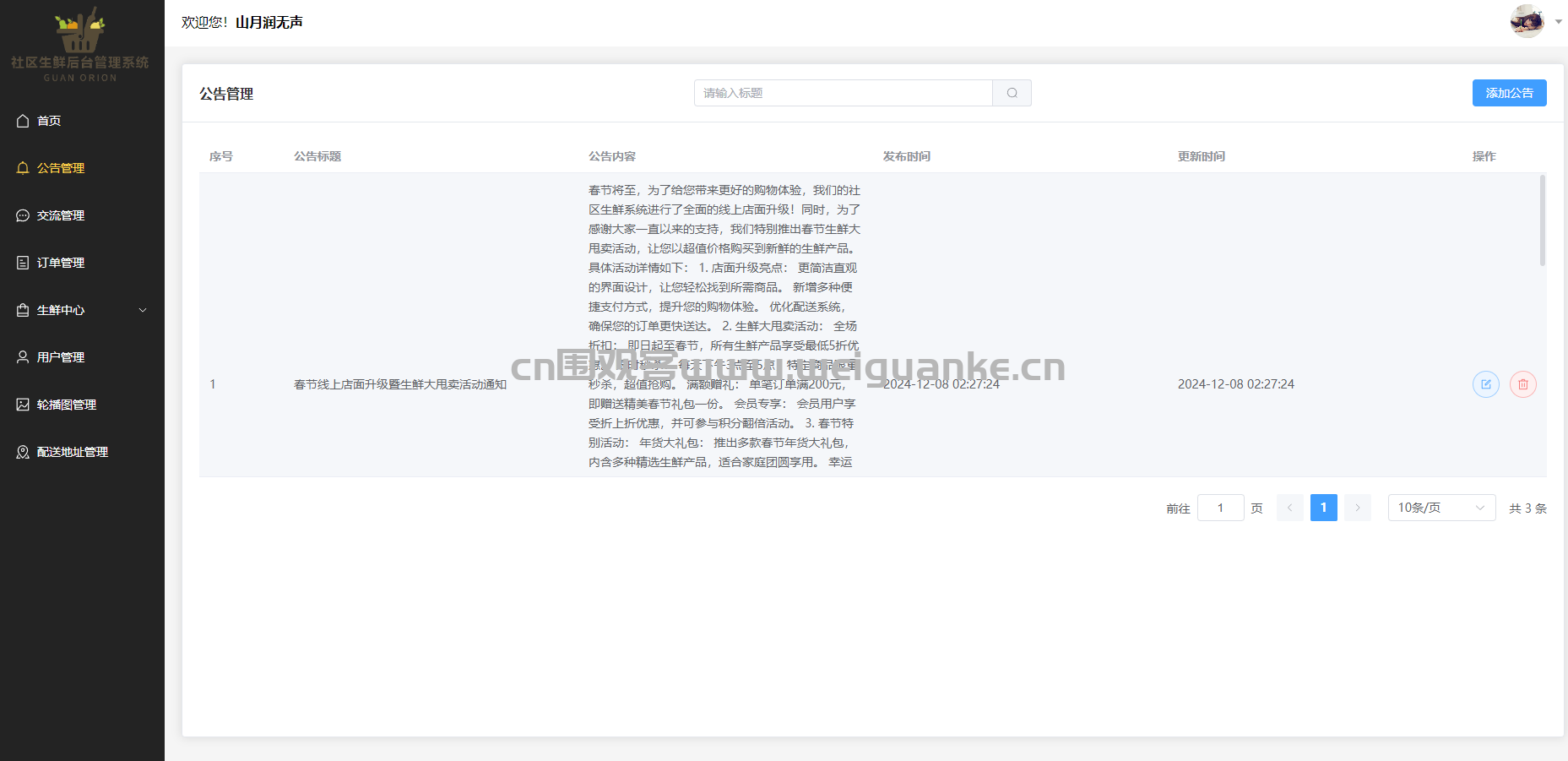 负责新增、编辑、删除、置顶平台公告,控制公告在前端是否可见及展示顺序。
