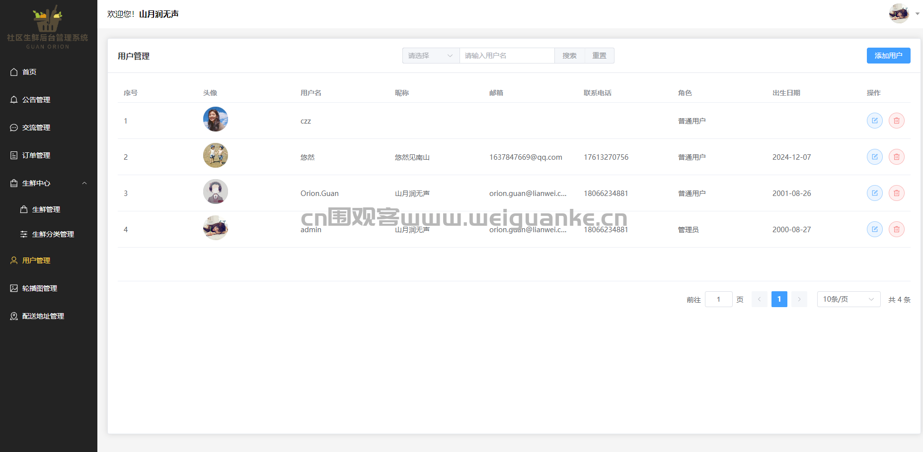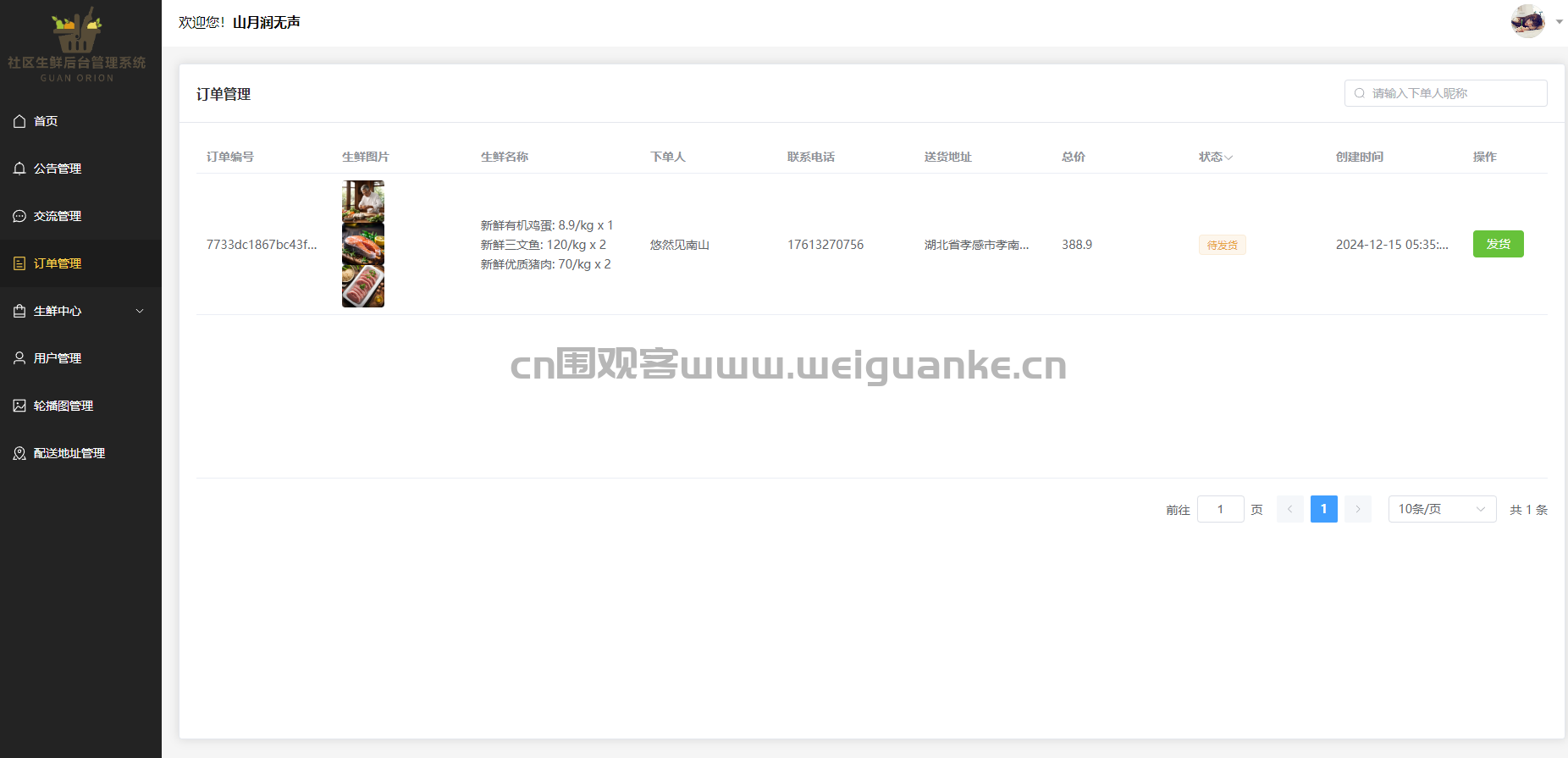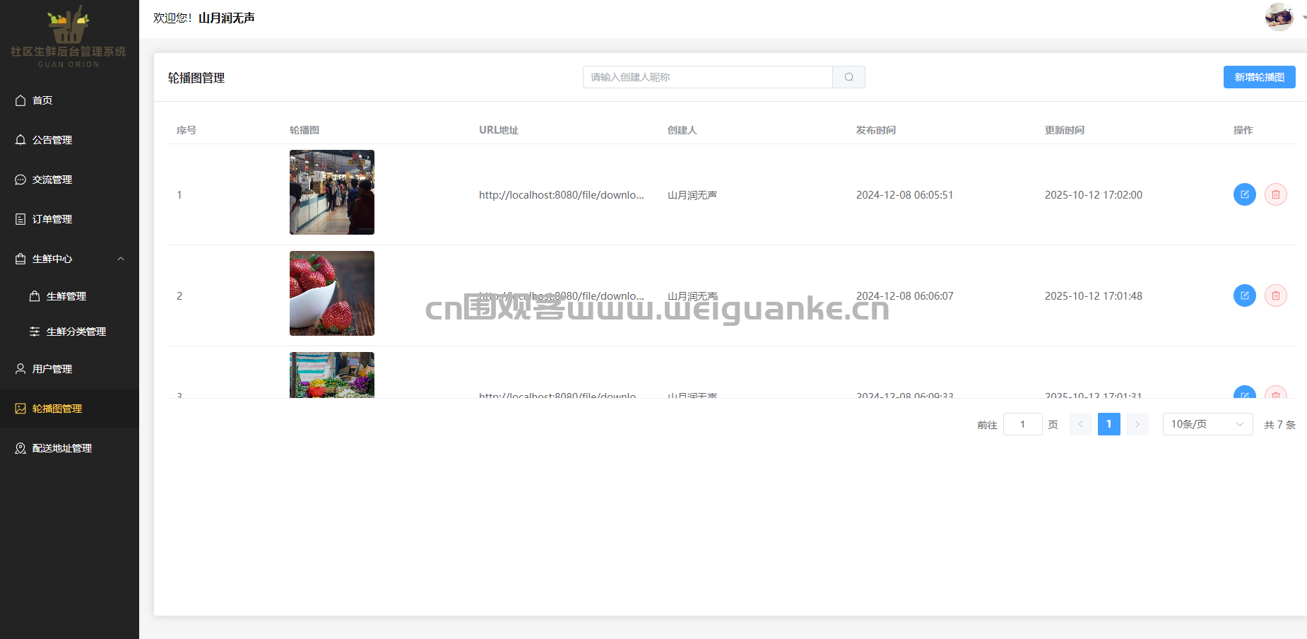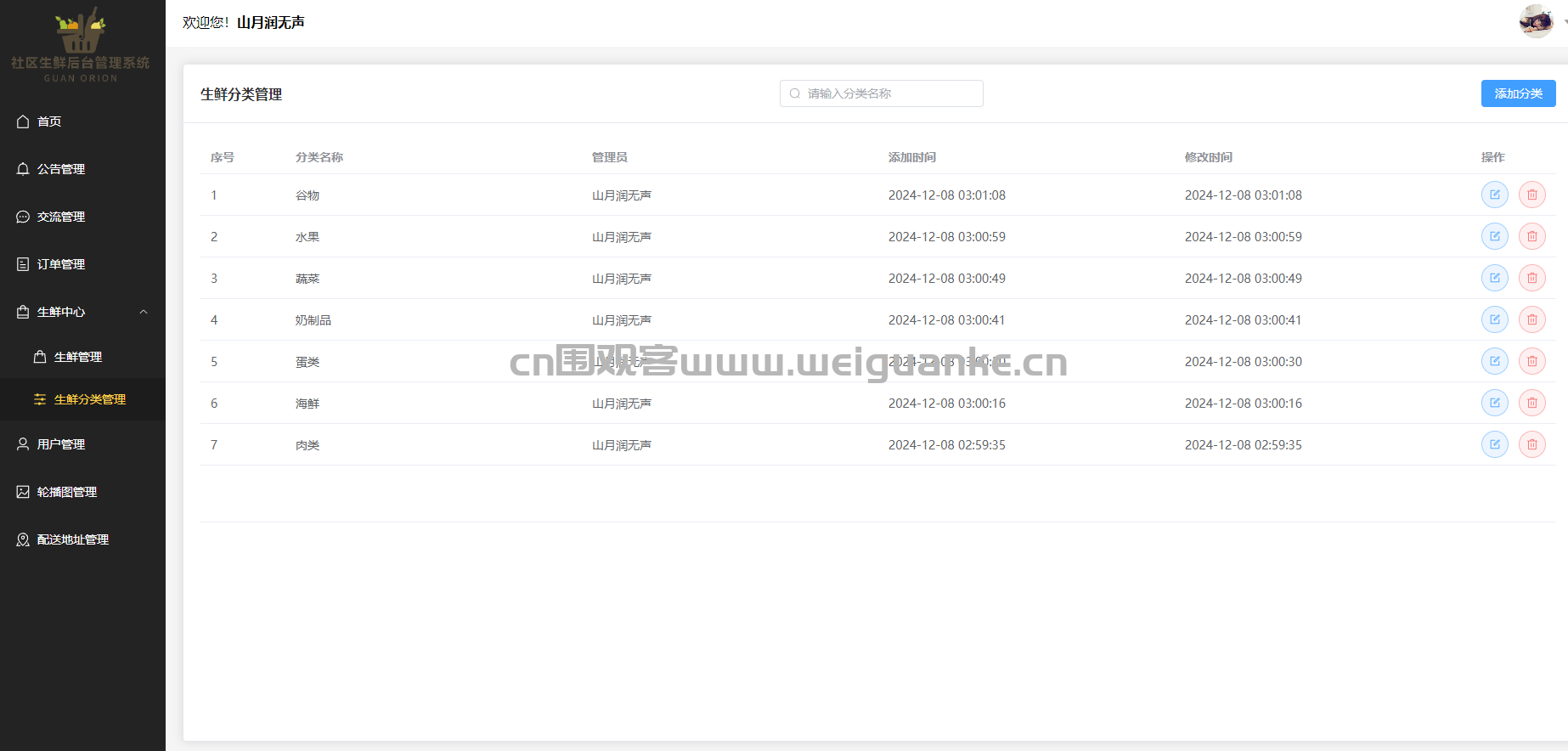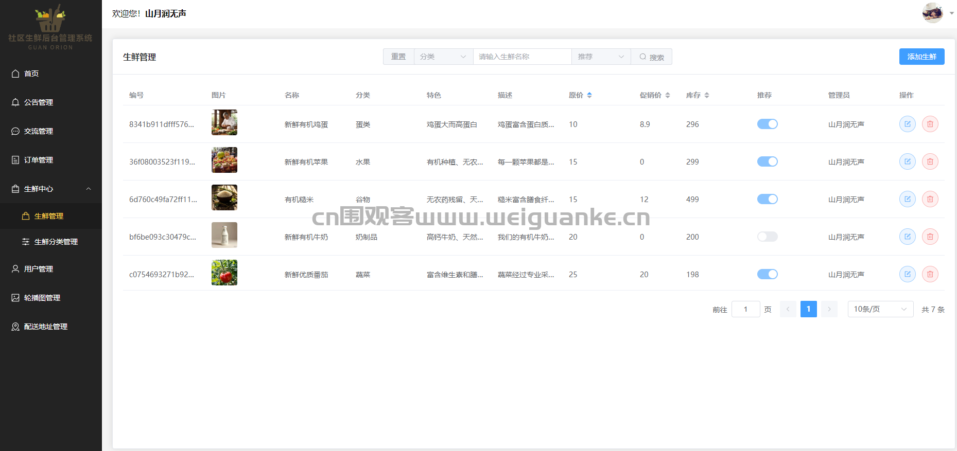 新增、编辑、下架、删除具体生鲜商品;维护价格、库存、图文详情与上下架状态。
