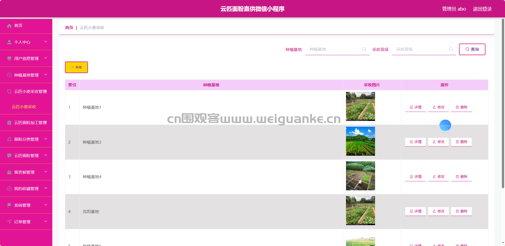 种植基地管理:可视化地图维护麦场信息、土壤报告、农事记录与年度产量预测。