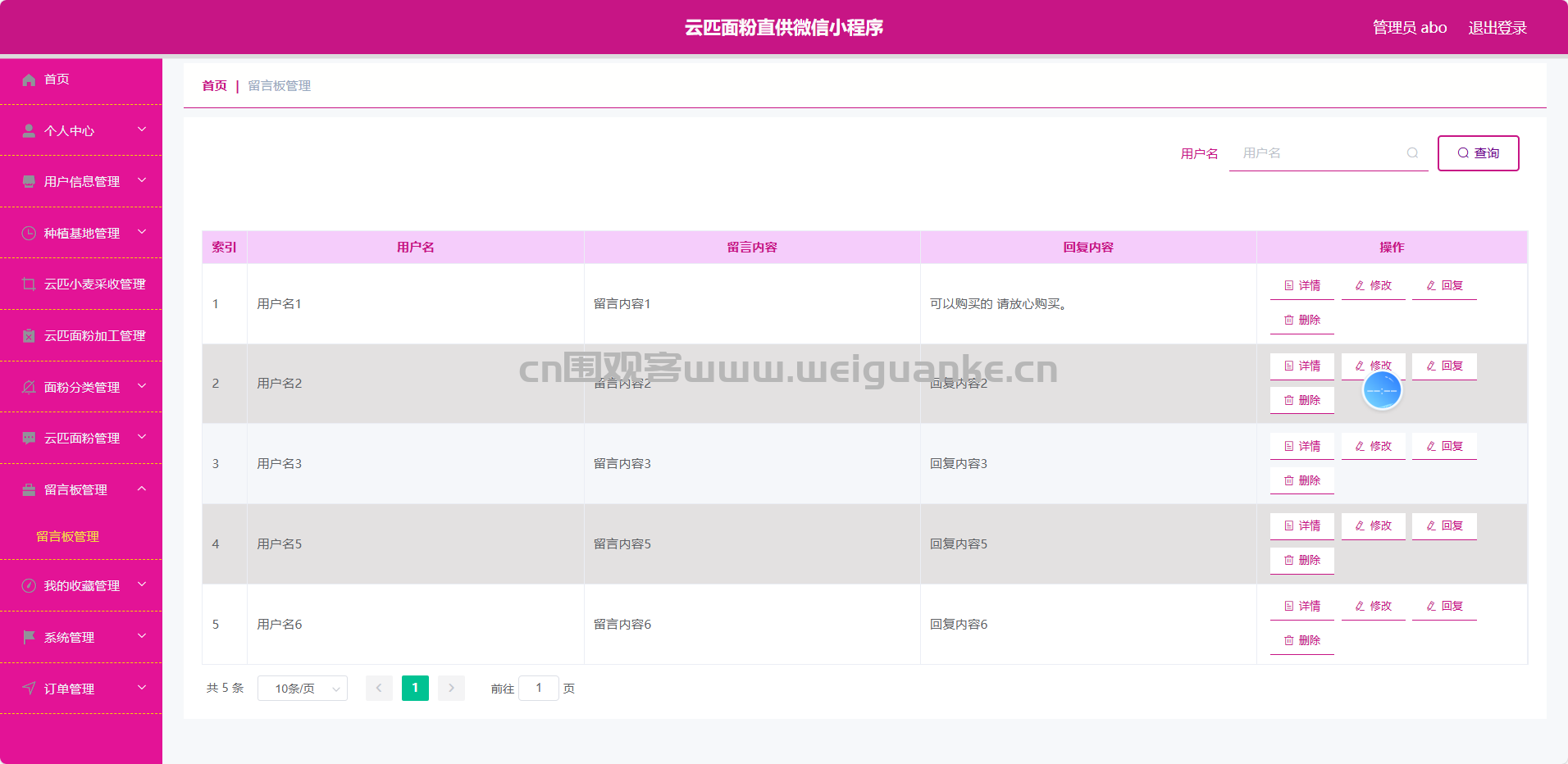 留言板管理:前端用户反馈与投诉的集中池,支持审核、回复、转工单、星级标记。