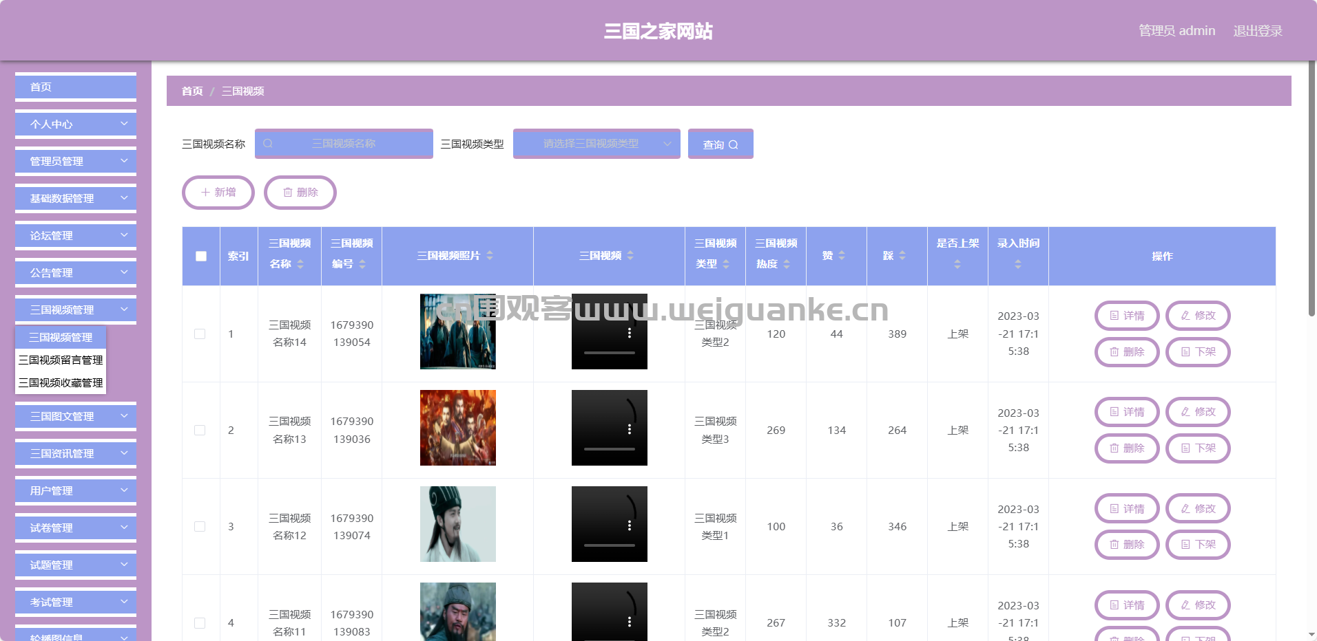 三国视频管理:上传、转码、封面设定与标签分类,打造高质量三国影音资源库。