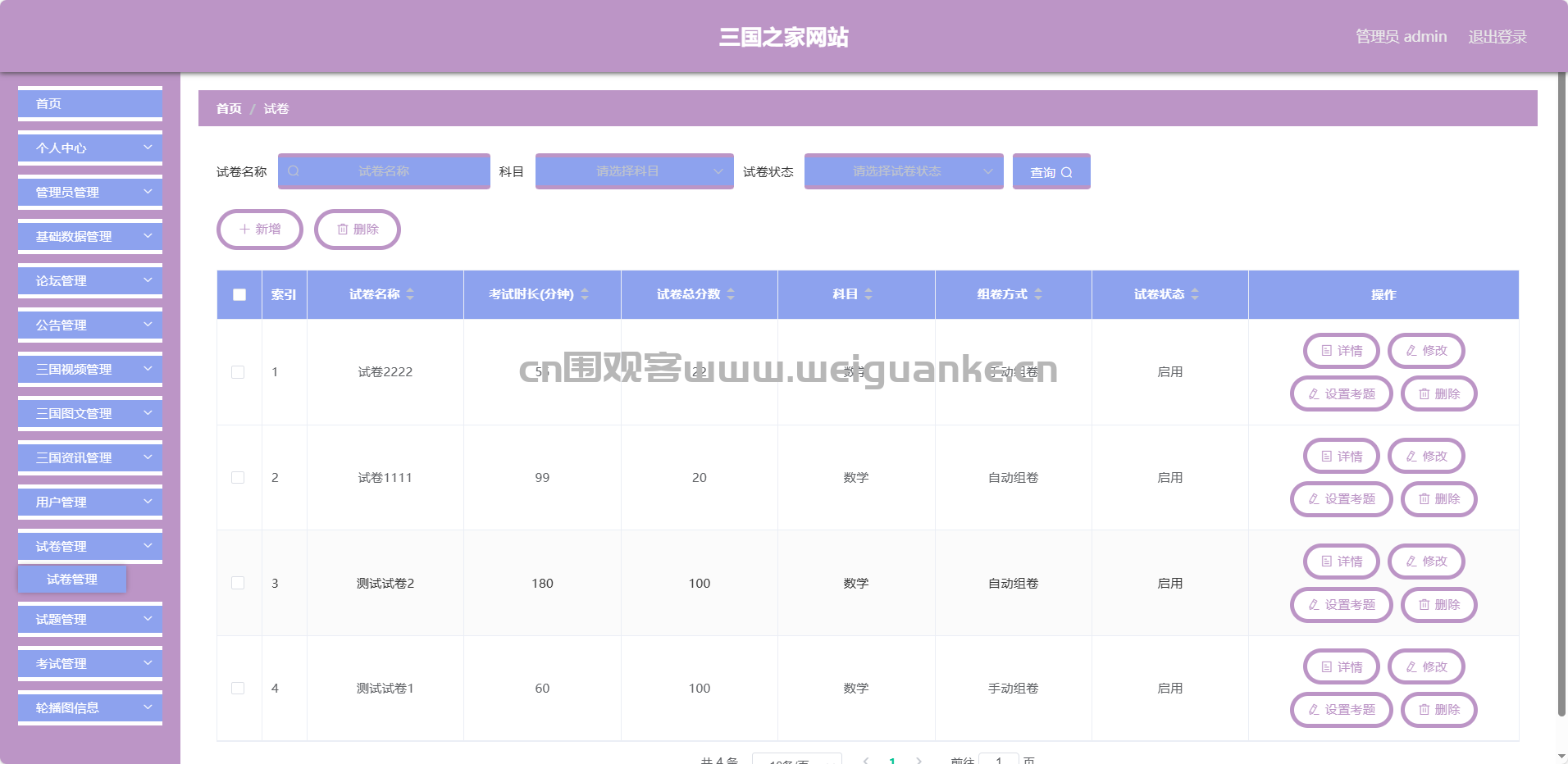 试卷管理:创建、归档与发布考试试卷,支持随机组卷与难度系数设定。