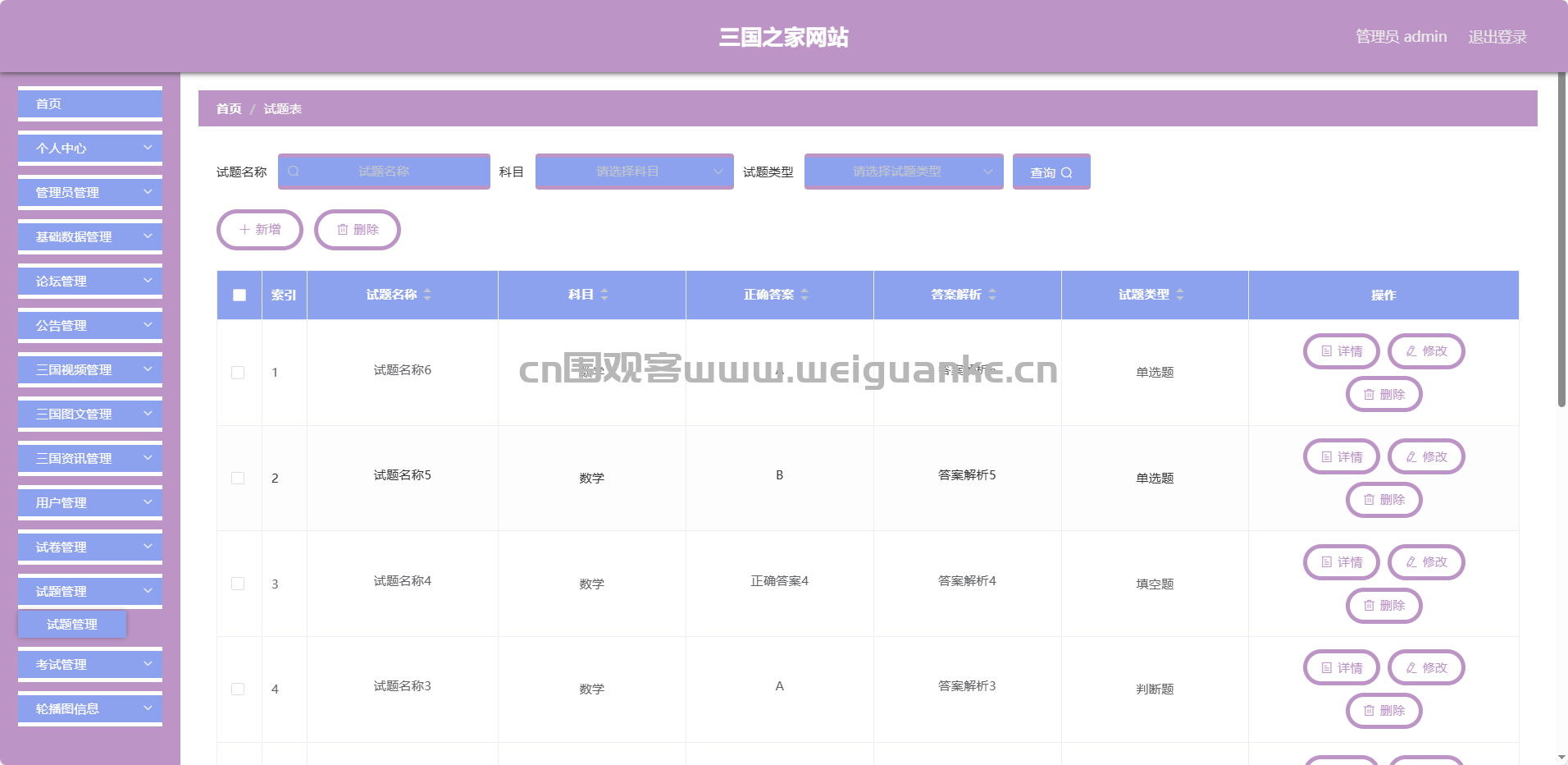 试题管理:单选、多选、判断、填空题统一维护,可批量导入并自动查重。