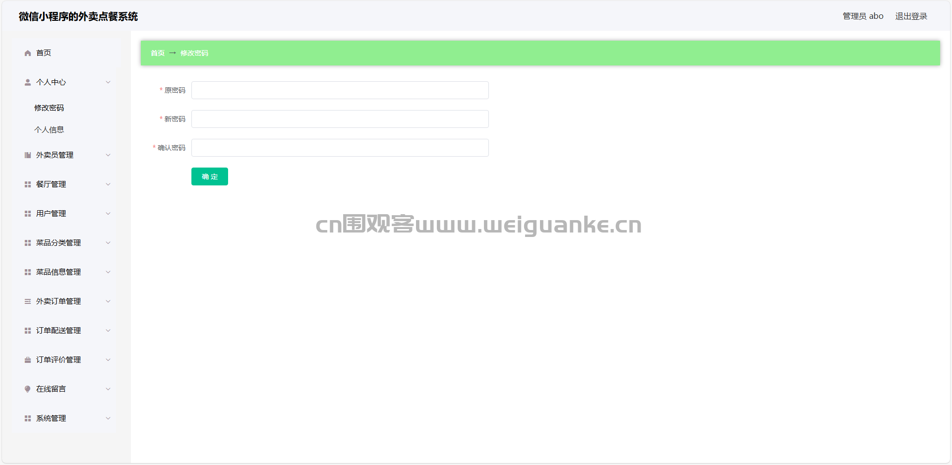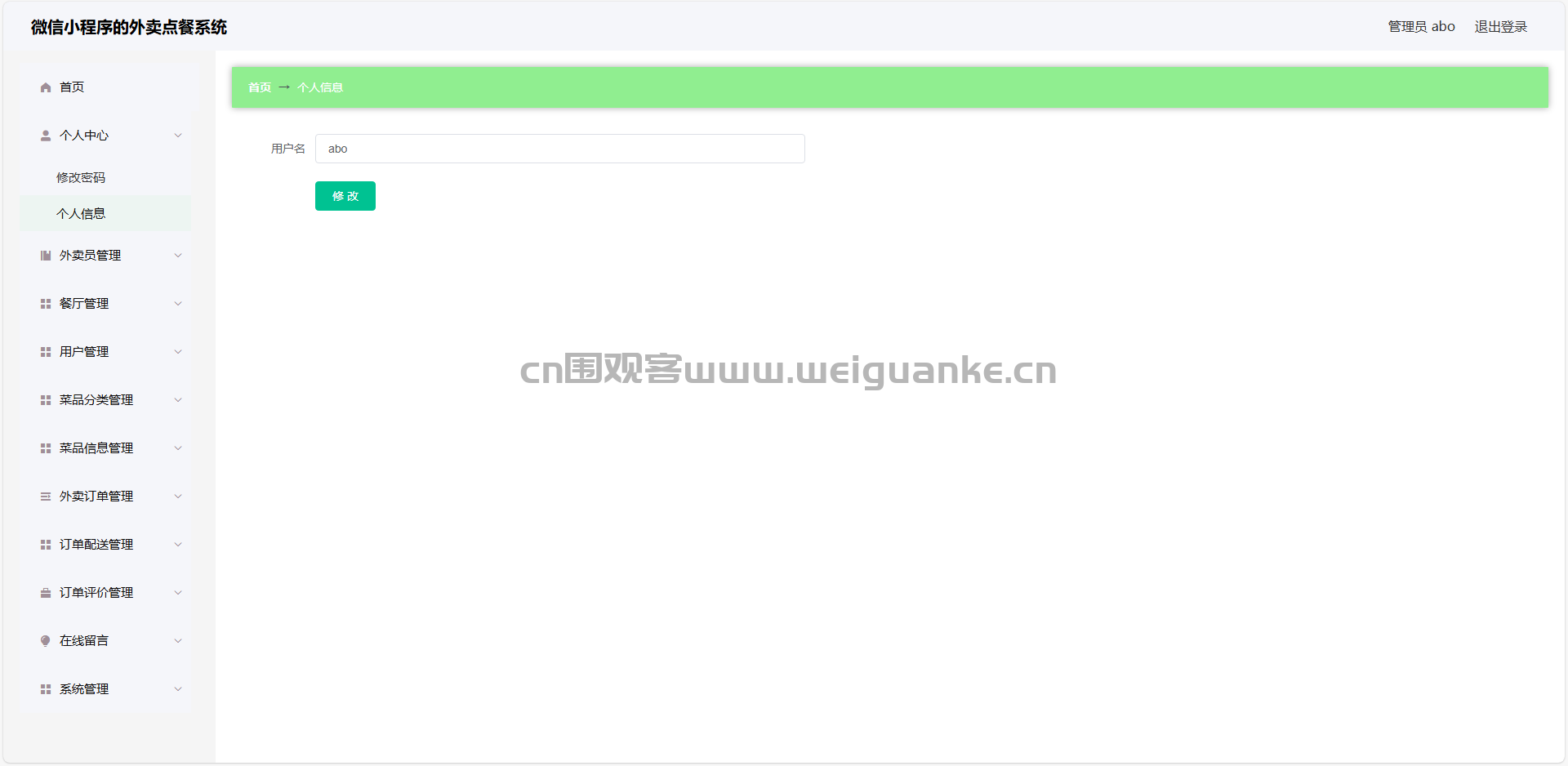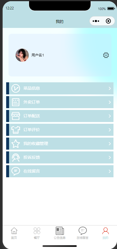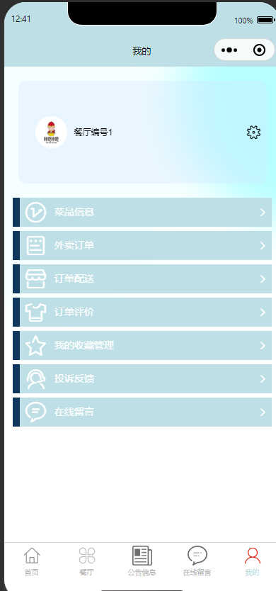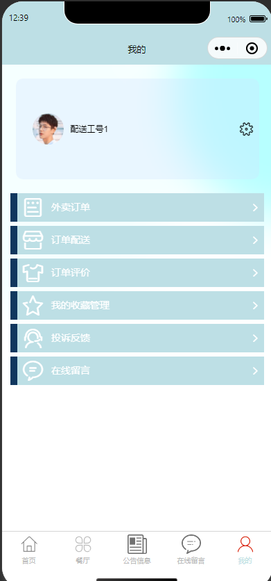 1.个人中心:查看和编辑个人信息,修改登录密码。管理菜品,订单,配送,评价,收藏,投诉信息。