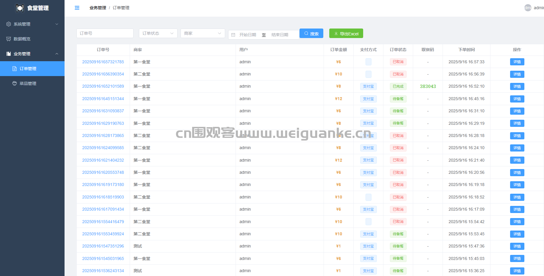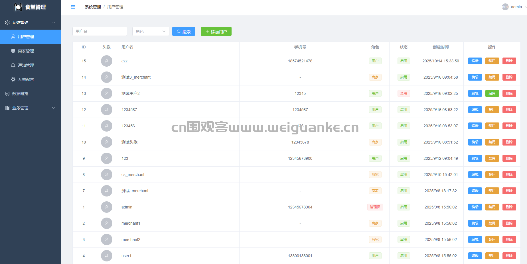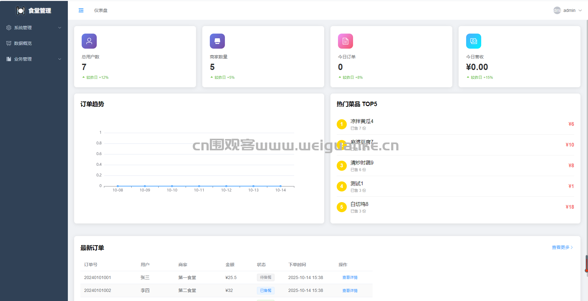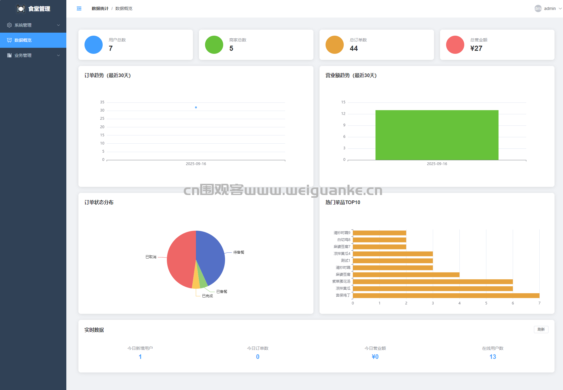 – 概览:提供系统运行的关键指标,如用户总数、商家数量、今日订单数、今日营收等,便于管理员快速了解系统状态。
