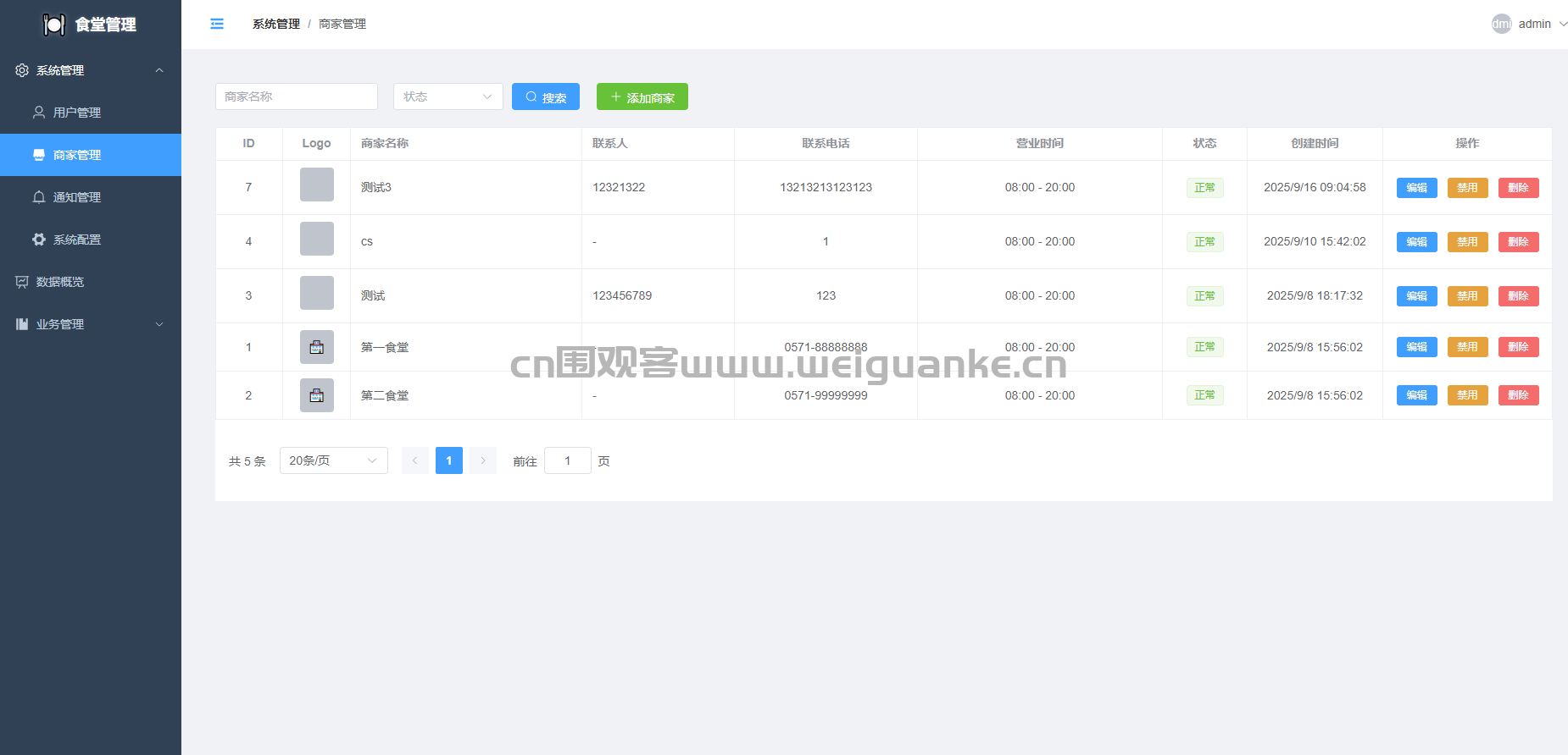 – 商家管理:管理入驻商家信息,包括添加、编辑、删除商家,审核商家资质,设置营业时间。