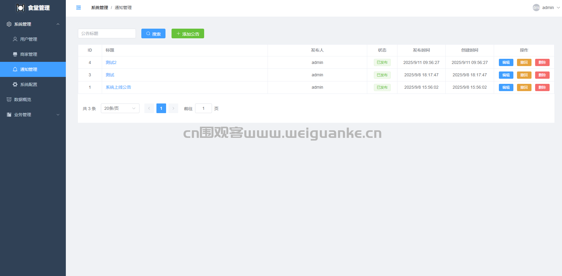 – 通知管理:发布系统公告,管理公告状态,确保用户及时获取重要信息。