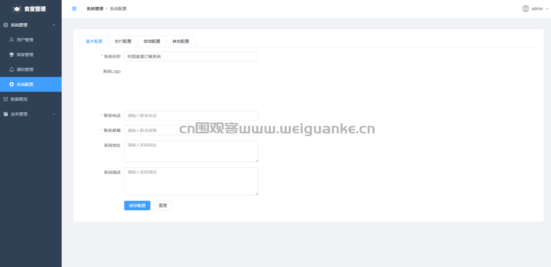 – 系统配置:配置系统基本信息,如系统名称、Logo、联系方式、系统地址等,维护系统正常运行。