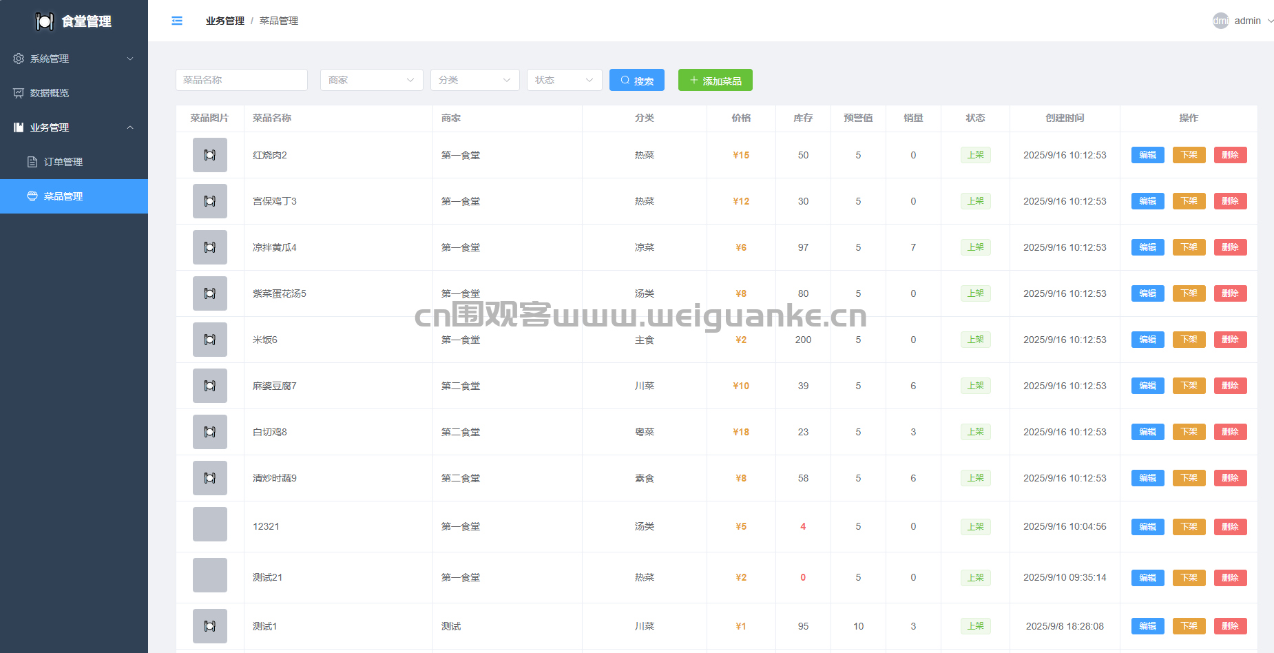 – 菜品管理:管理菜品信息,包括添加、编辑、删除菜品,设置菜品价格、库存等。