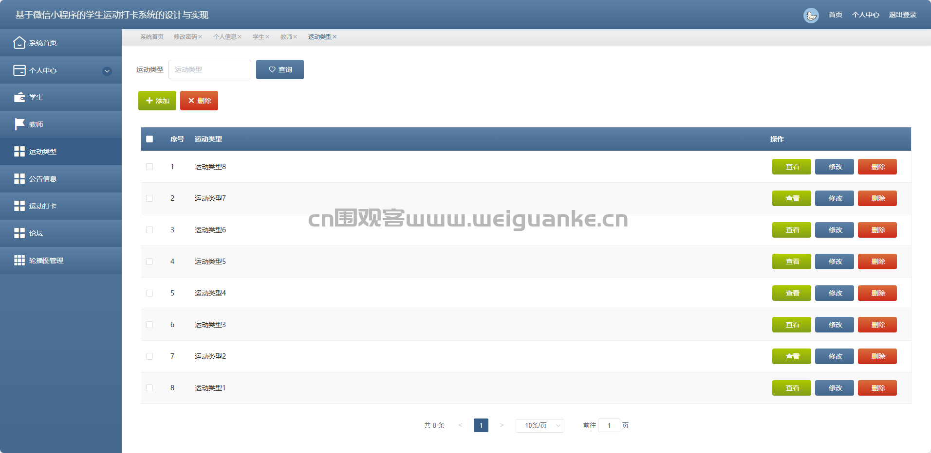 运动类型:增删改查“跑步、跳绳、健身”等分类。