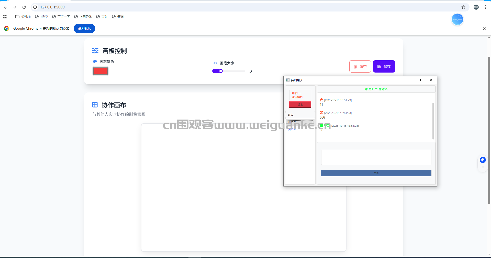 zhe, zhuo python 7天前 基于flask的实时协作绘画系统 项目描述 基于flask的实时协作绘画系统 项目功能: 可以多窗口进行实时协作绘画与聊天 运行环境 开发工具:PyCharm 运行环境:python3.8 此配置为本人调试所用,仅供参考 项目技术: 后端:flask 以上系统源码经过技术整理与调试,确保能正常运行