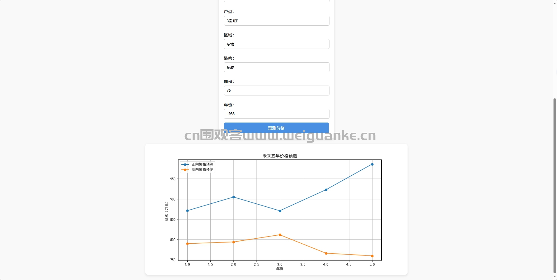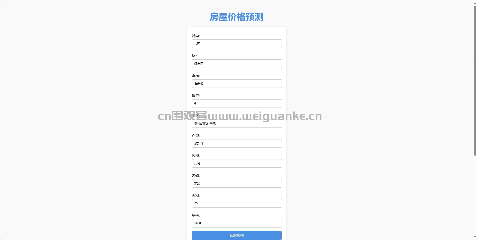 zhe, zhuo python 6天前 基于多项式回归模型的北京房屋价格预测及可视化 项目描述 基于多项式回归模型的北京房屋价格预测及可视化 项目功能: 数据可视化及房屋价格预测 运行环境 开发工具:PyCharm 运行环境:python3.8 此配置为本人调试所用,仅供参考 项目技术: 后端:flask 多项式回归模型 5000是可视化5003是预测 以上系统源码经过技术整理与调试,确保能正常运行