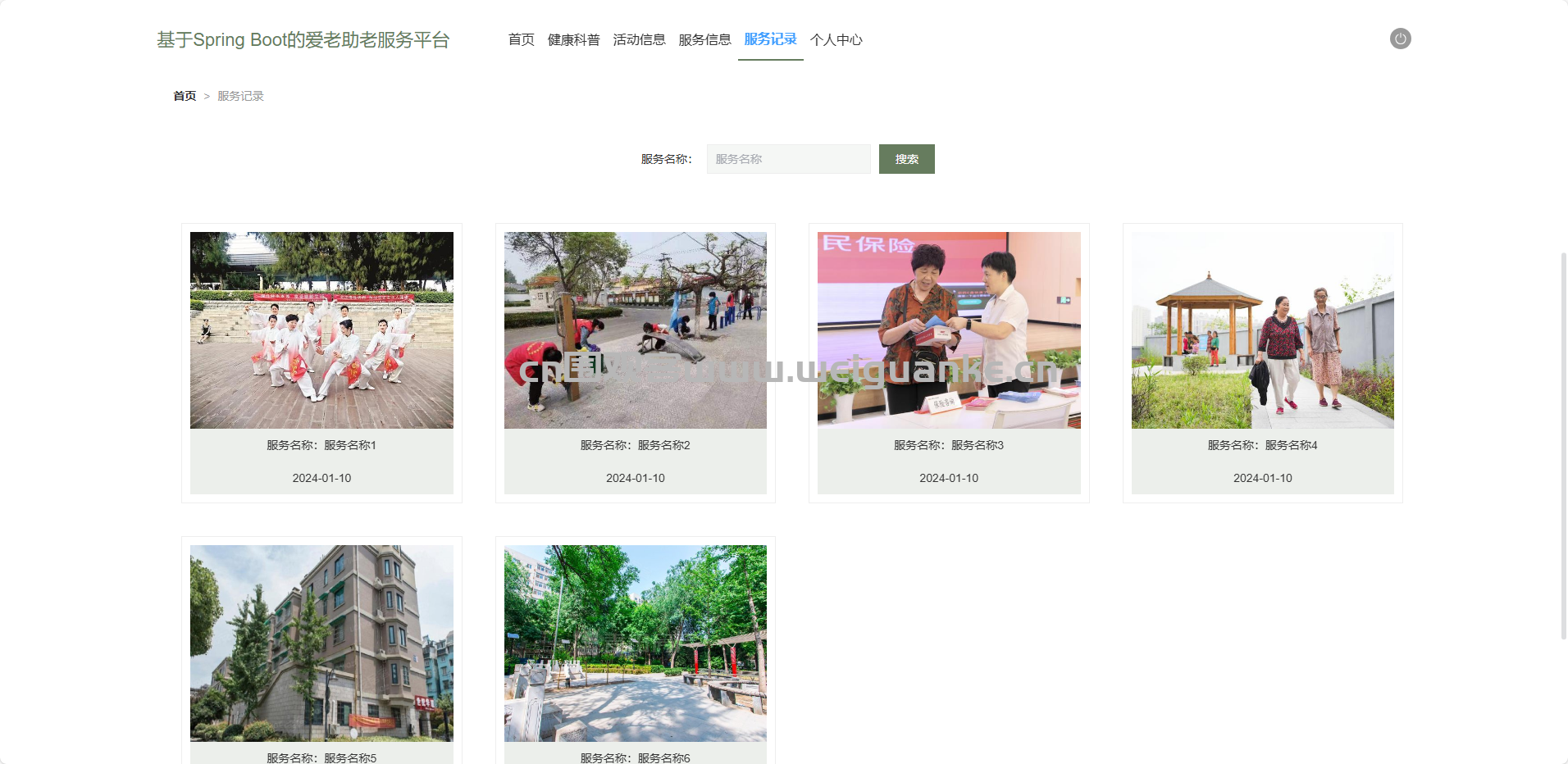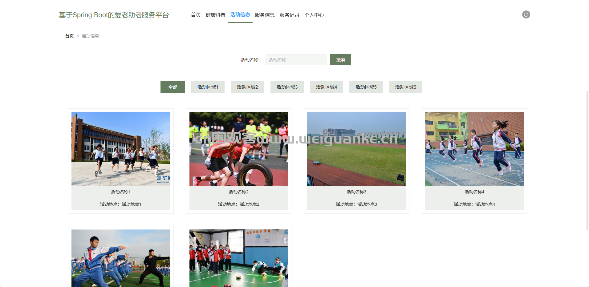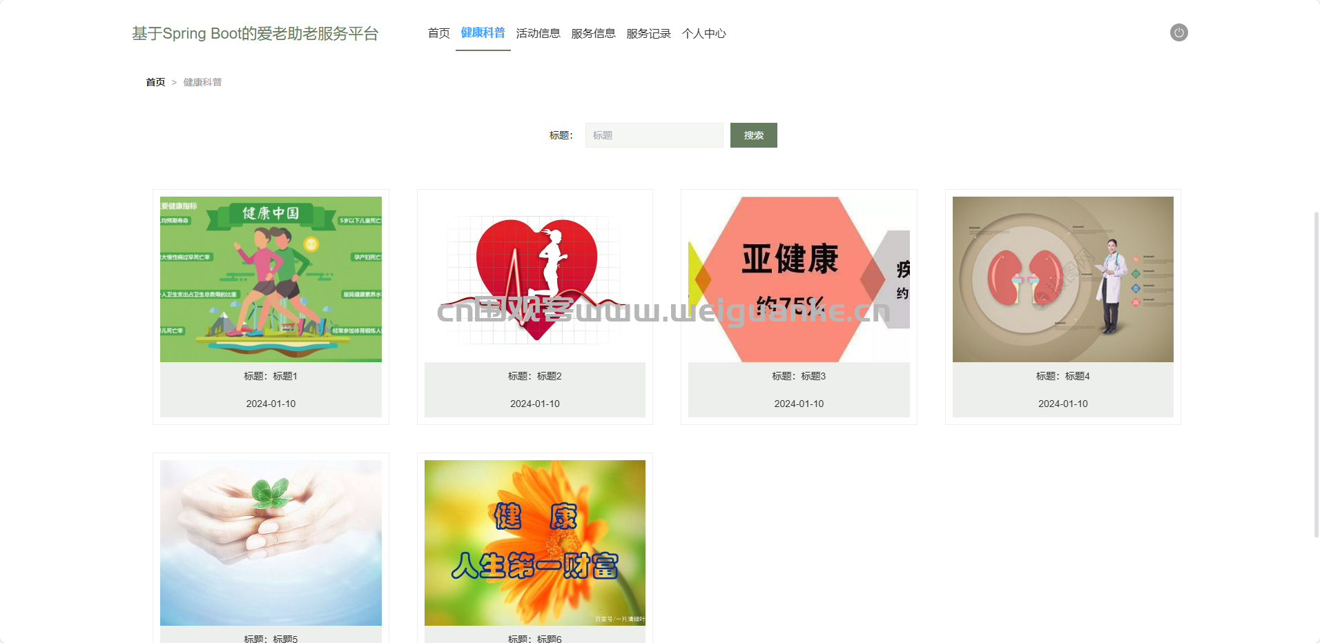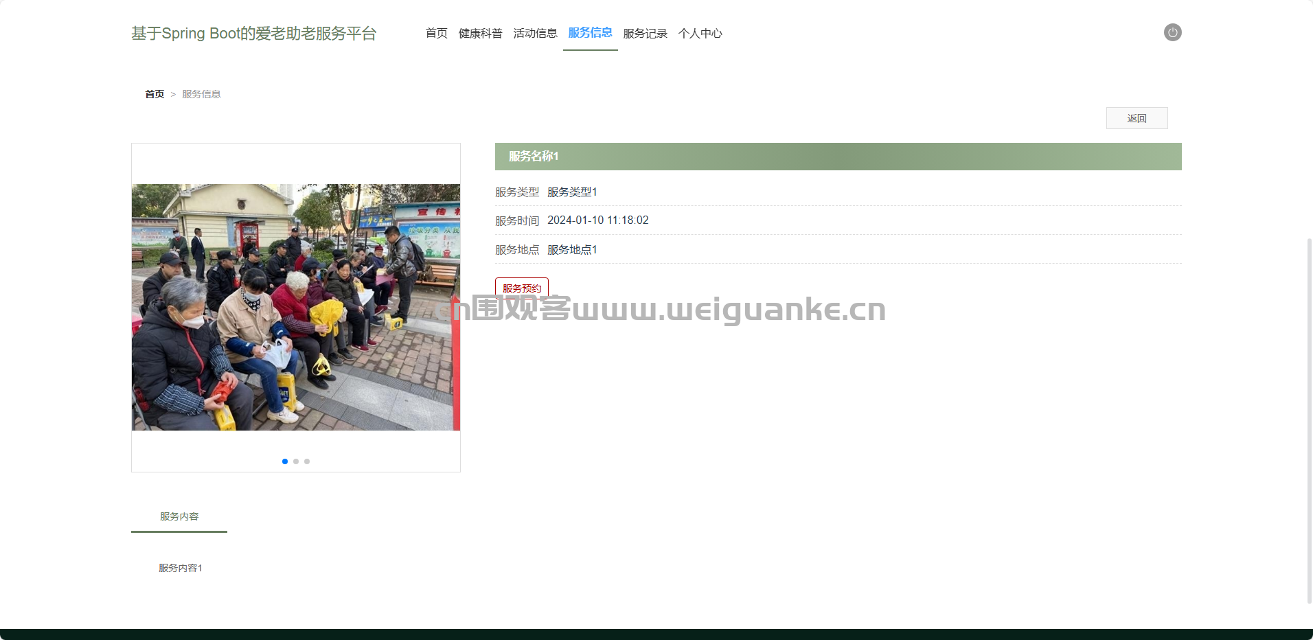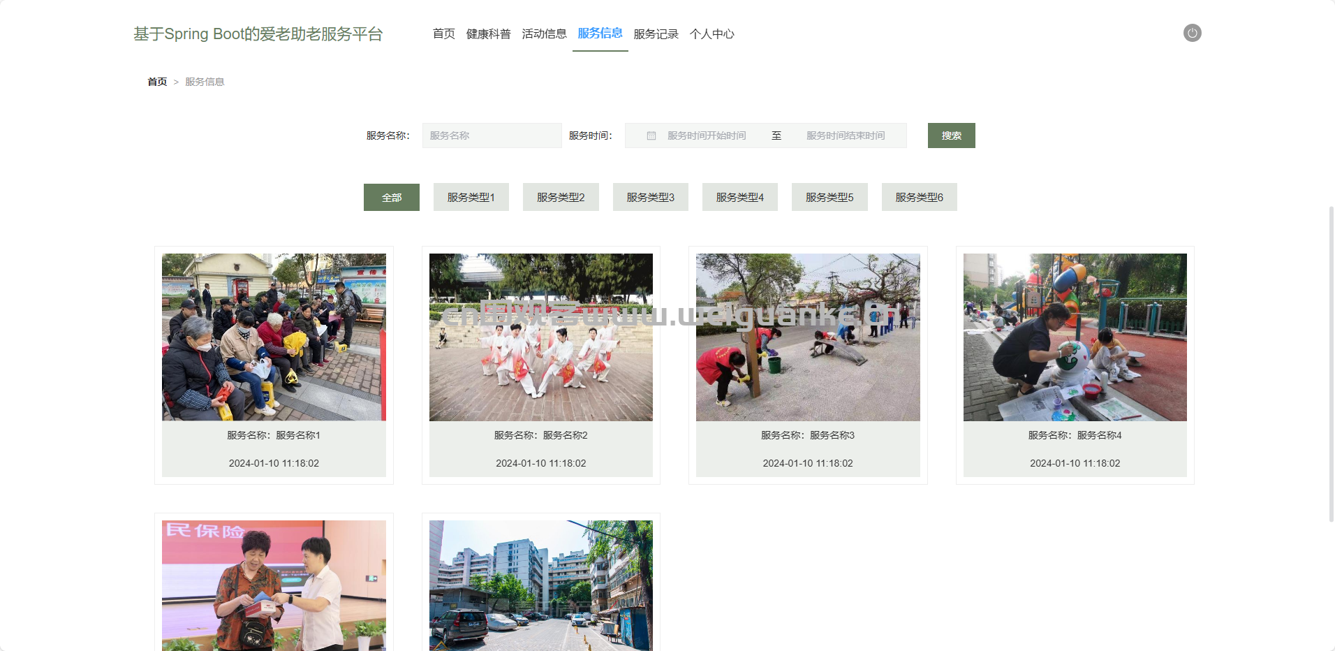 SpringBoot+Vue爱老助老服务平台,前端集成健康科普、活动与服务预约、健康数据记录及智能提醒,后端统一管理用户、活动、服务分派与健康信息,构建多方协同的数字化养老支持体系。