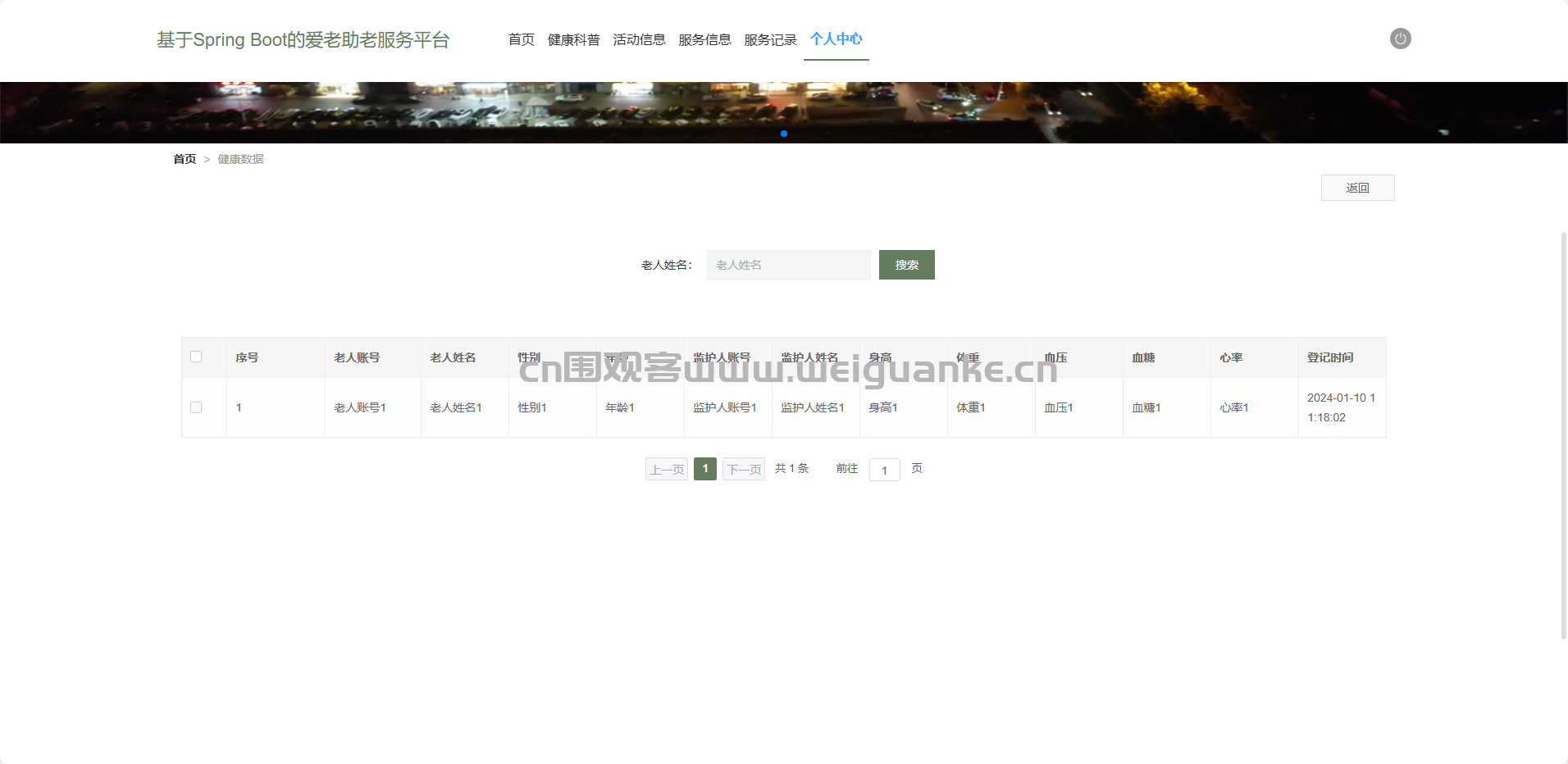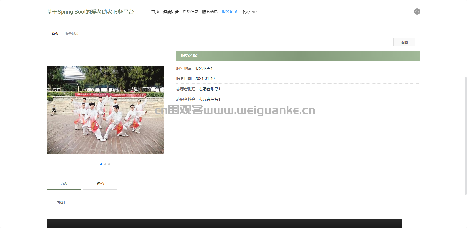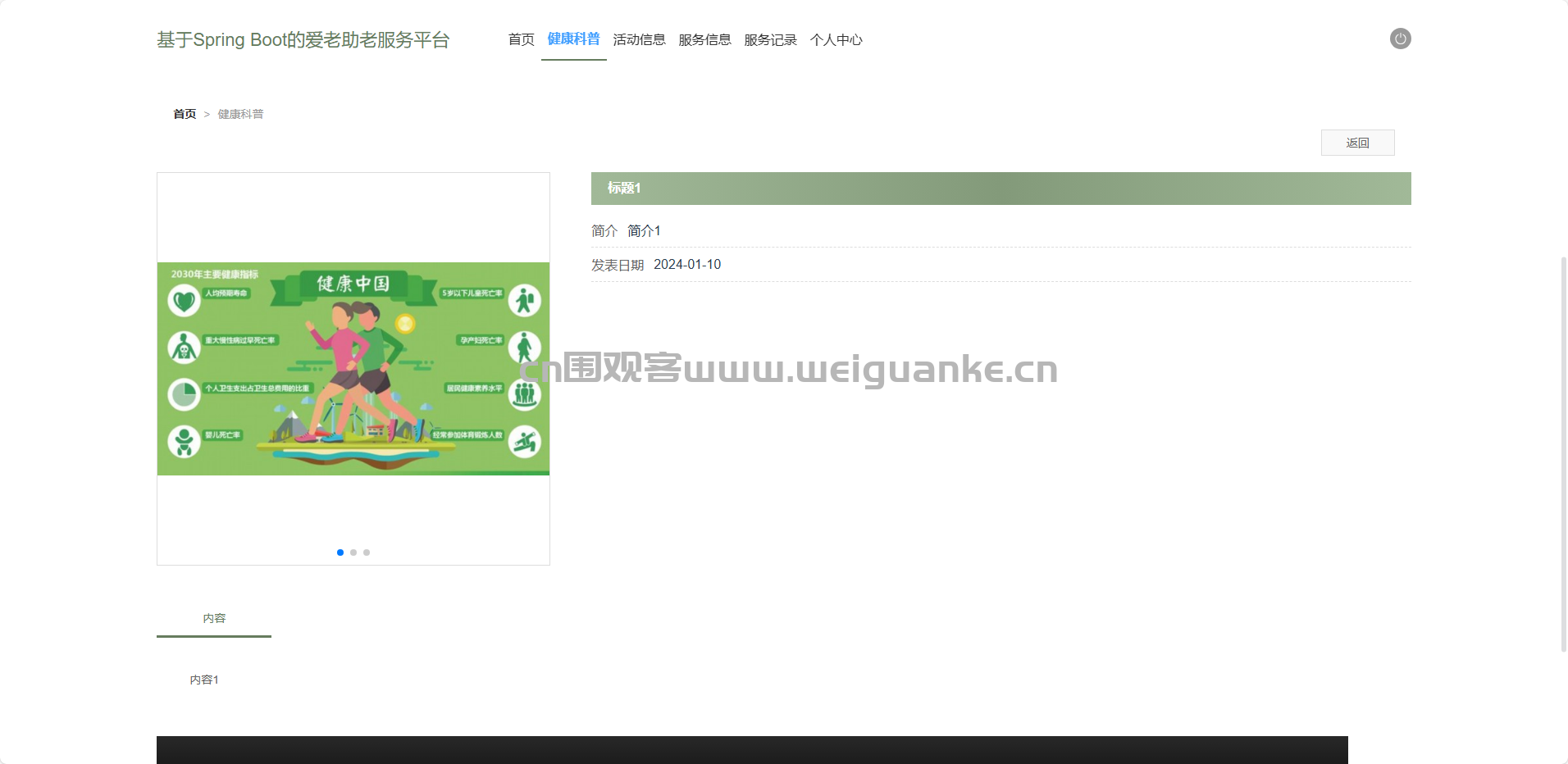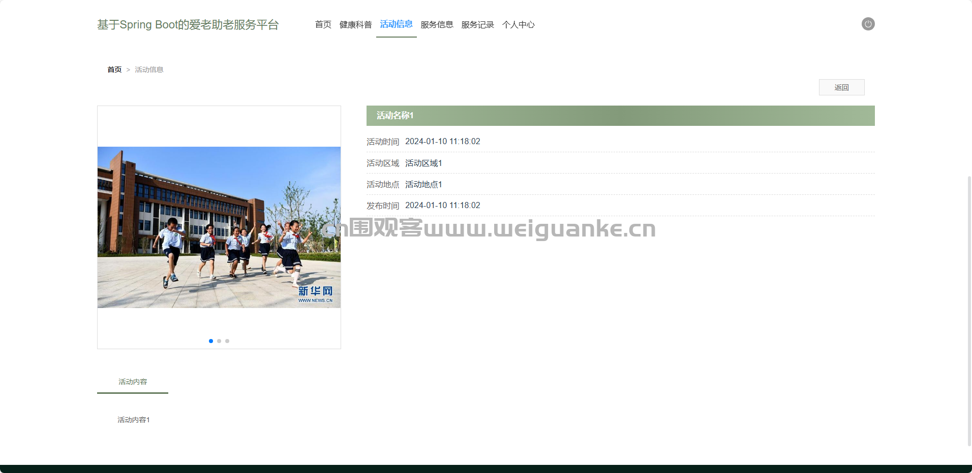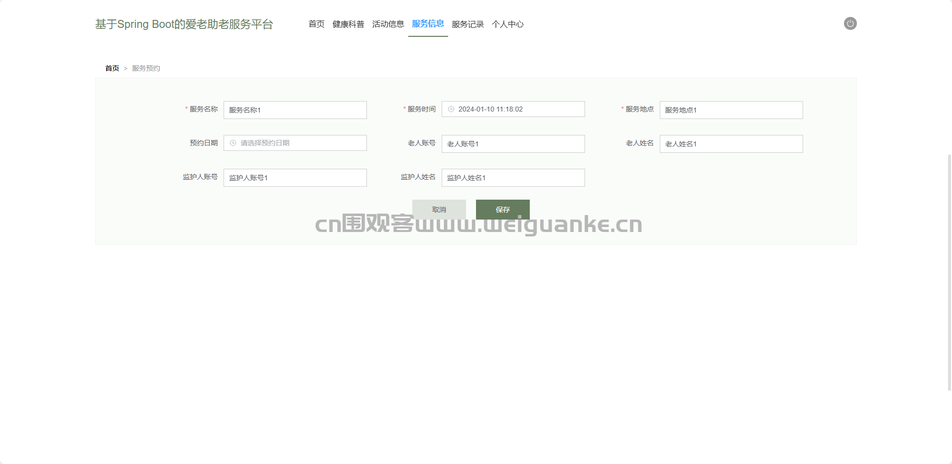 SpringBoot+Vue爱老助老服务平台,前端集成健康科普、活动与服务预约、健康数据记录及智能提醒,后端统一管理用户、活动、服务分派与健康信息,构建多方协同的数字化养老支持体系。