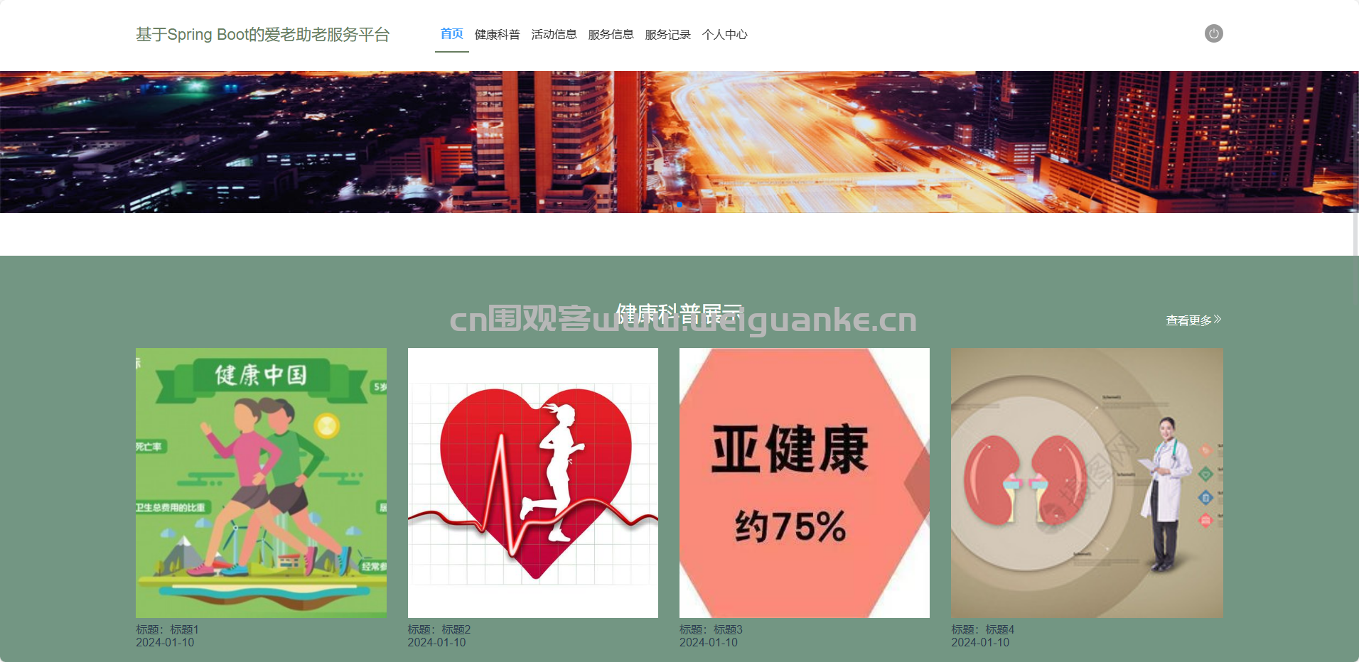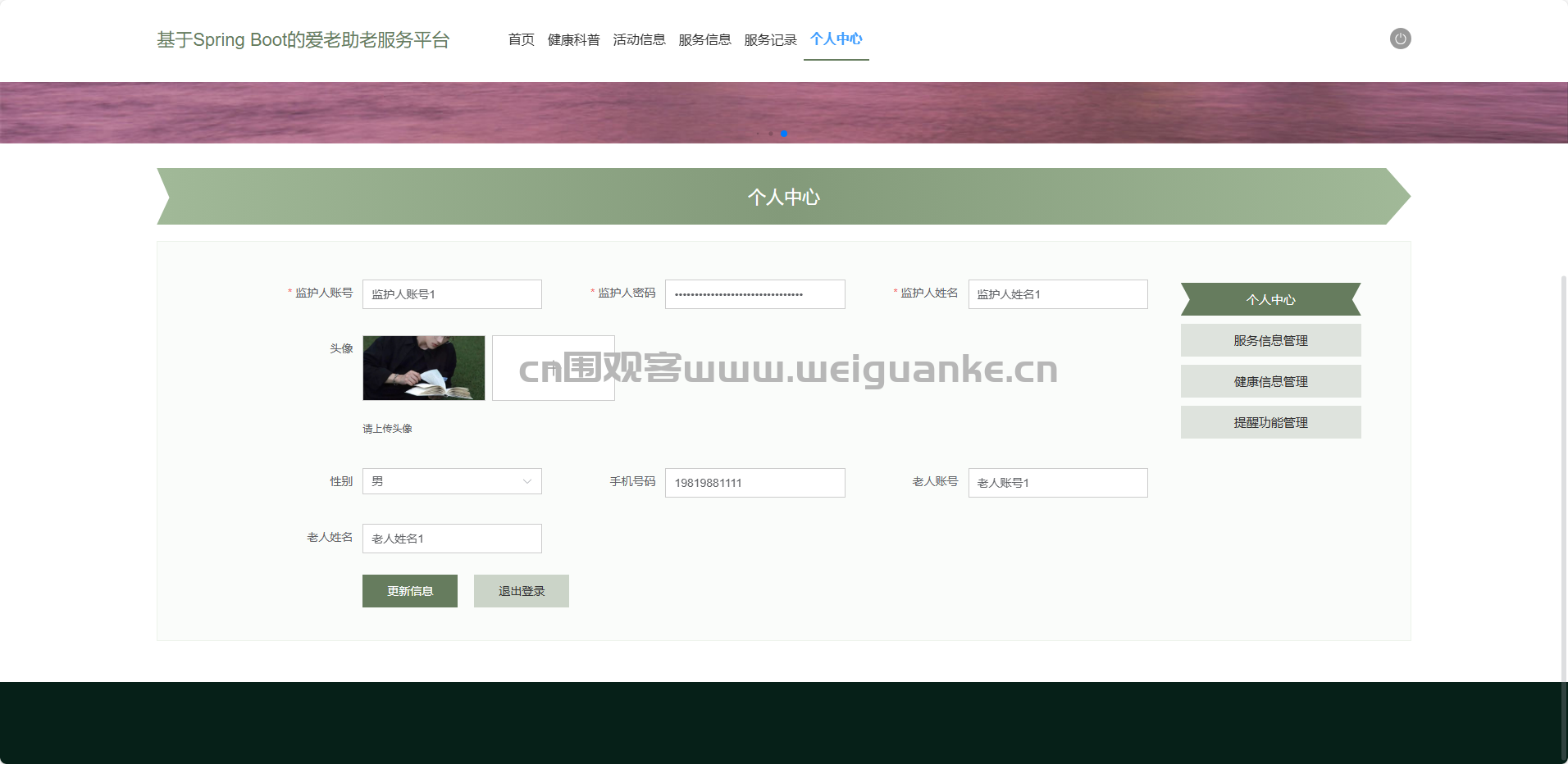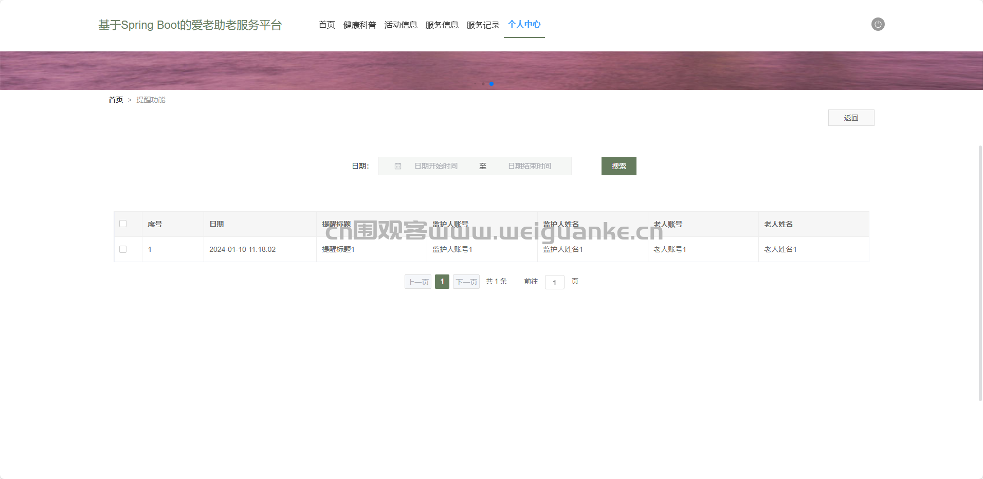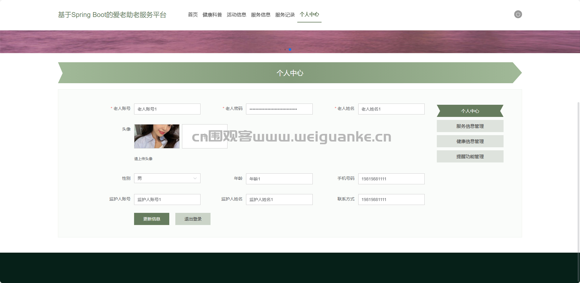 SpringBoot+Vue爱老助老服务平台,前端集成健康科普、活动与服务预约、健康数据记录及智能提醒,后端统一管理用户、活动、服务分派与健康信息,构建多方协同的数字化养老支持体系。