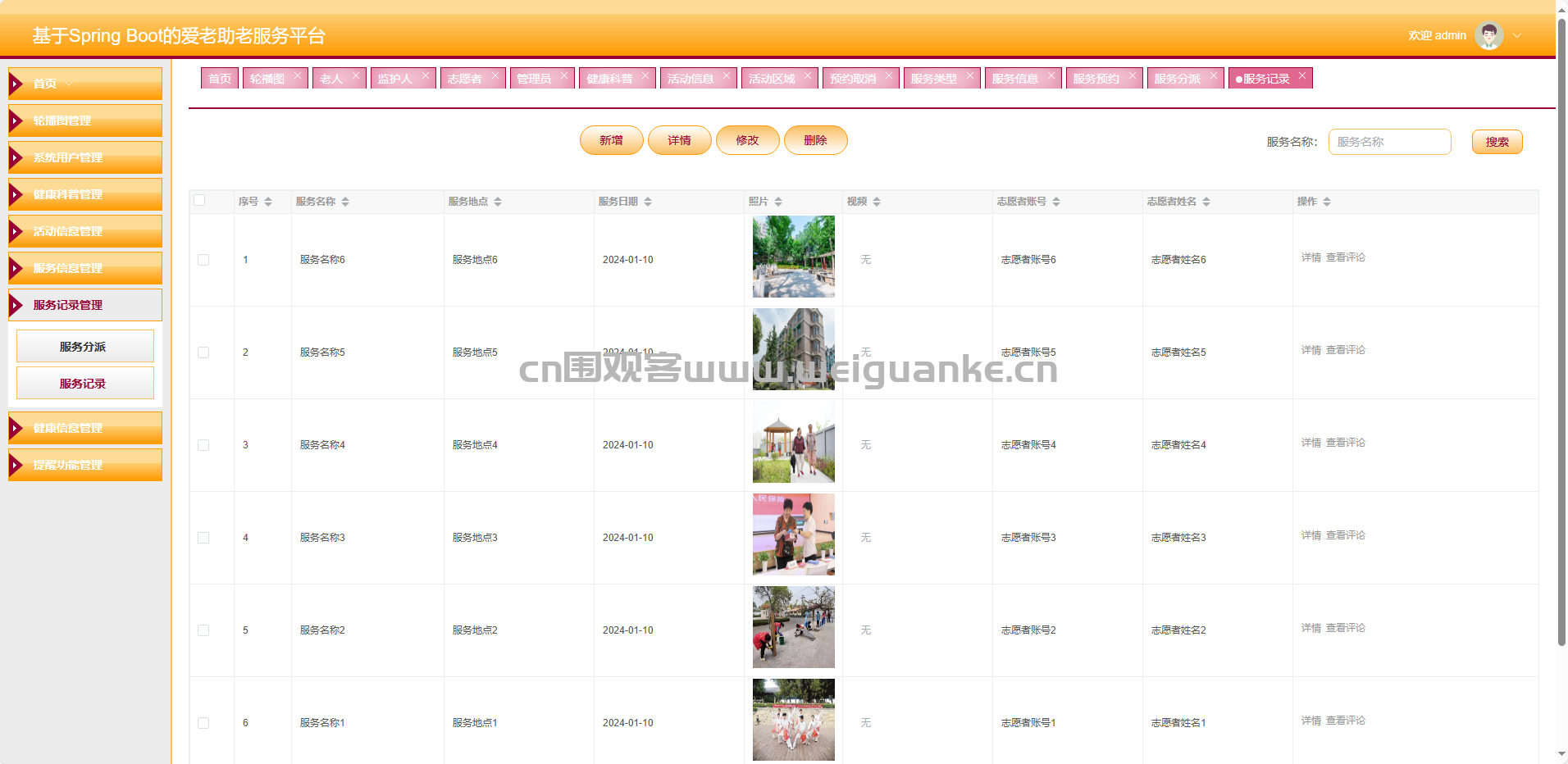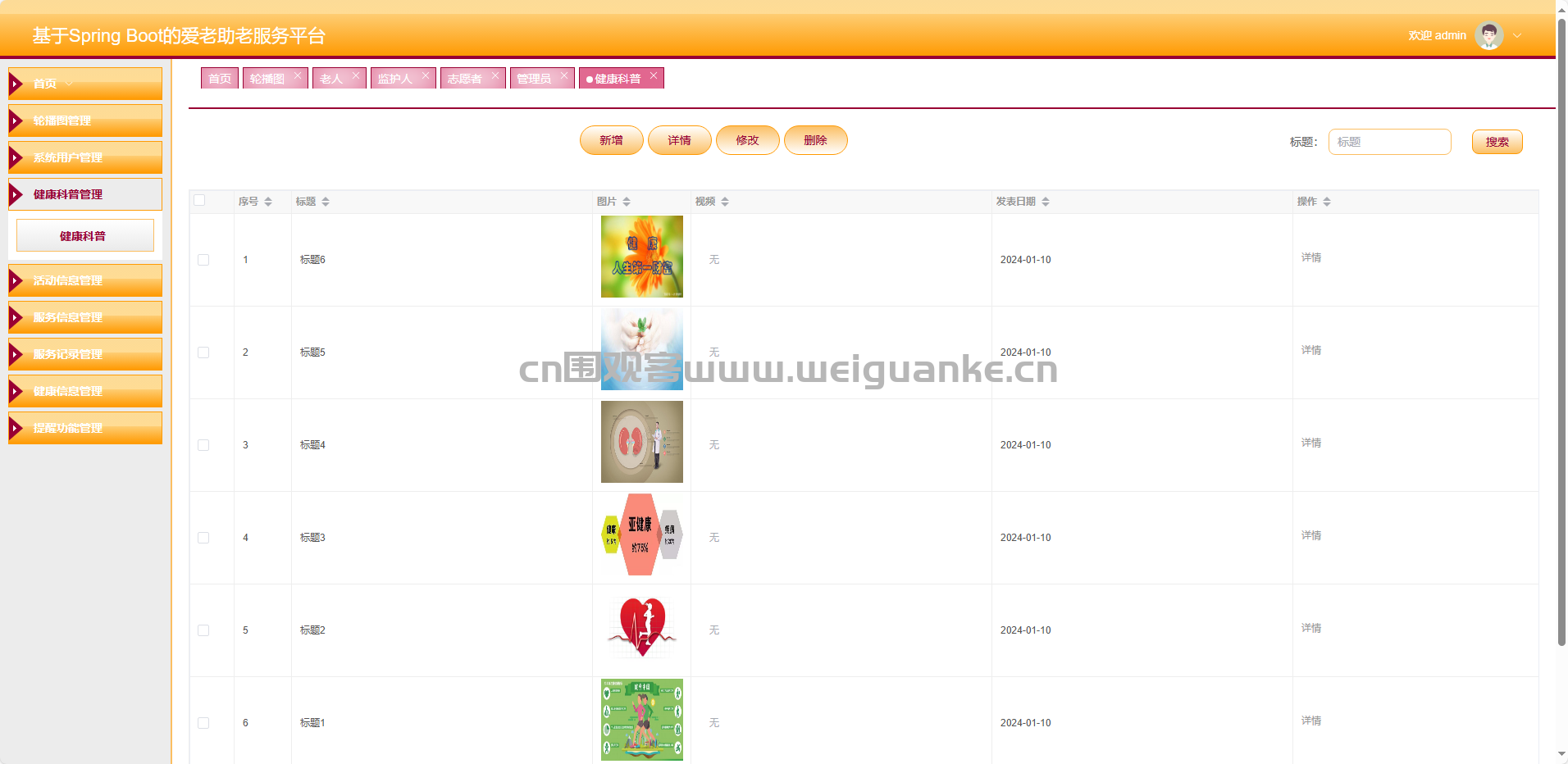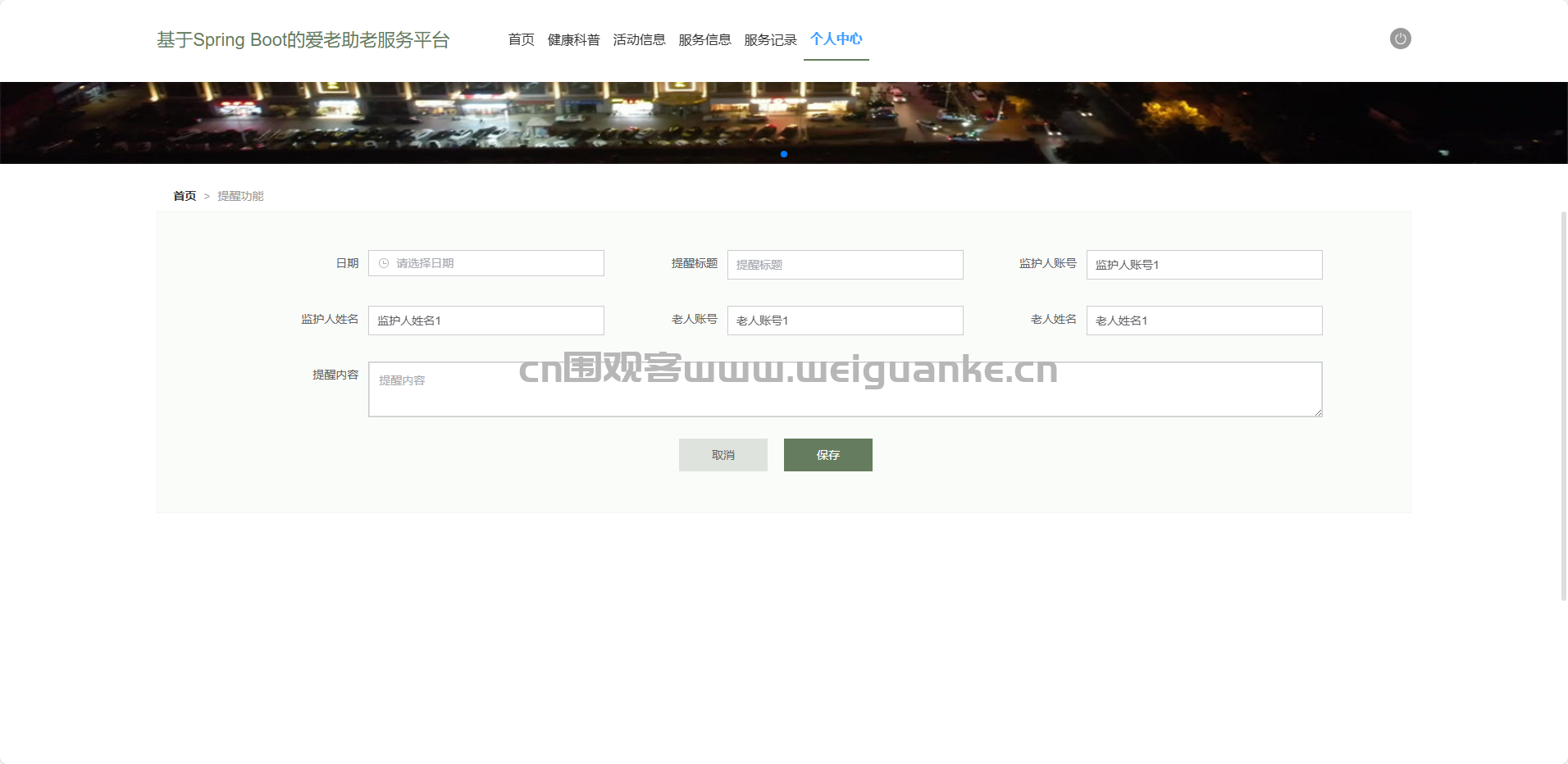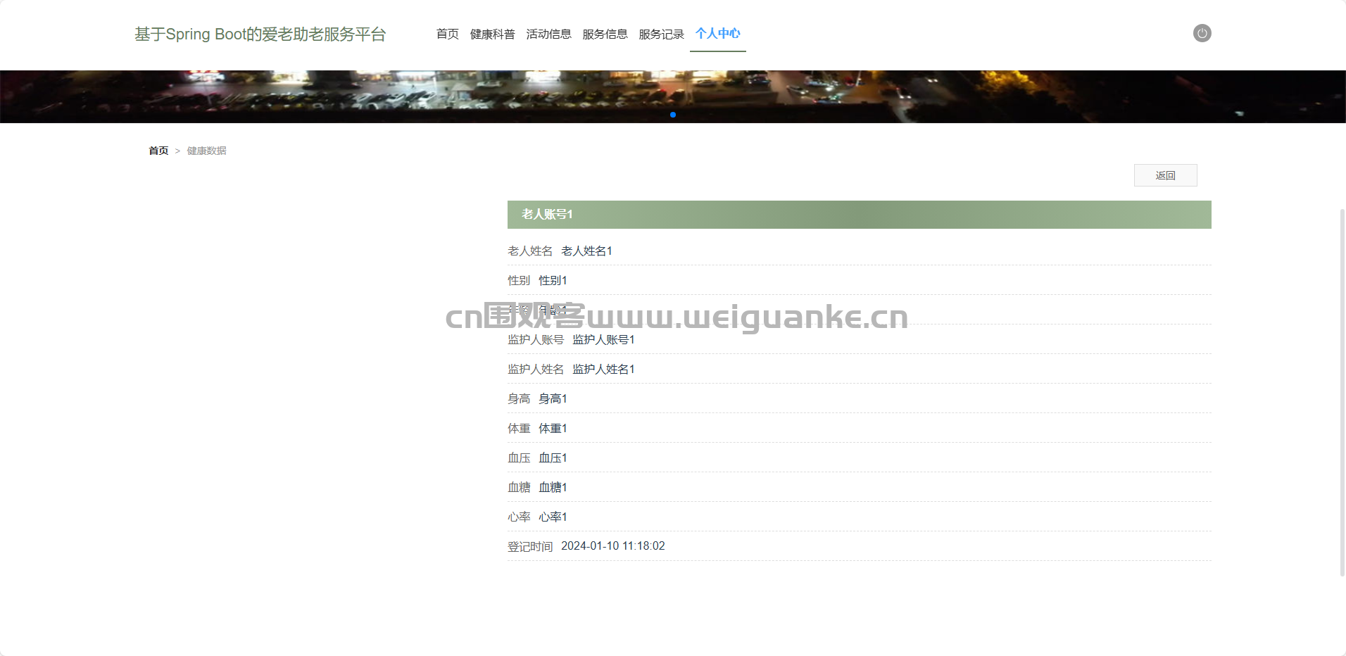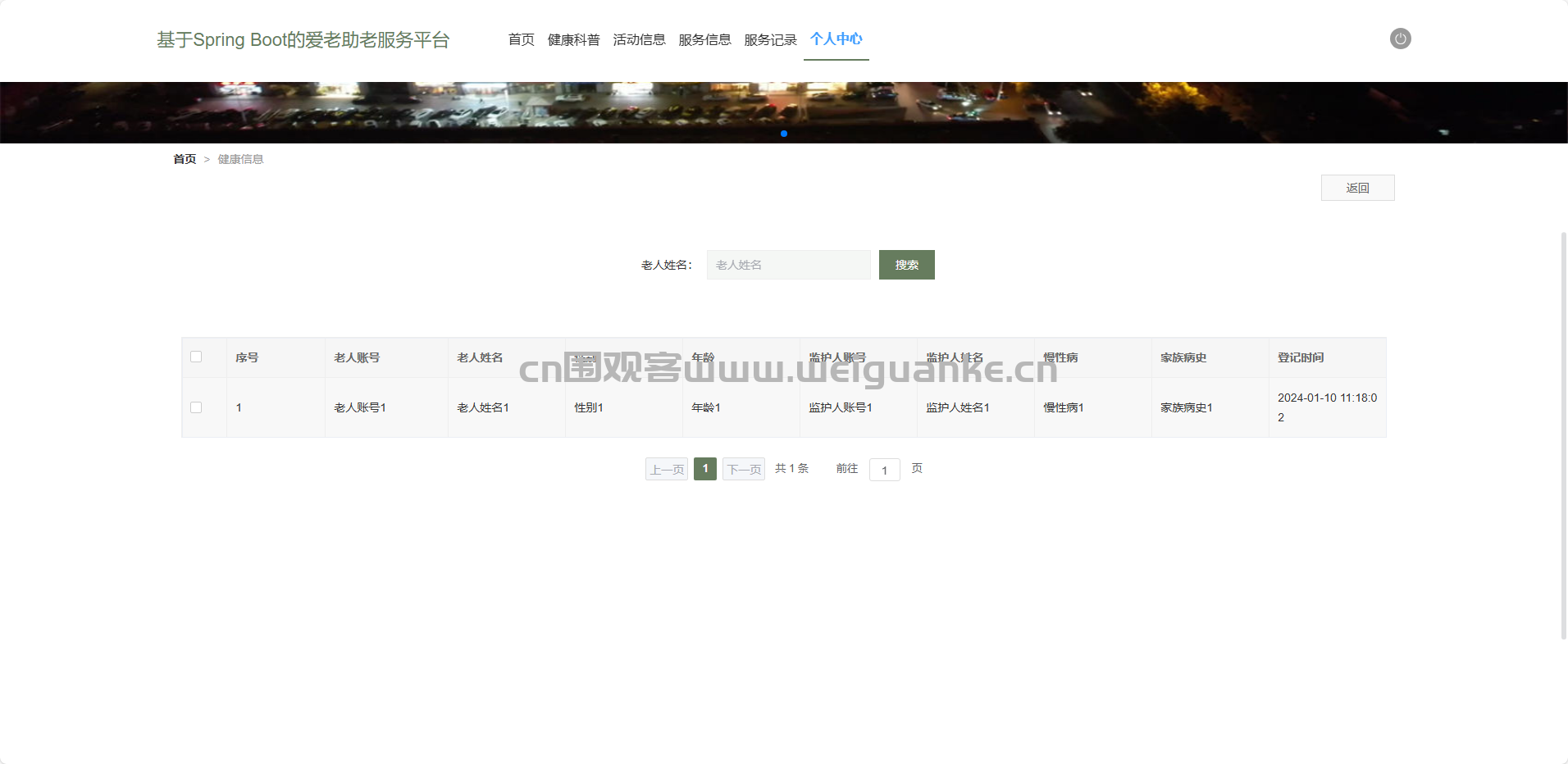 SpringBoot+Vue爱老助老服务平台,前端集成健康科普、活动与服务预约、健康数据记录及智能提醒,后端统一管理用户、活动、服务分派与健康信息,构建多方协同的数字化养老支持体系。