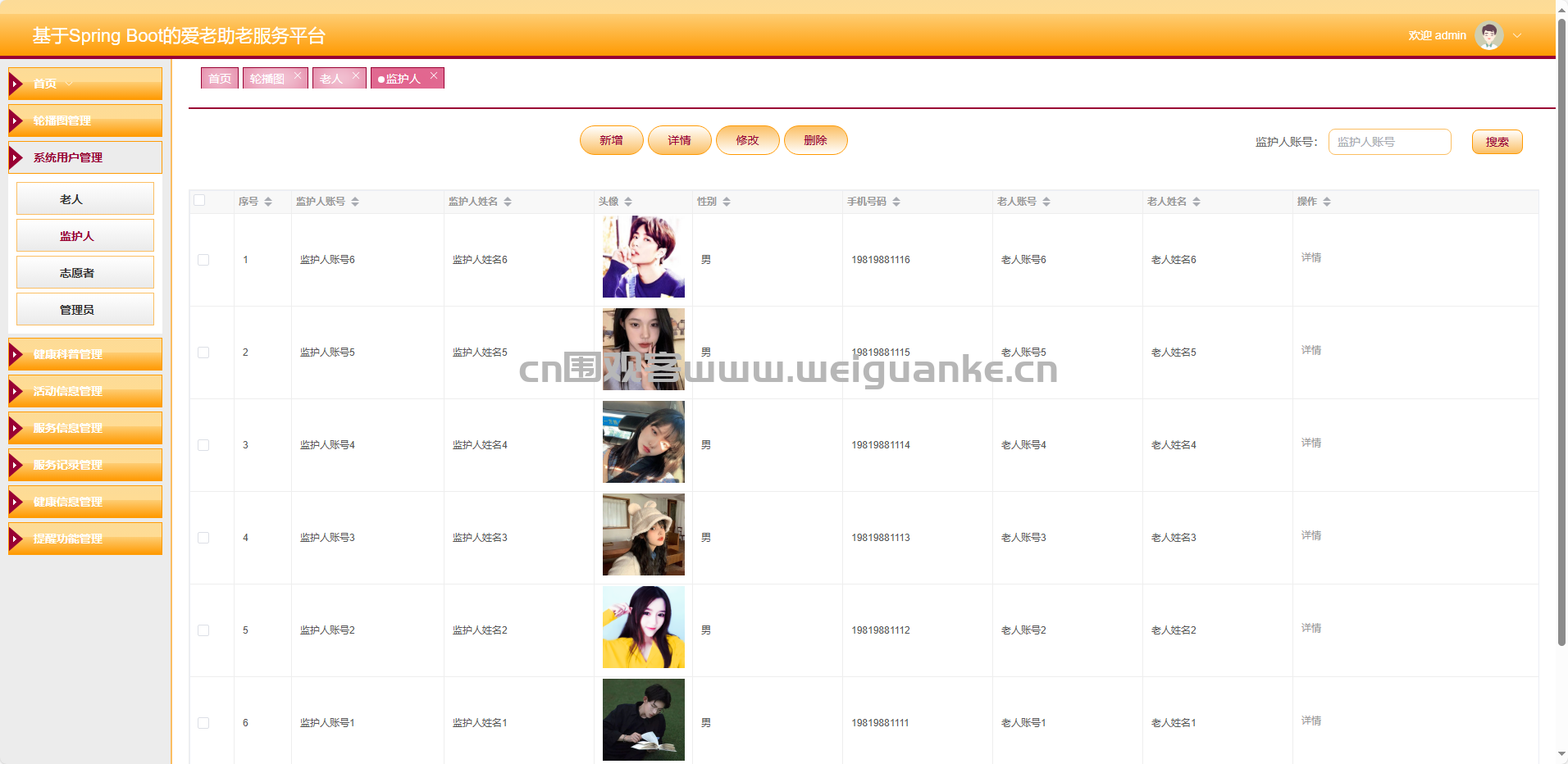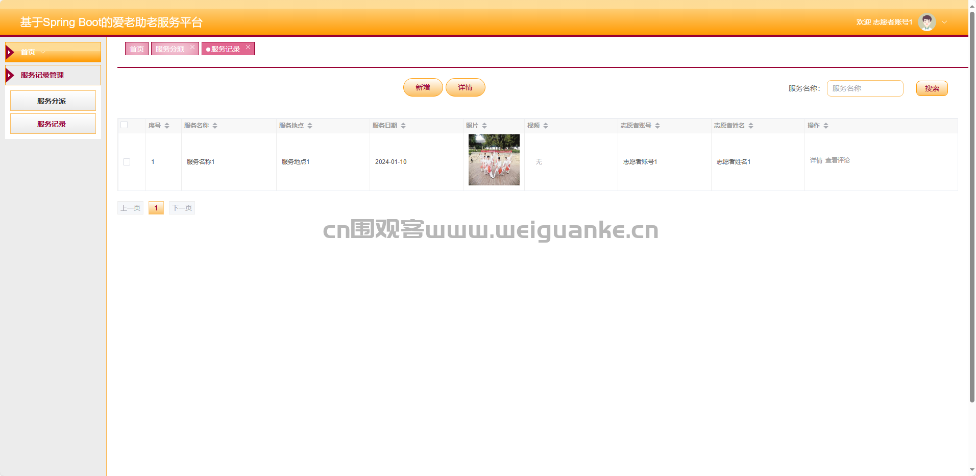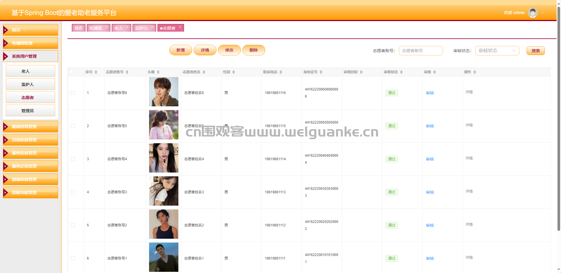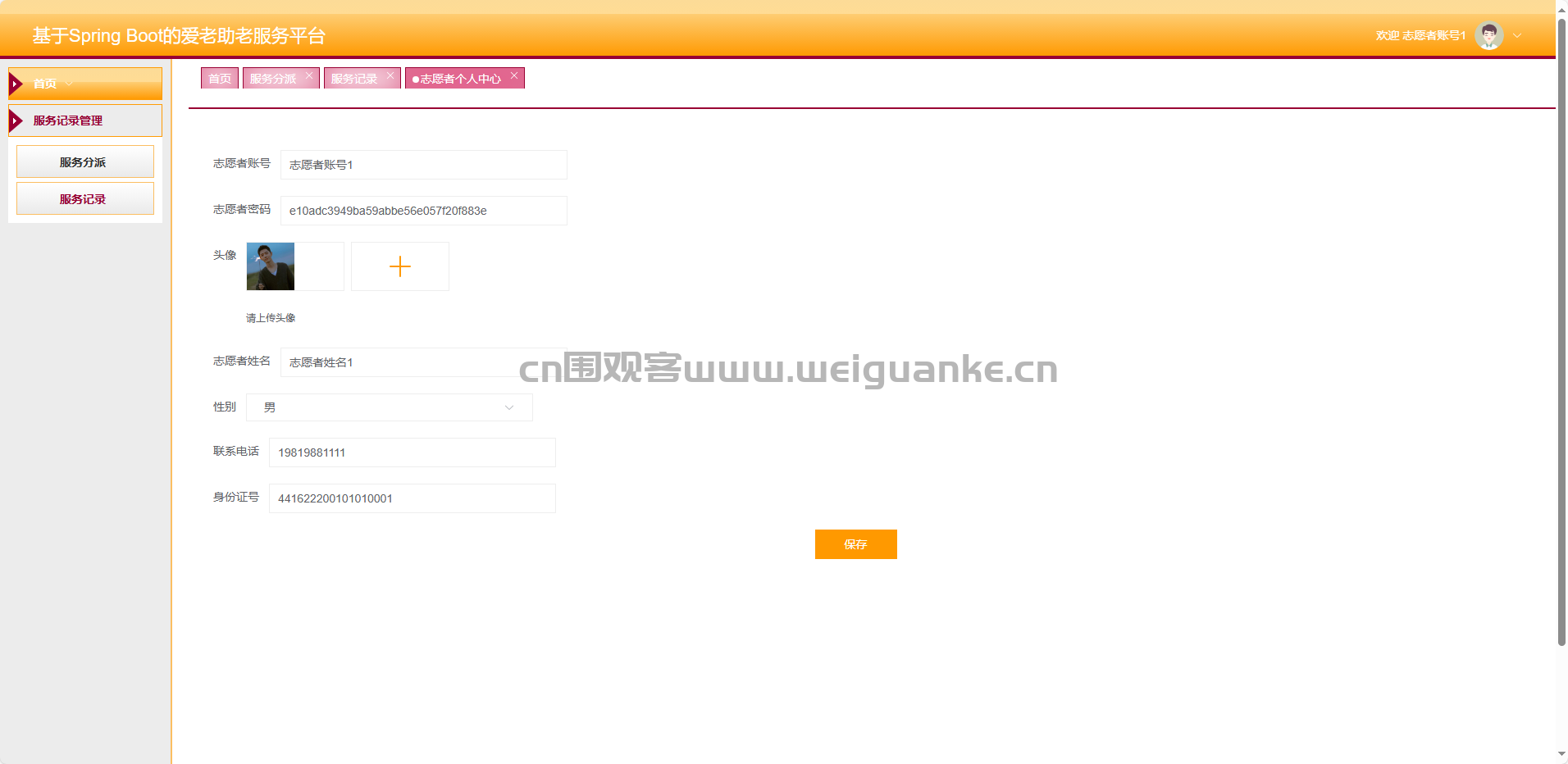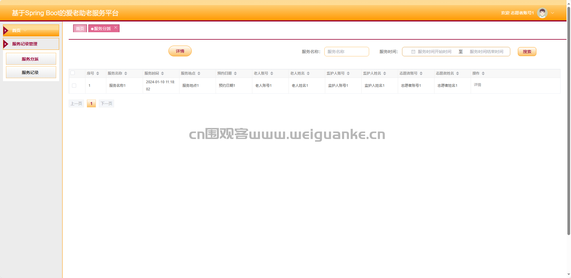系统用户管理-志愿者:增删改查志愿者账号与服务技能。