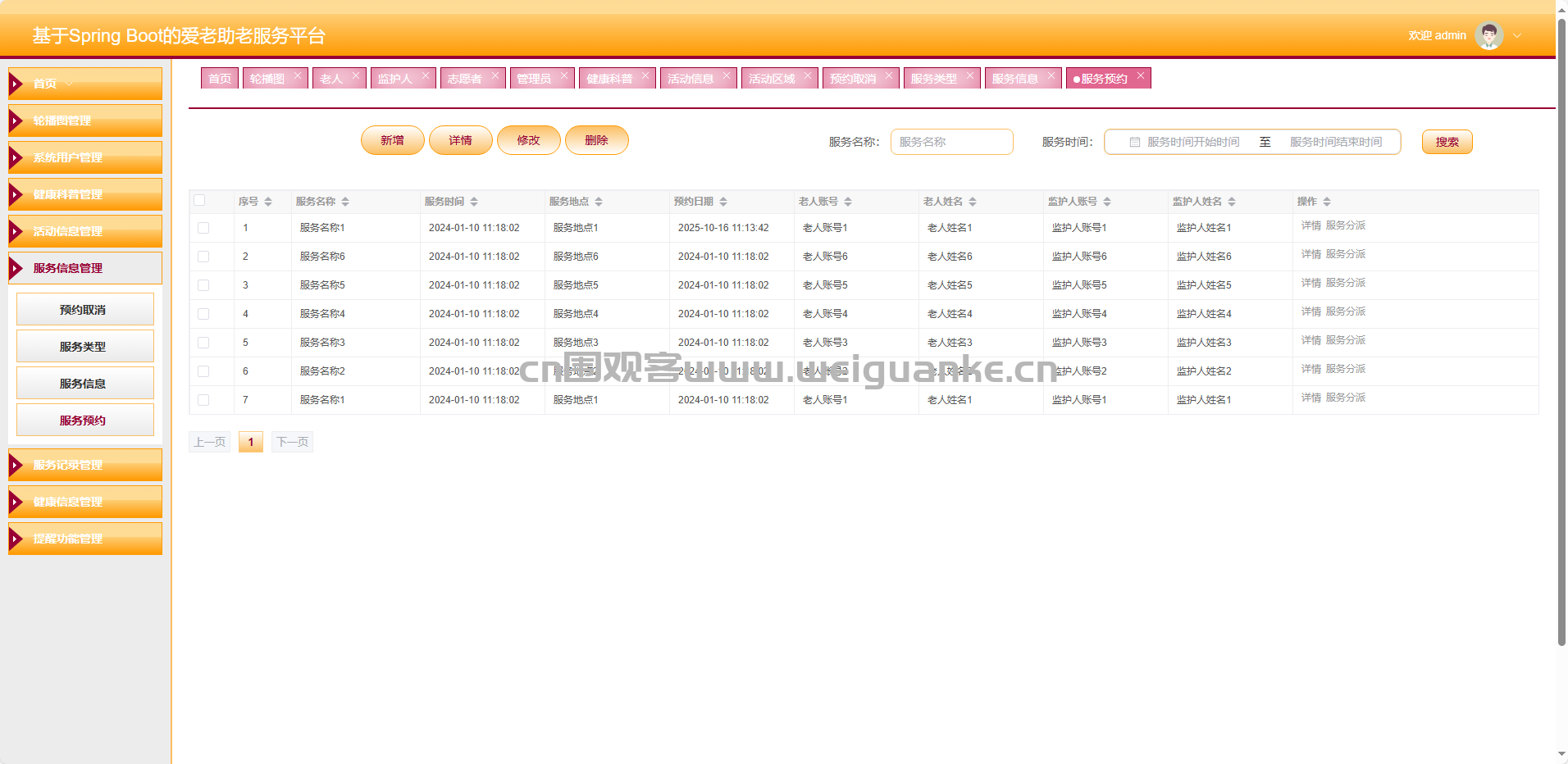 服务信息管理-服务预约:查看、派单、删除预约单。