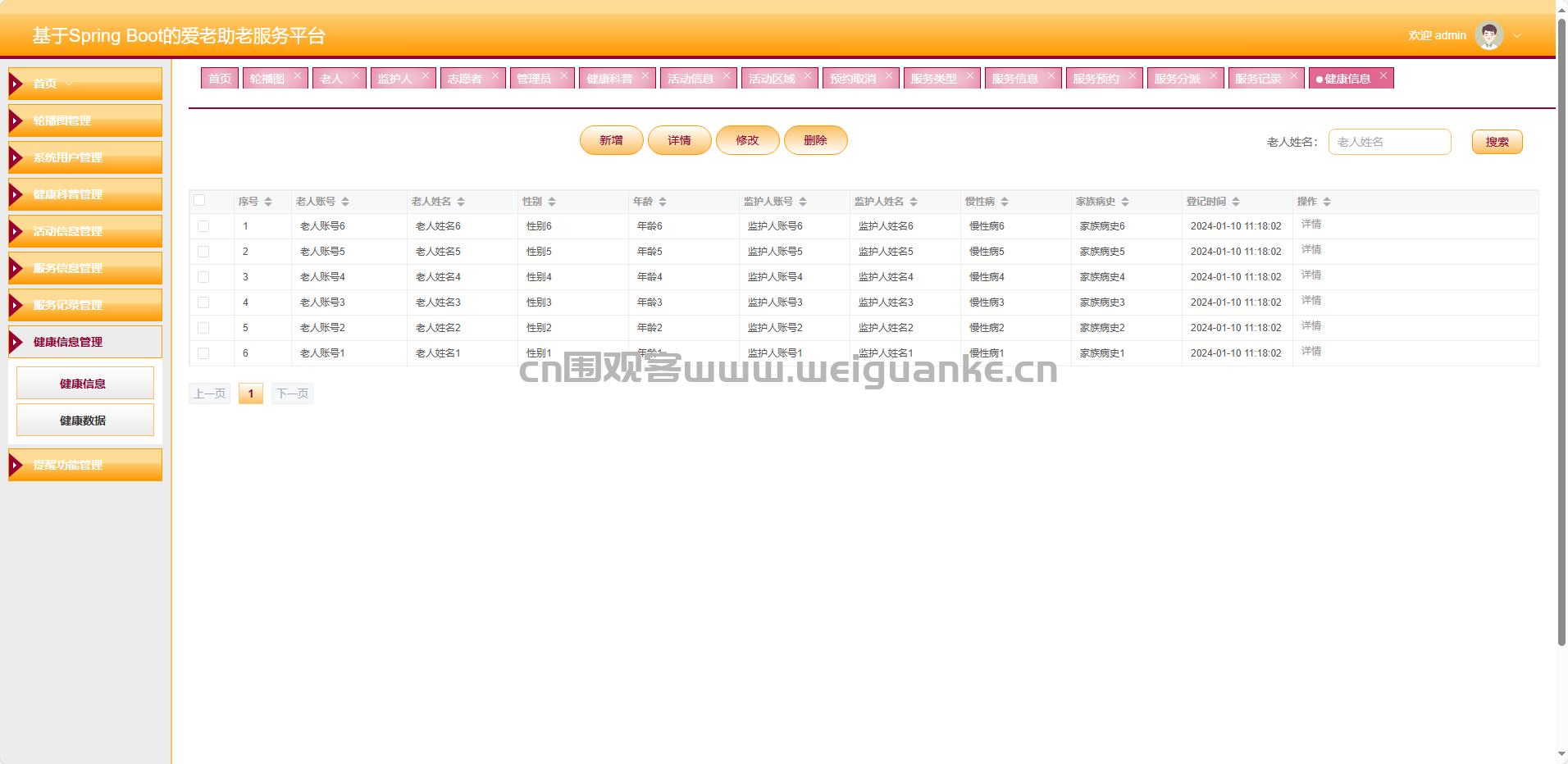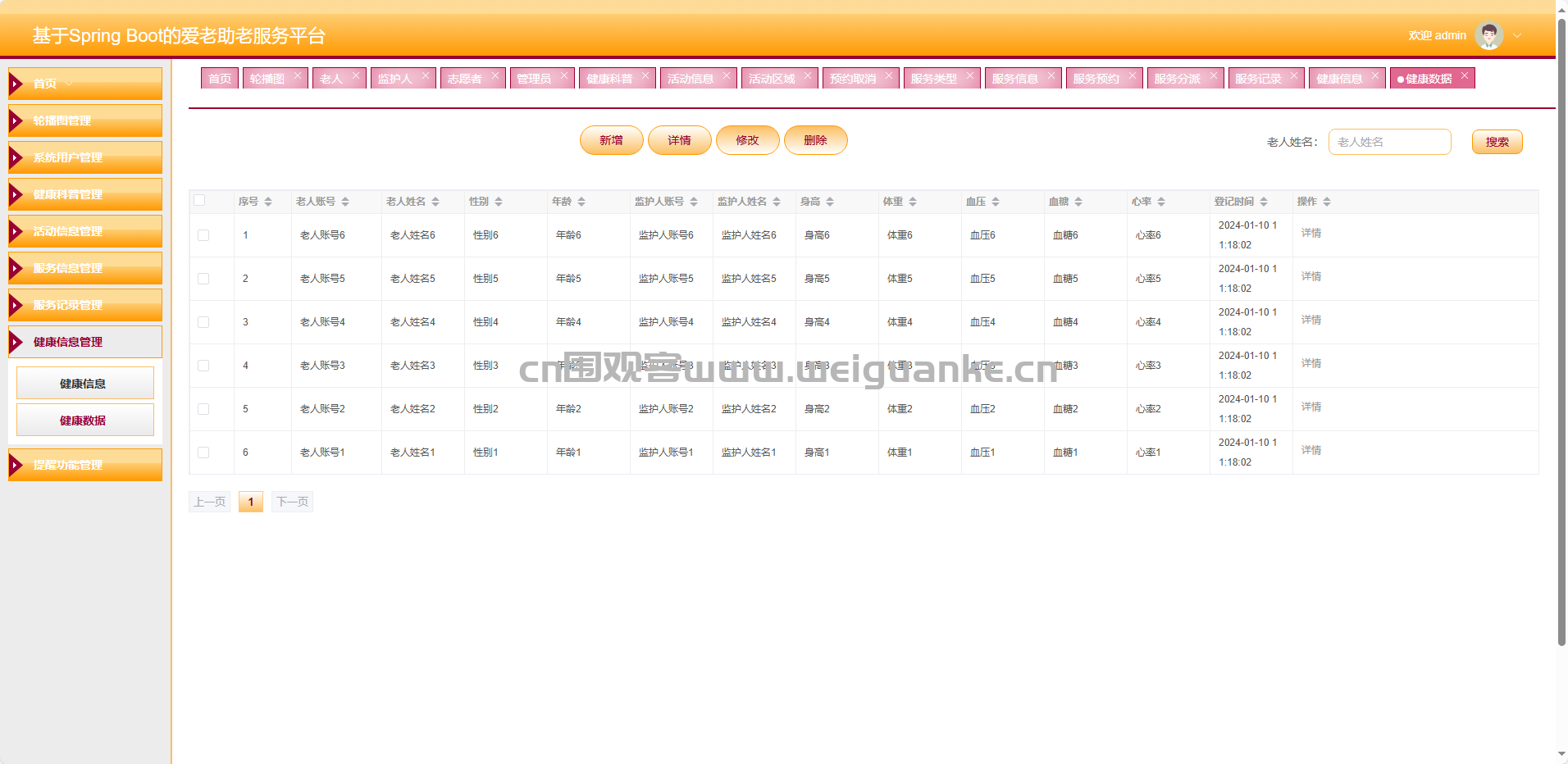 健康信息管理-健康信息:查看、删除、更新老人健康档案。
