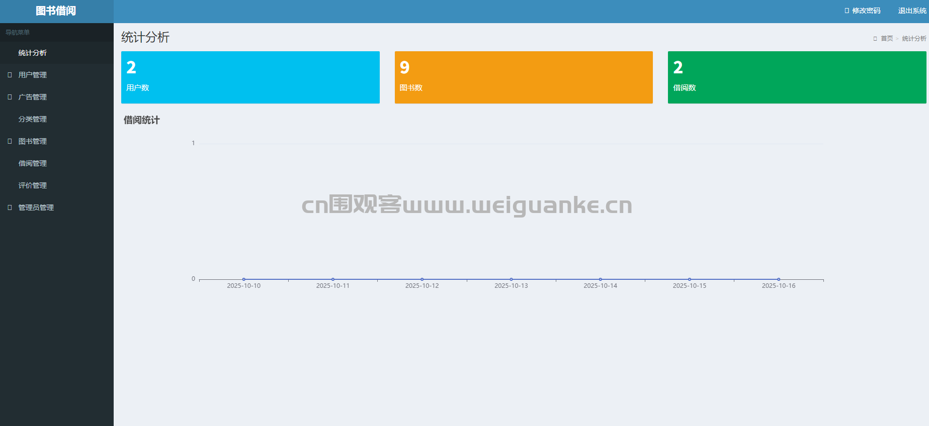 统计分析:展示用户数、图书数、借阅数的总量及每日借阅折线图。