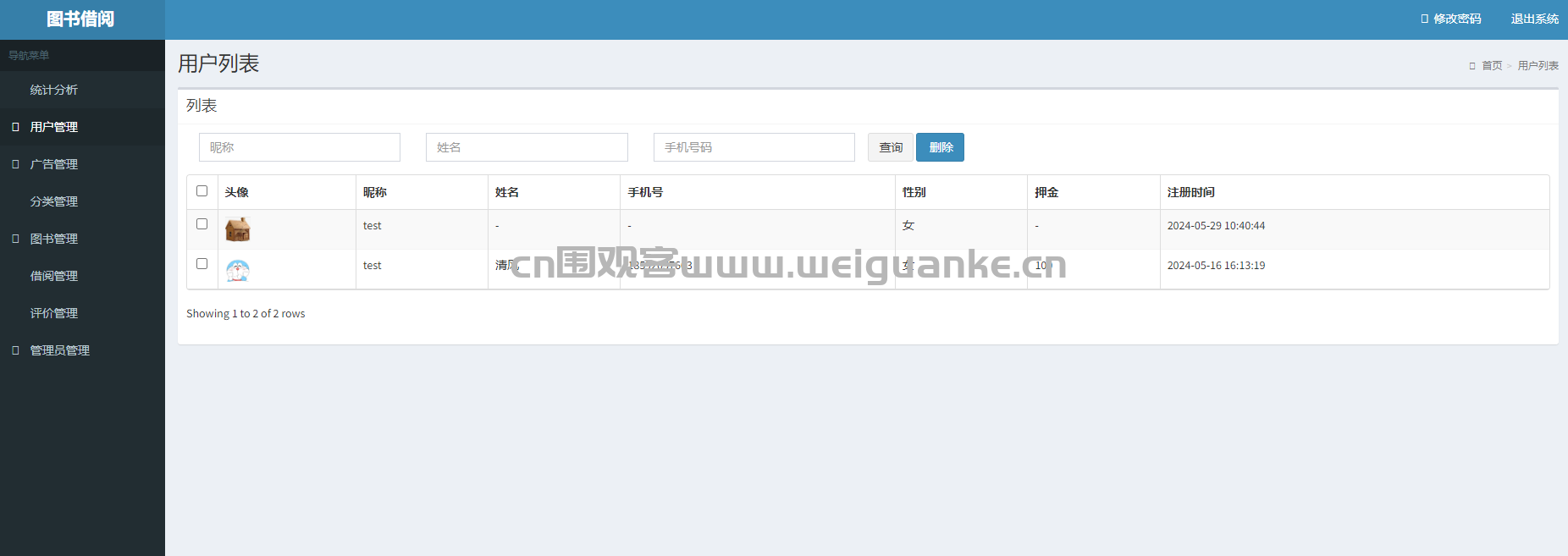 用户管理:列出用户昵称、姓名、手机号,可查询与删除。