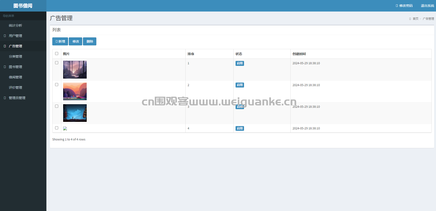 广告管理:维护首页轮播广告,支持新增、修改、启用/停用。