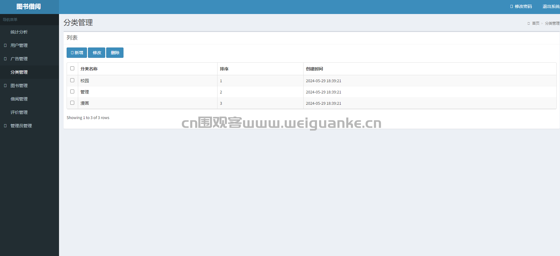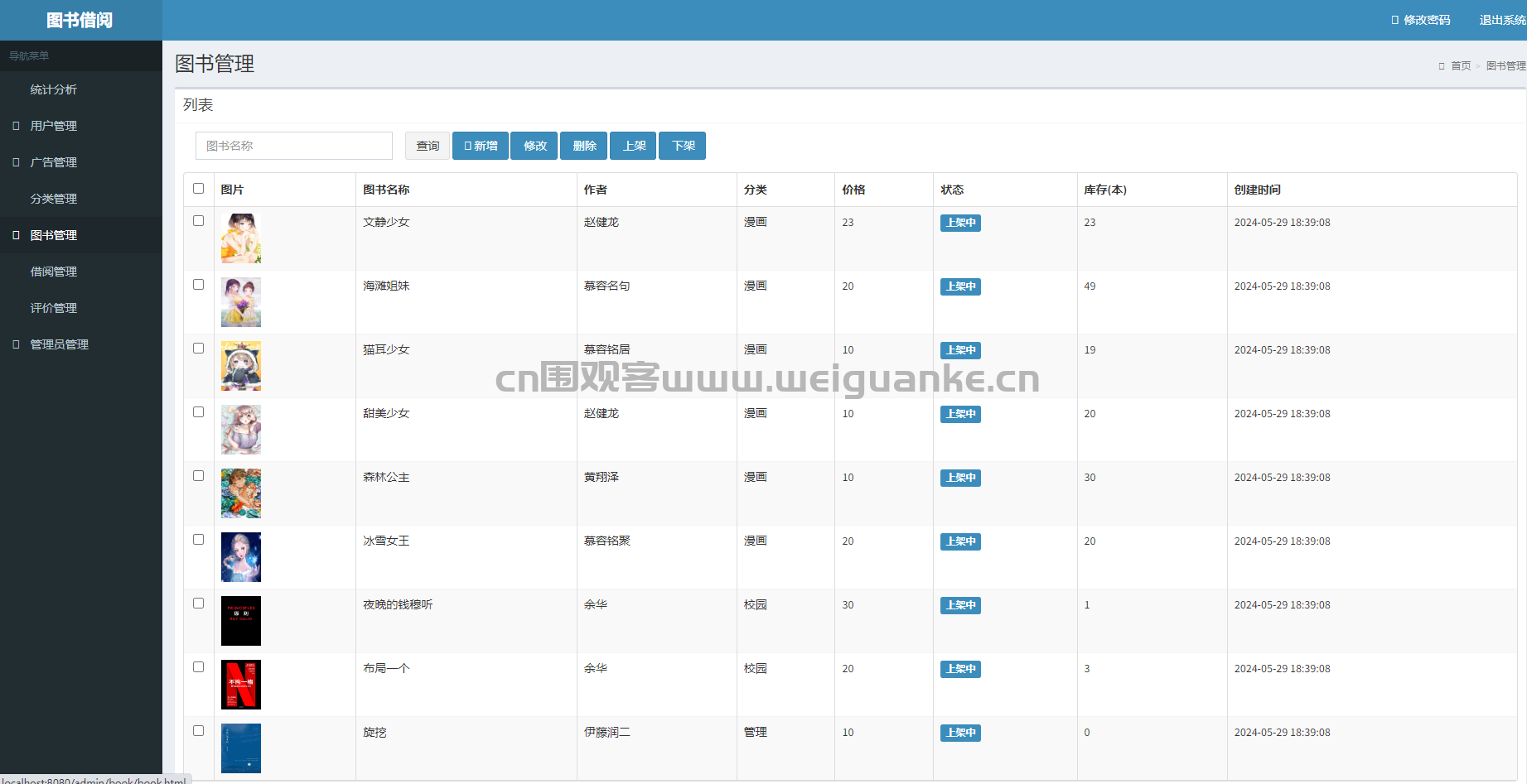 图书管理:维护图书基本信息、库存、上下架状态及分类归属。