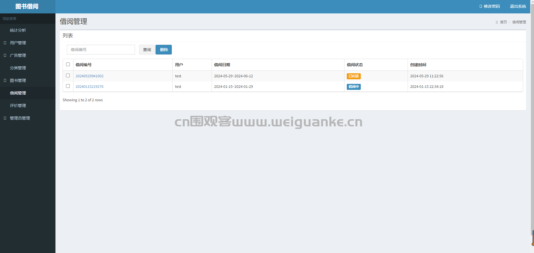 借阅管理:展示所有借阅单号、用户、借阅日期、状态及创建时间。