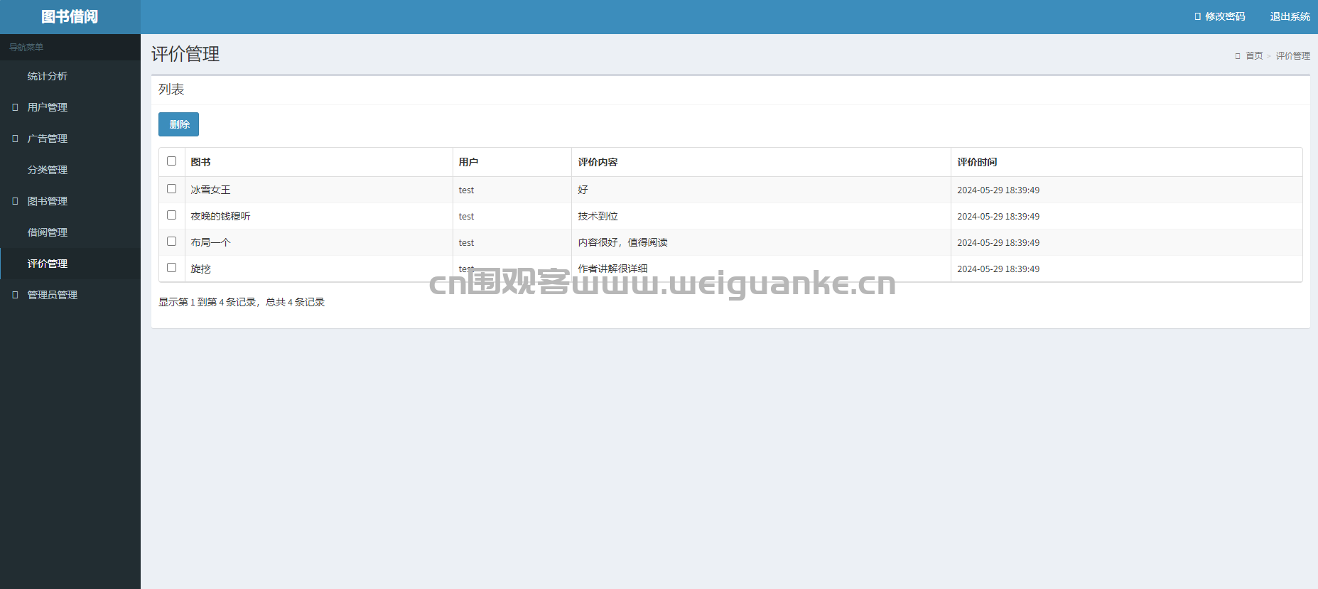 评价管理:展示用户对图书的评价内容、评分与评价时间,可删除。