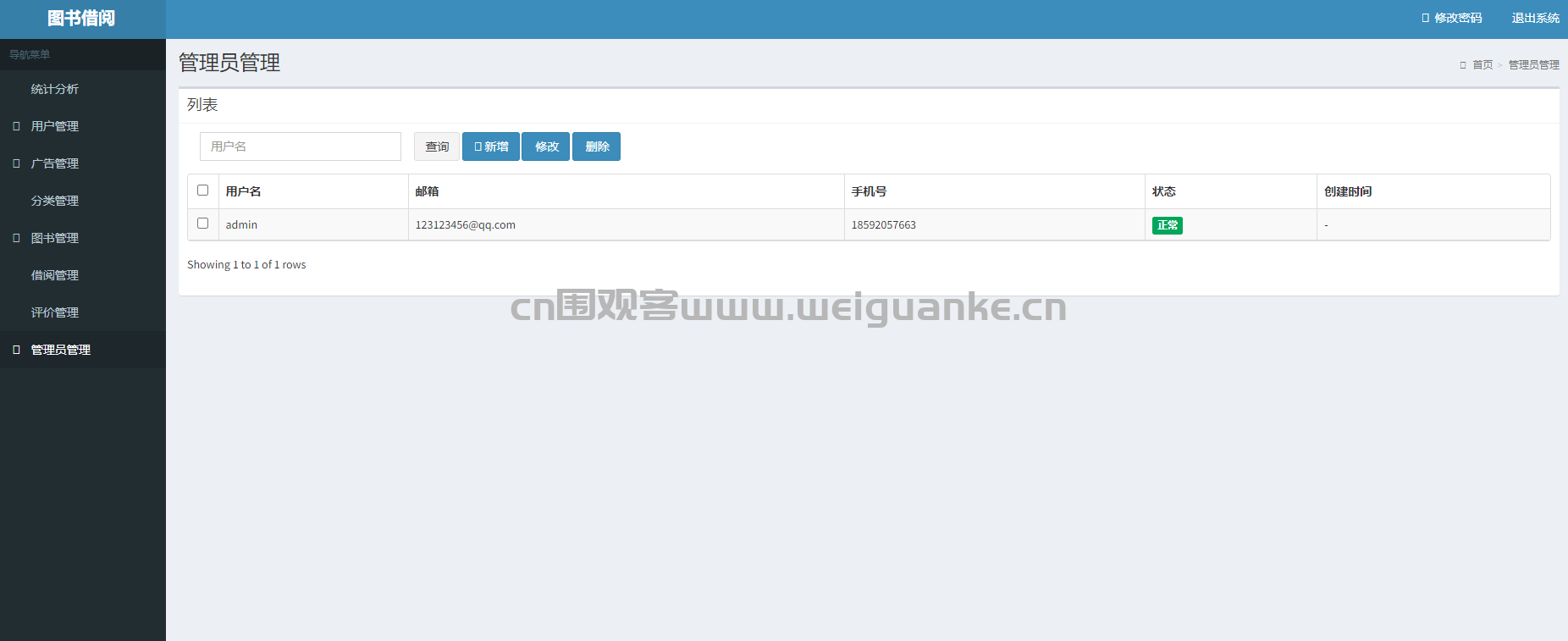管理员管理:列出管理员用户名、邮箱、手机号与账号状态。