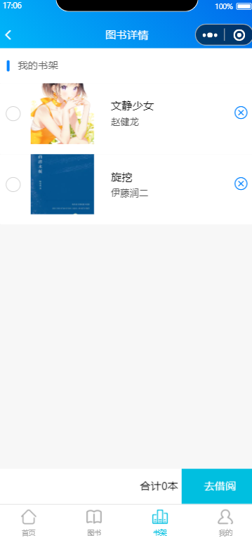 图书:分类与关键词检索图书,进入详情可点击“去借阅”。