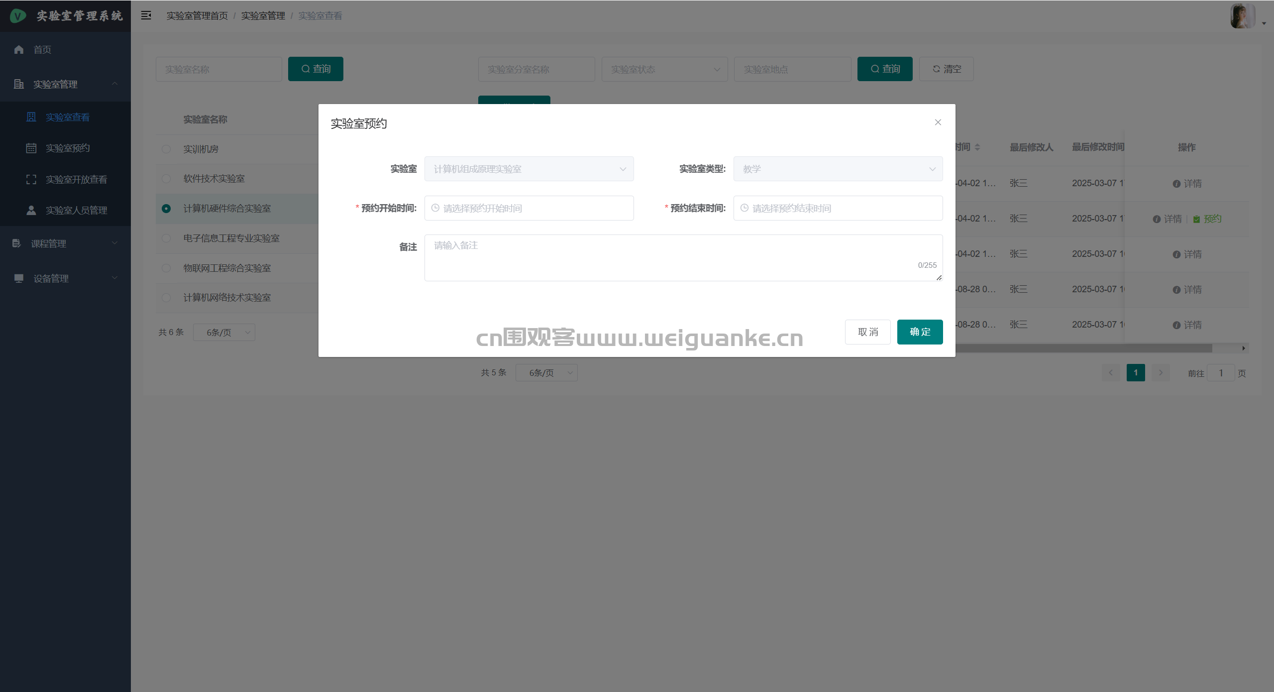 – 实验室预约:为授课或科研预约实验室,可重复预约整学期,支持预约变更。