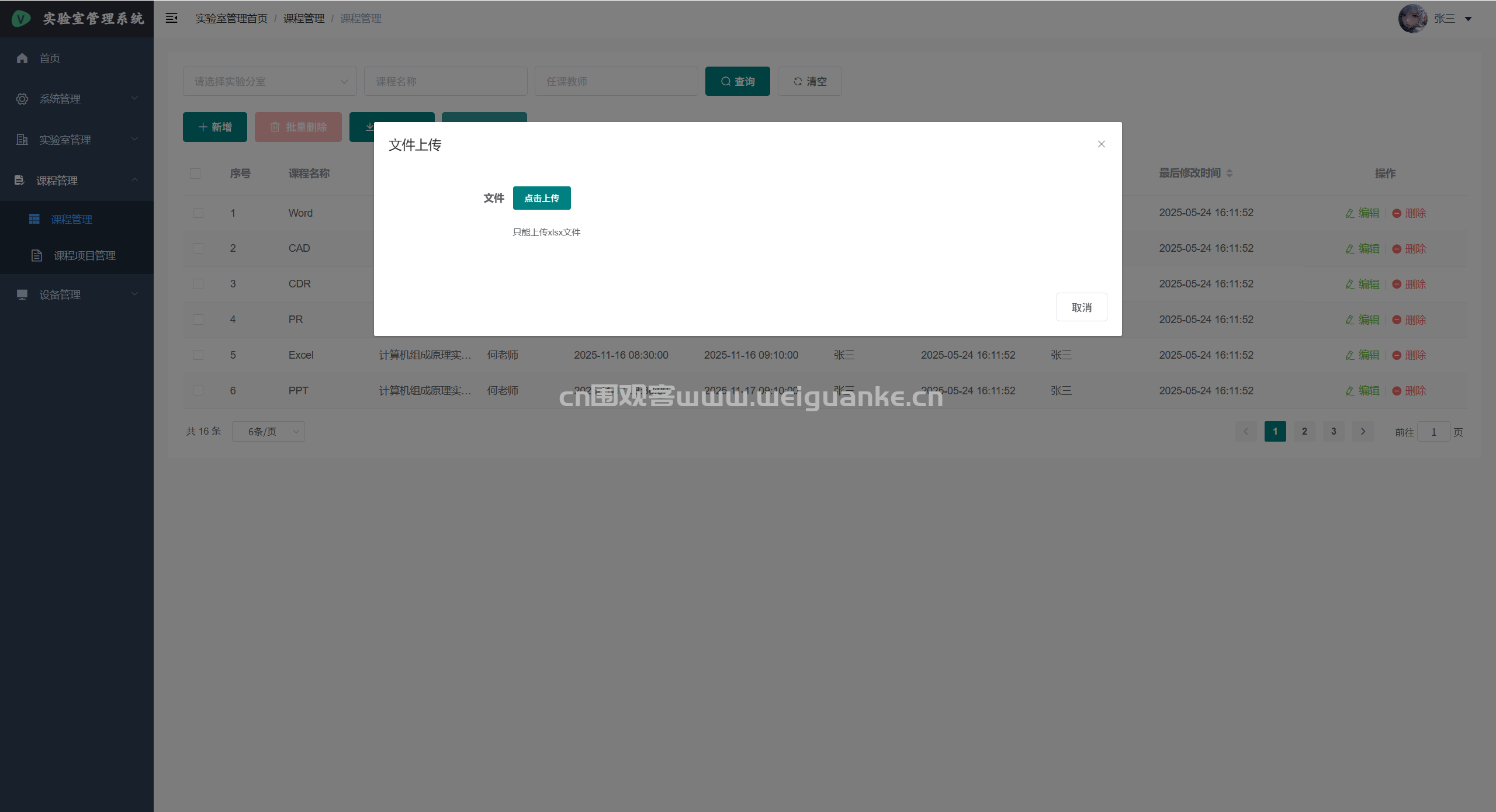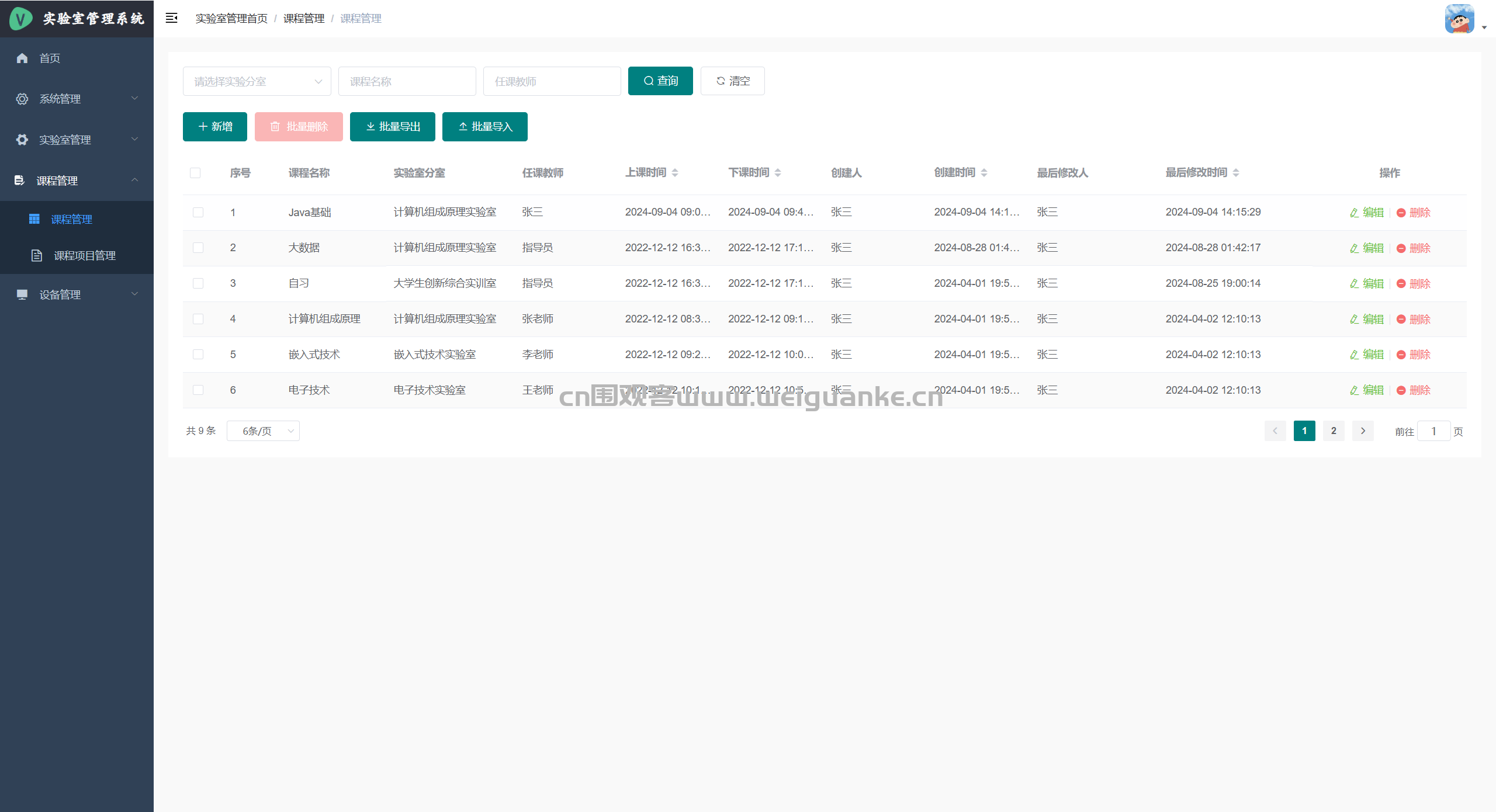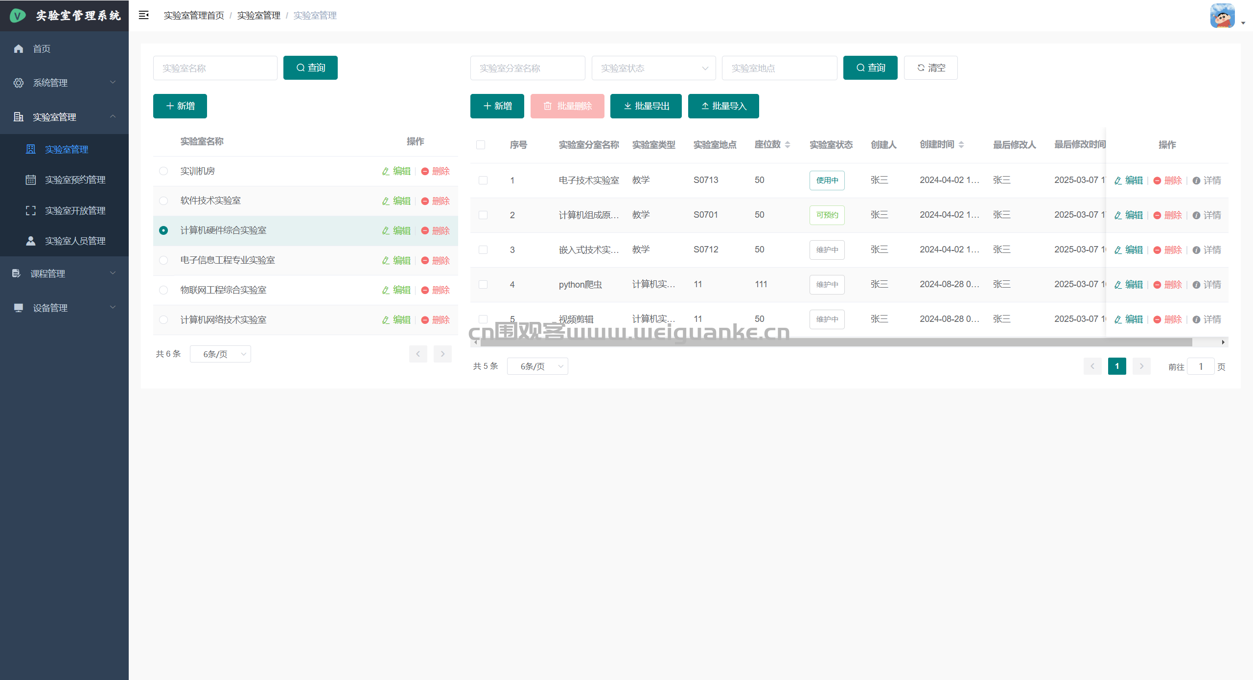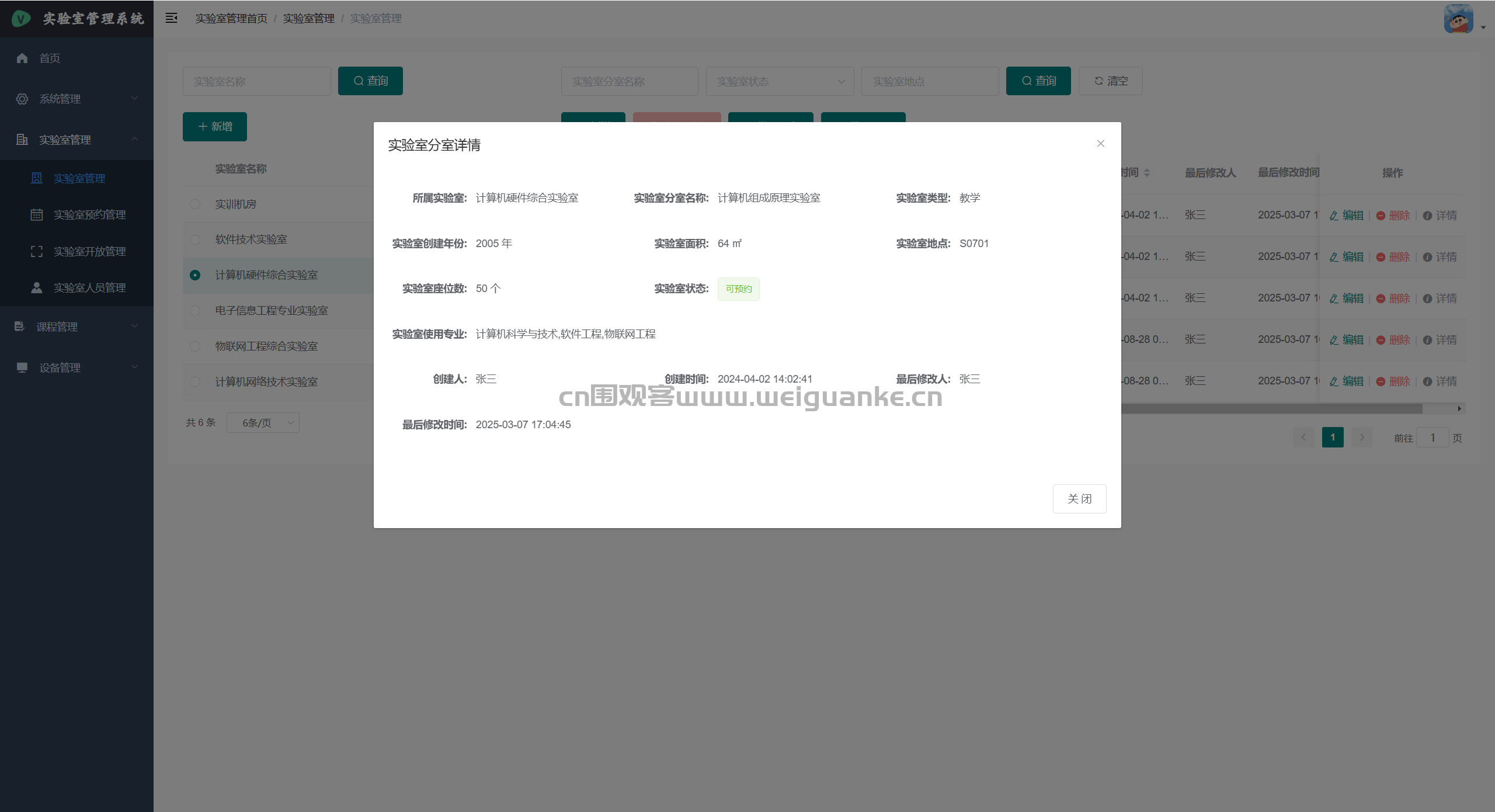 – 课程管理:新建、编辑、删除学期课程;关联实验室、任课教师、学生名单。