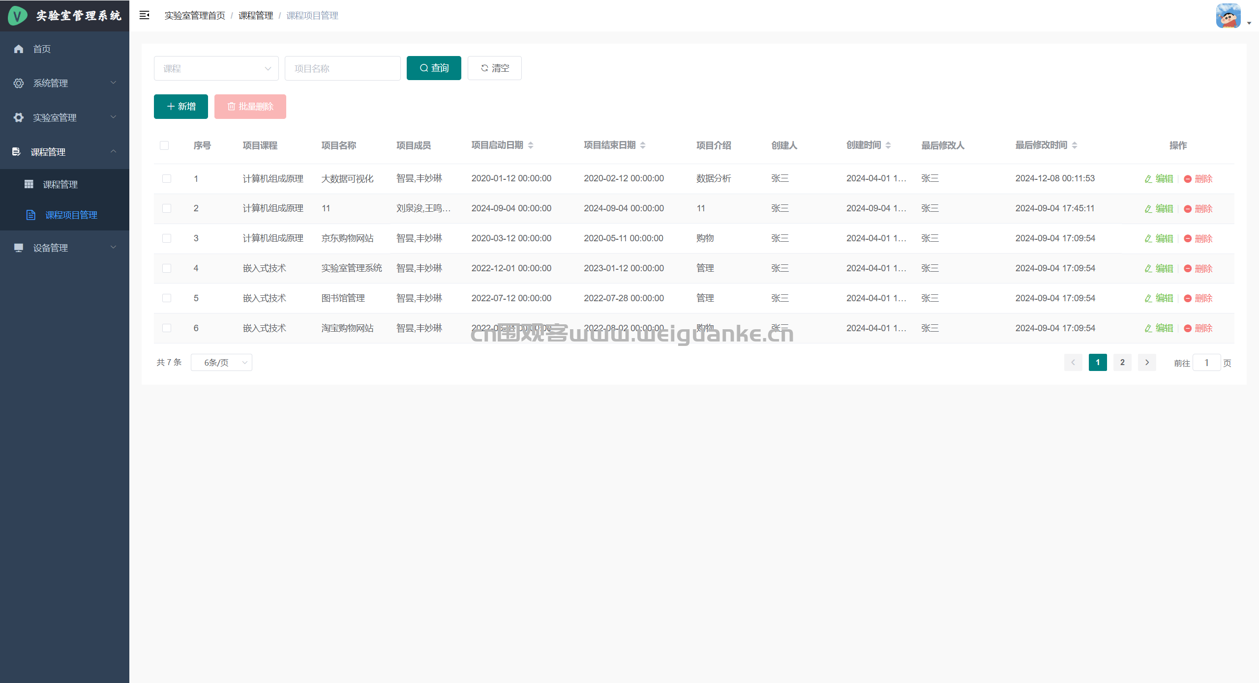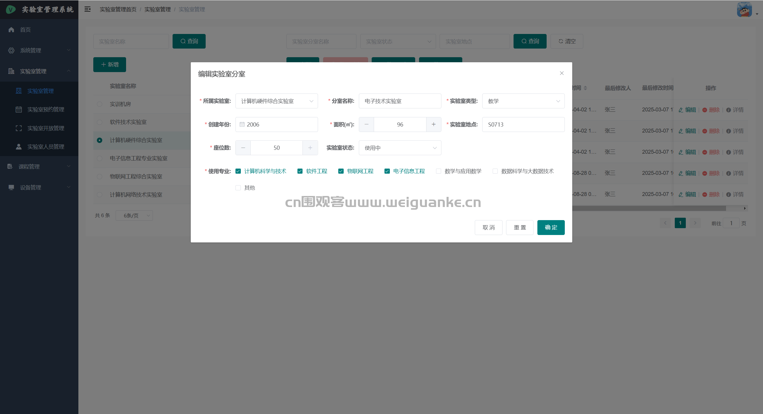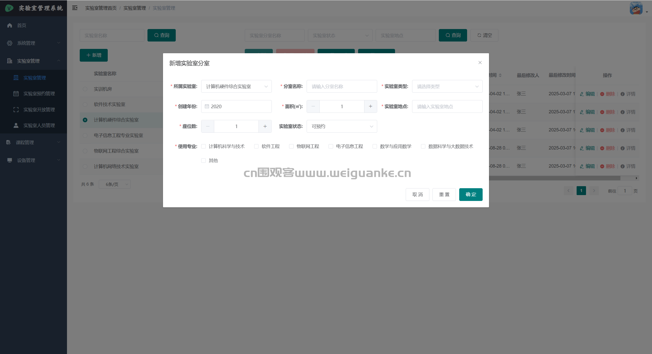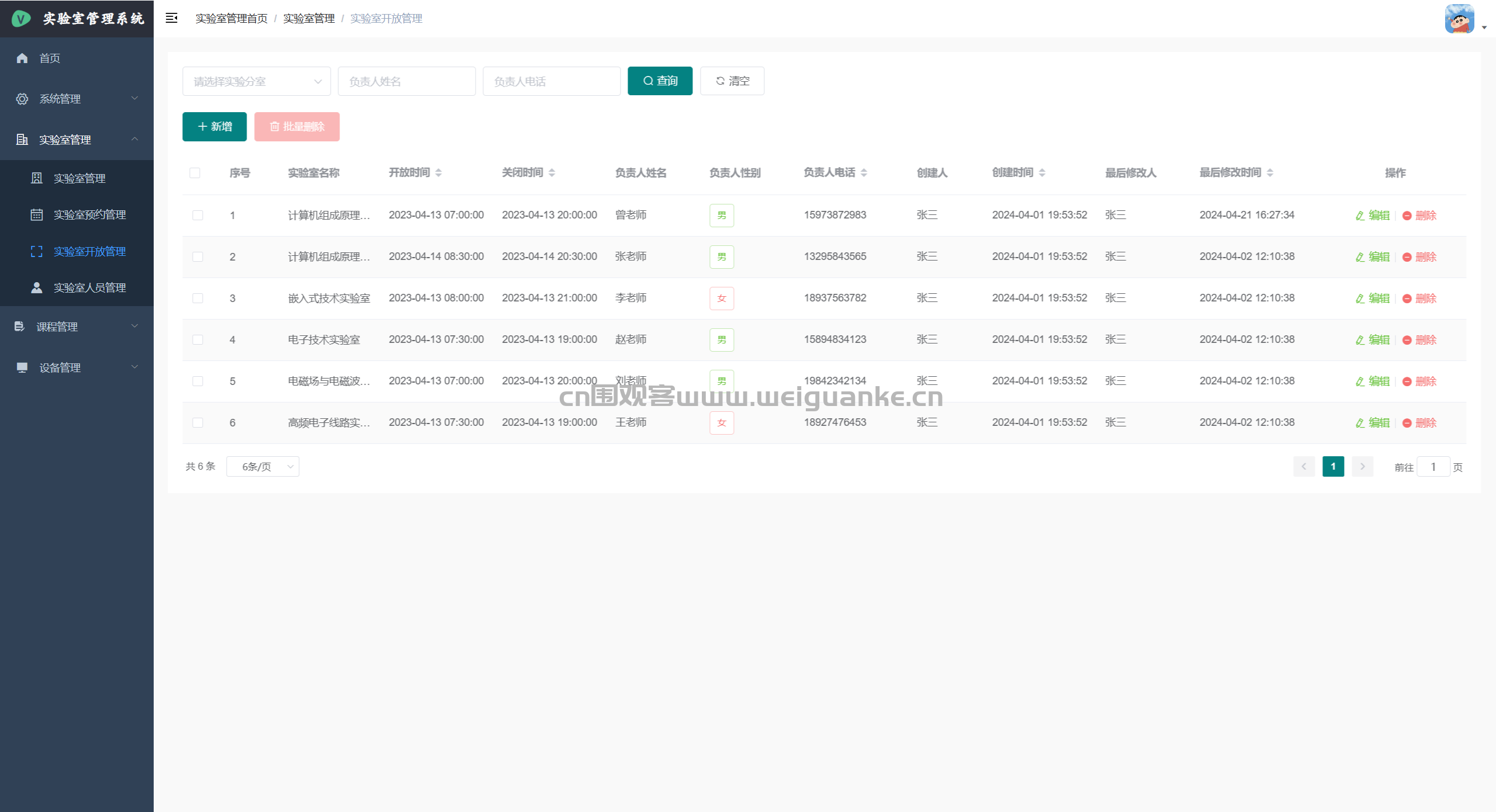 – 课程管理:新建、编辑、删除学期课程;关联实验室、任课教师、学生名单。