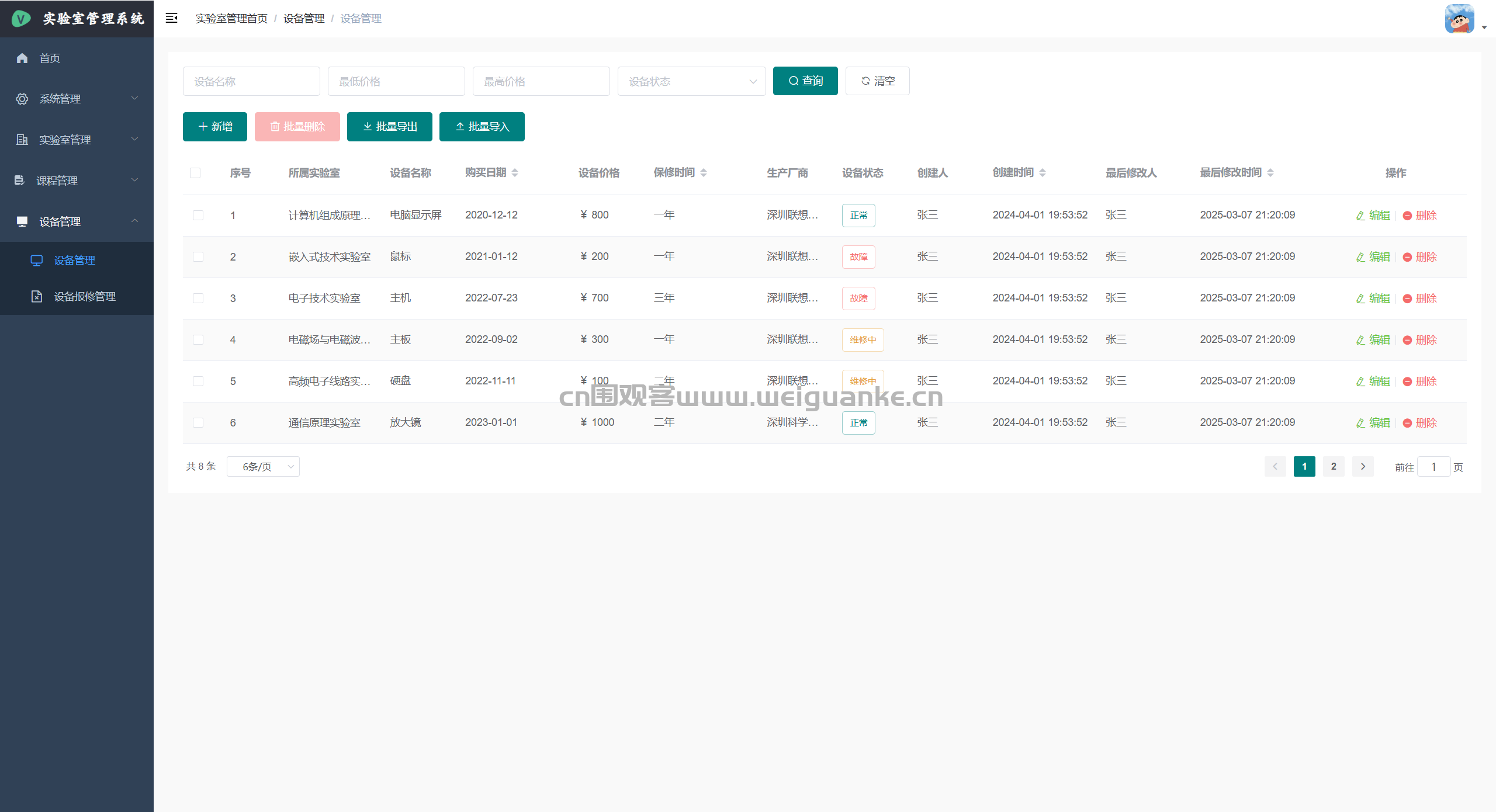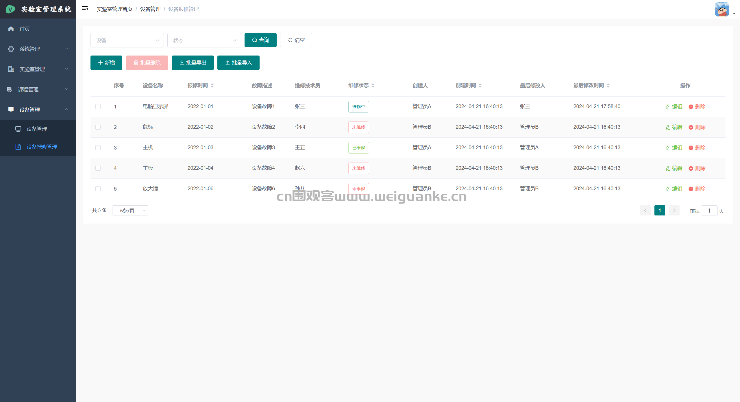 – 设备报修管理:提交报修单,上传故障图片/视频,跟踪维修状态并验收。