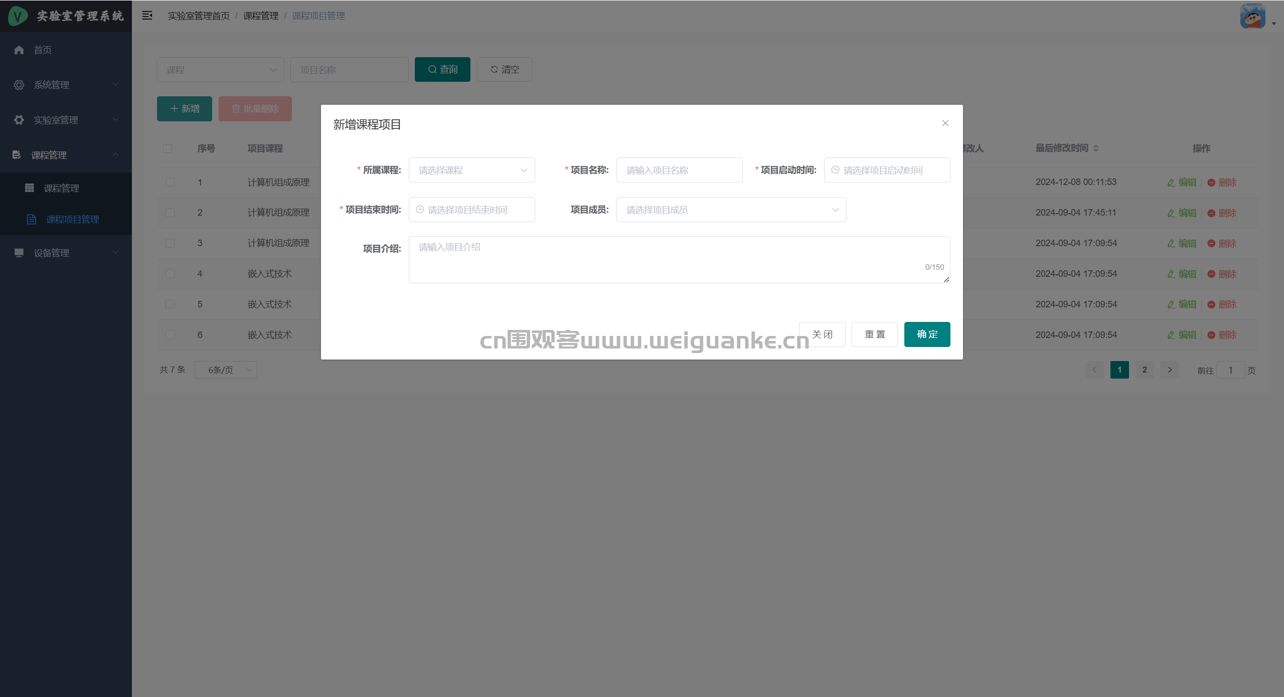 – 课程项目管理:为每门课程新增/编辑实验项目,下发实验指导书,设置报告模板。
