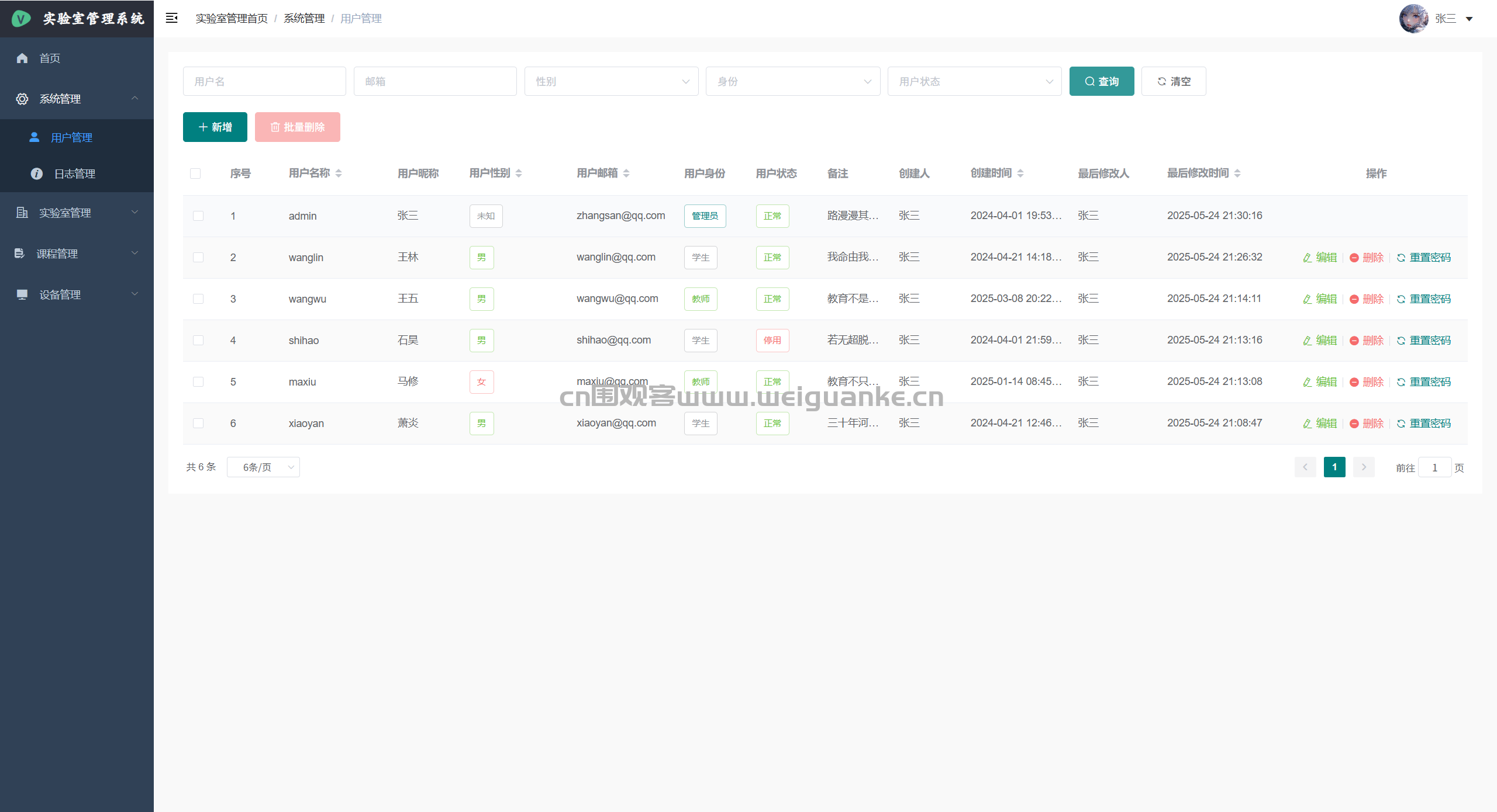 – 用户管理:增删改查全体用户账号,批量导入/导出,重置密码,分配角色。