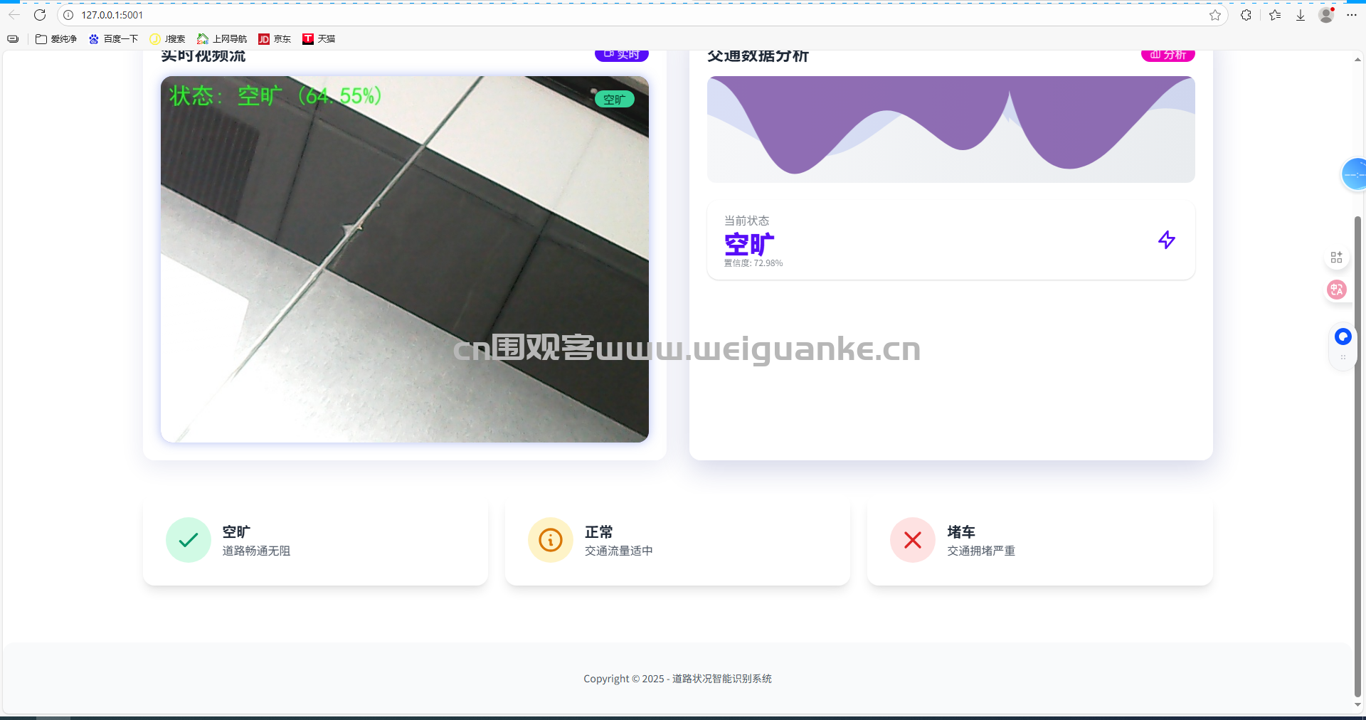 zhe, zhuo python 5天前 基于CNN的道路状况智能识别系统 项目描述 基于CNN的道路状况智能识别系统 项目功能: 摄像头识别当前道路状况是空旷还是正常还是拥堵 运行环境 开发工具:PyCharm 运行环境:python3.8 此配置为本人调试所用,仅供参考 项目技术: 后端:flask 模型:CNN 以上系统源码经过技术整理与调试,确保能正常运行