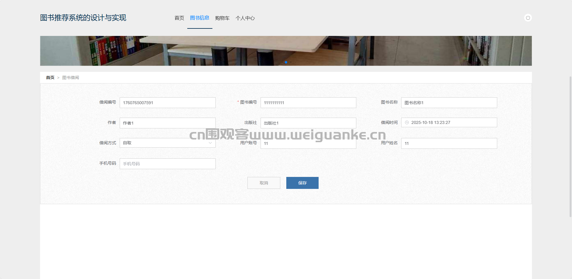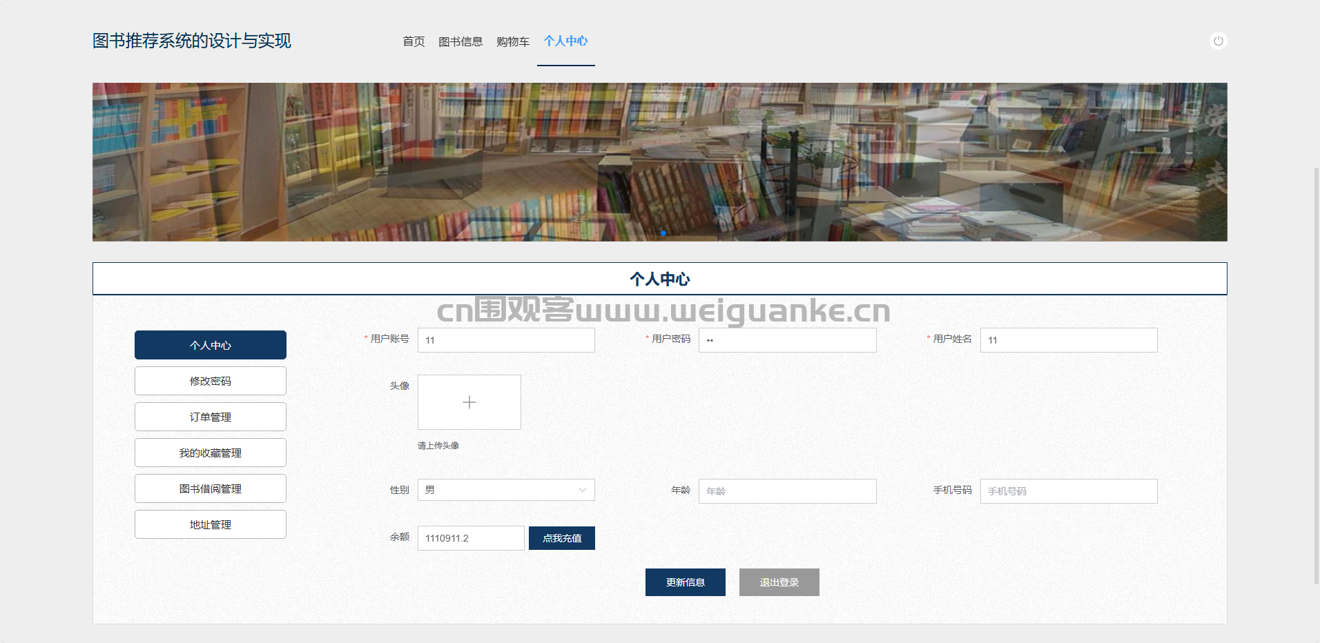 个人中心:查看/修改本人资料、余额、借阅状态。