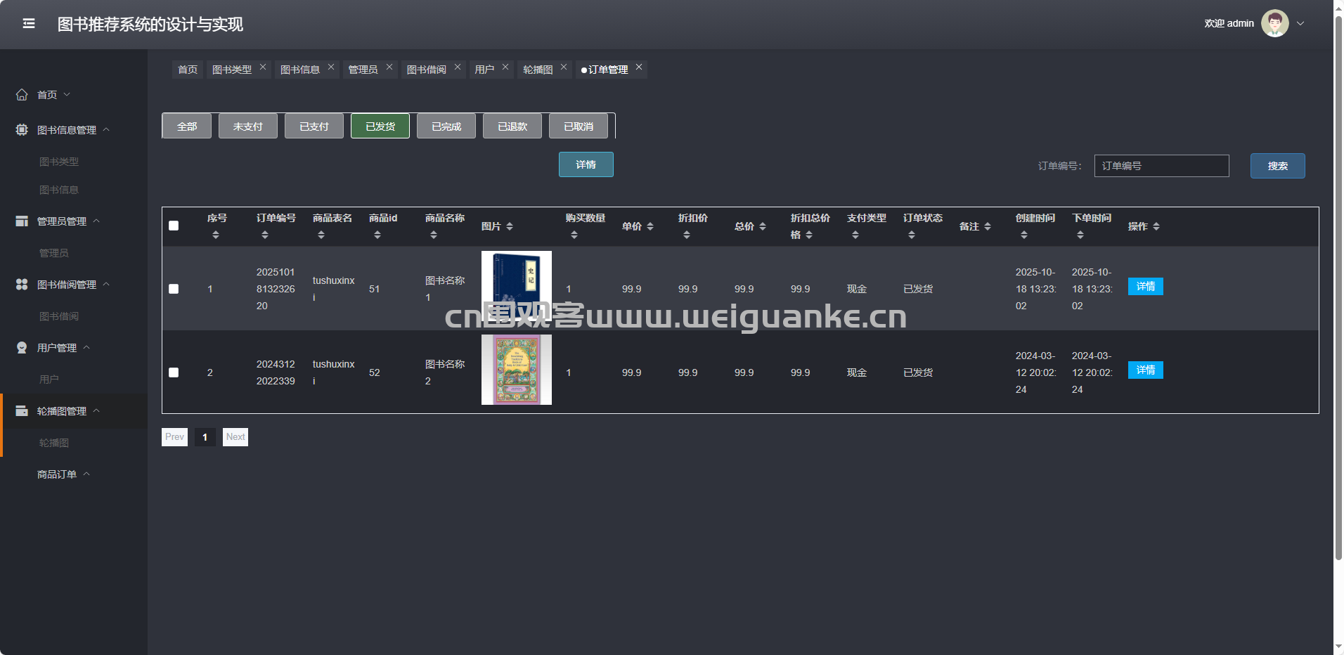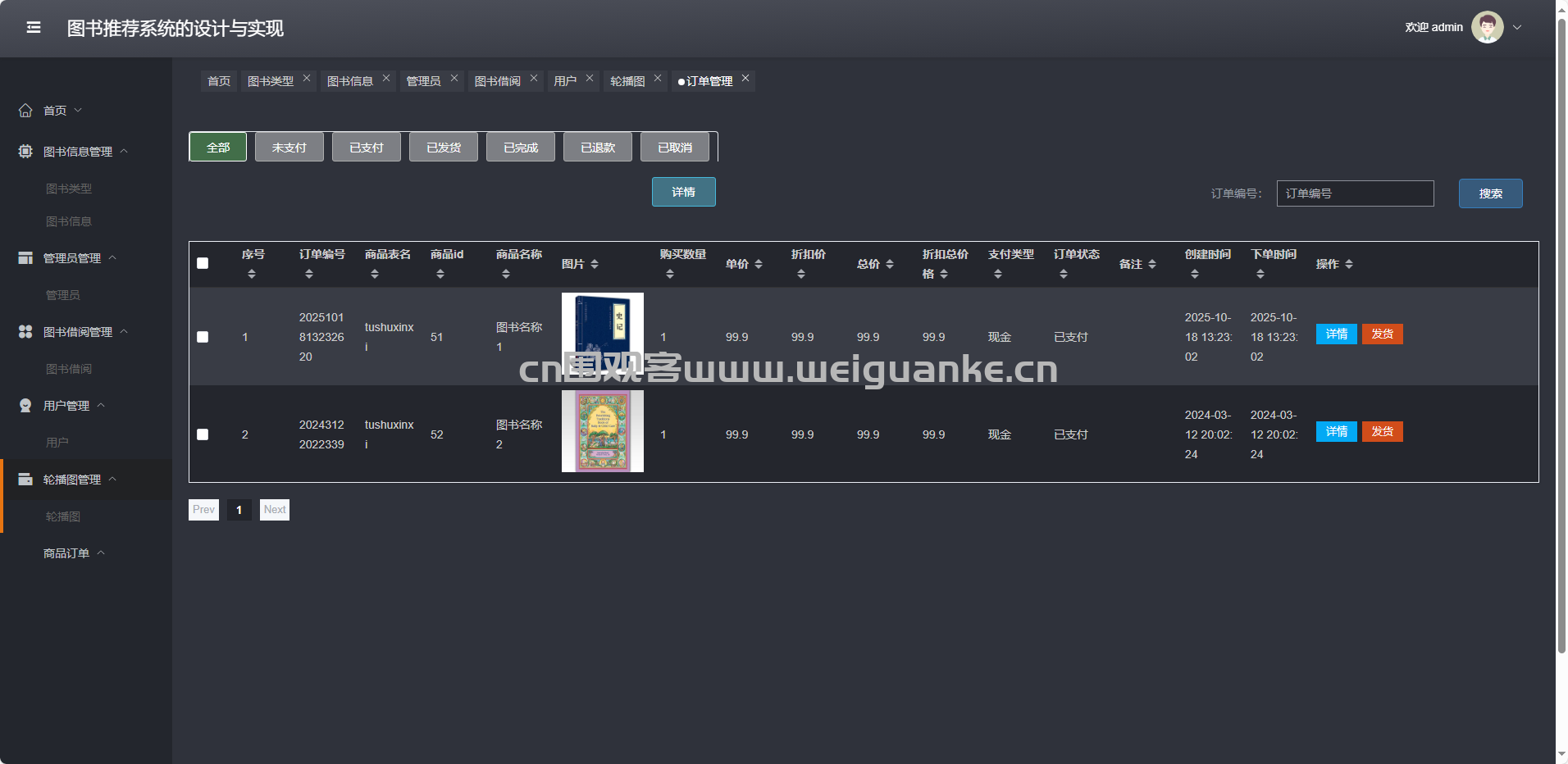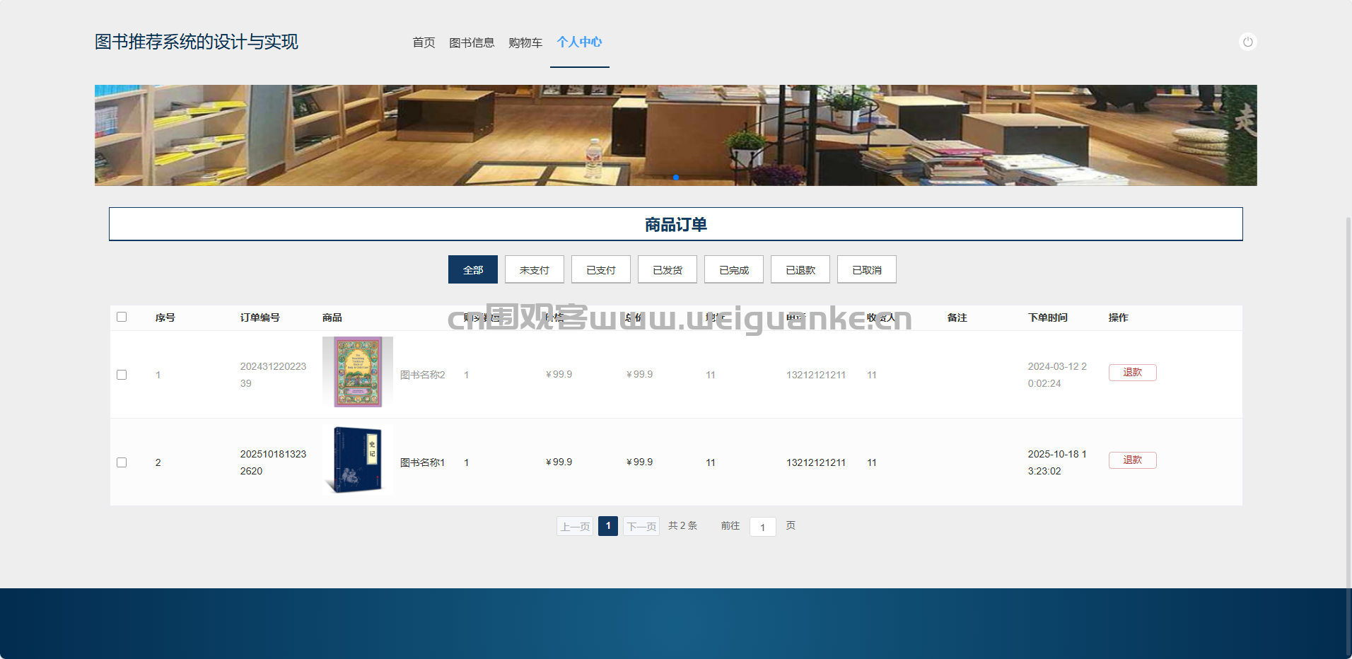 商品订单:查询、发货、退款、删除各状态订单(全部/未支付/已支付/已发货/已完成/已退款/已取消)。