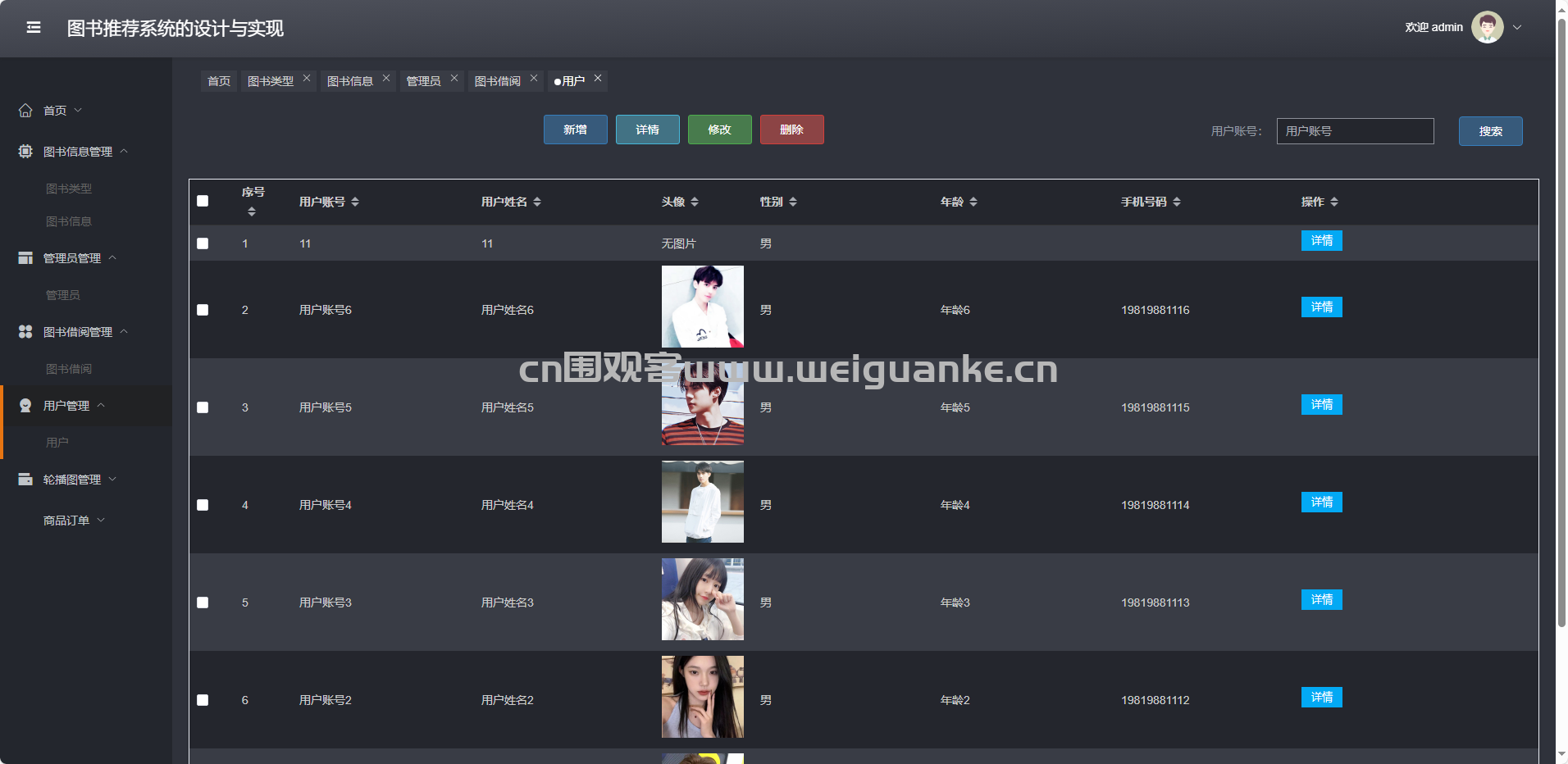 用户管理:增删改查读者账号,启用/禁用。